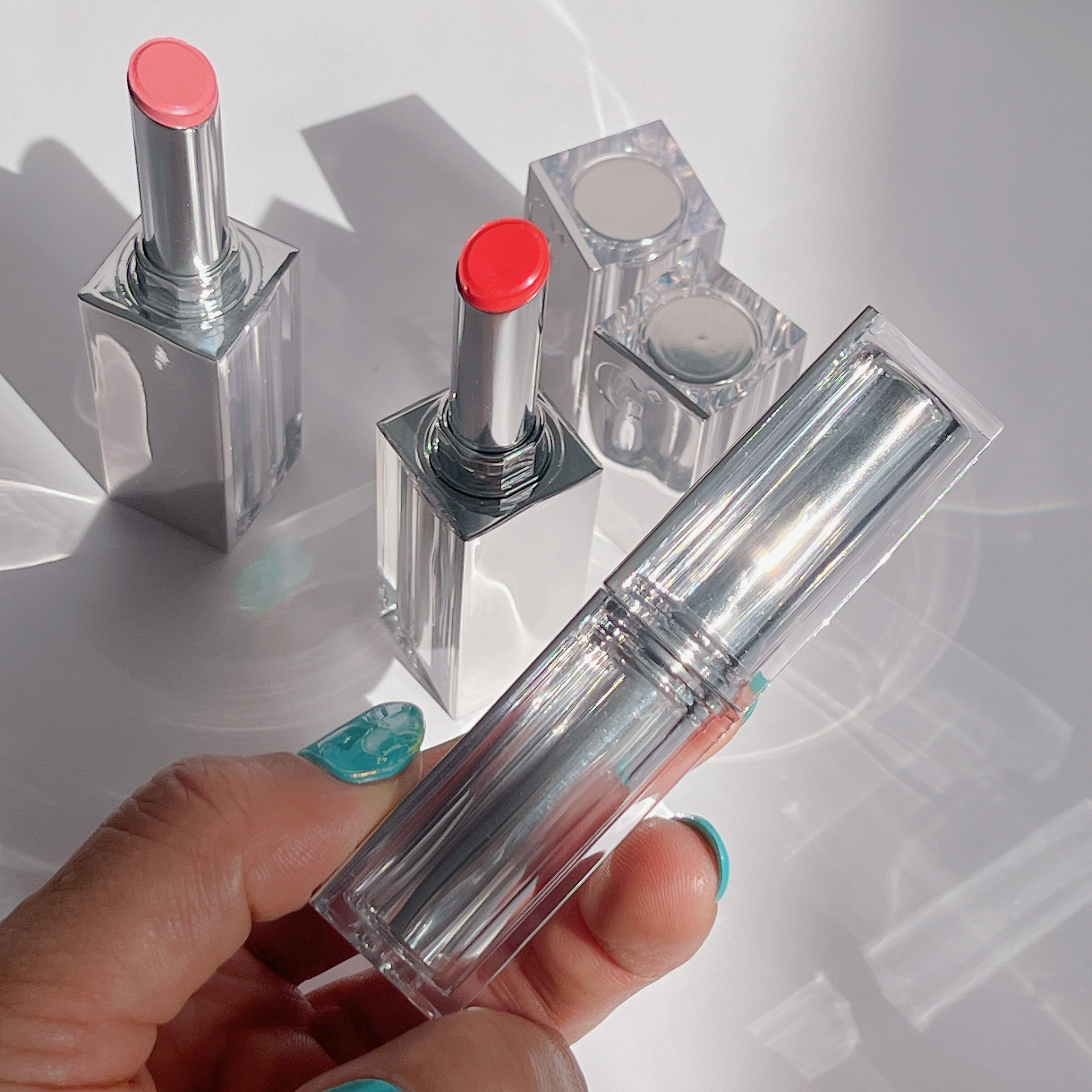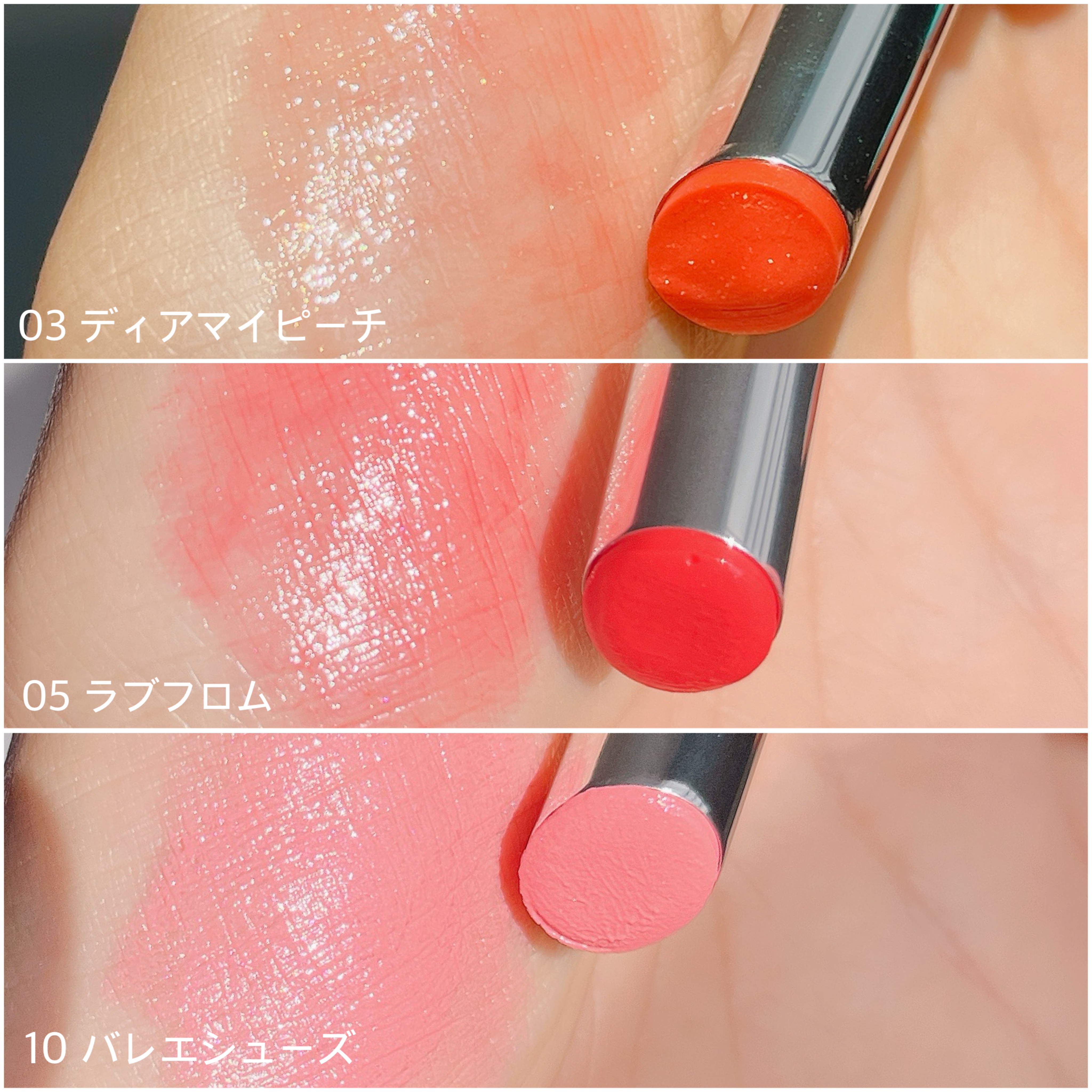 しっとり滑らかな塗り心地でリップバームなので保湿も◎ 持続性はないものの発色抜群で一気に華やかな顔にしてくれるよ🤲 透け感のあるピンクコーラルで3つの中で1番使いやすいカラー🧡 難しいカラーと思ってたけど偏光ラメ?っぽいのが入っててめちゃくちゃ可愛かった😍1番のお気に入りー!!