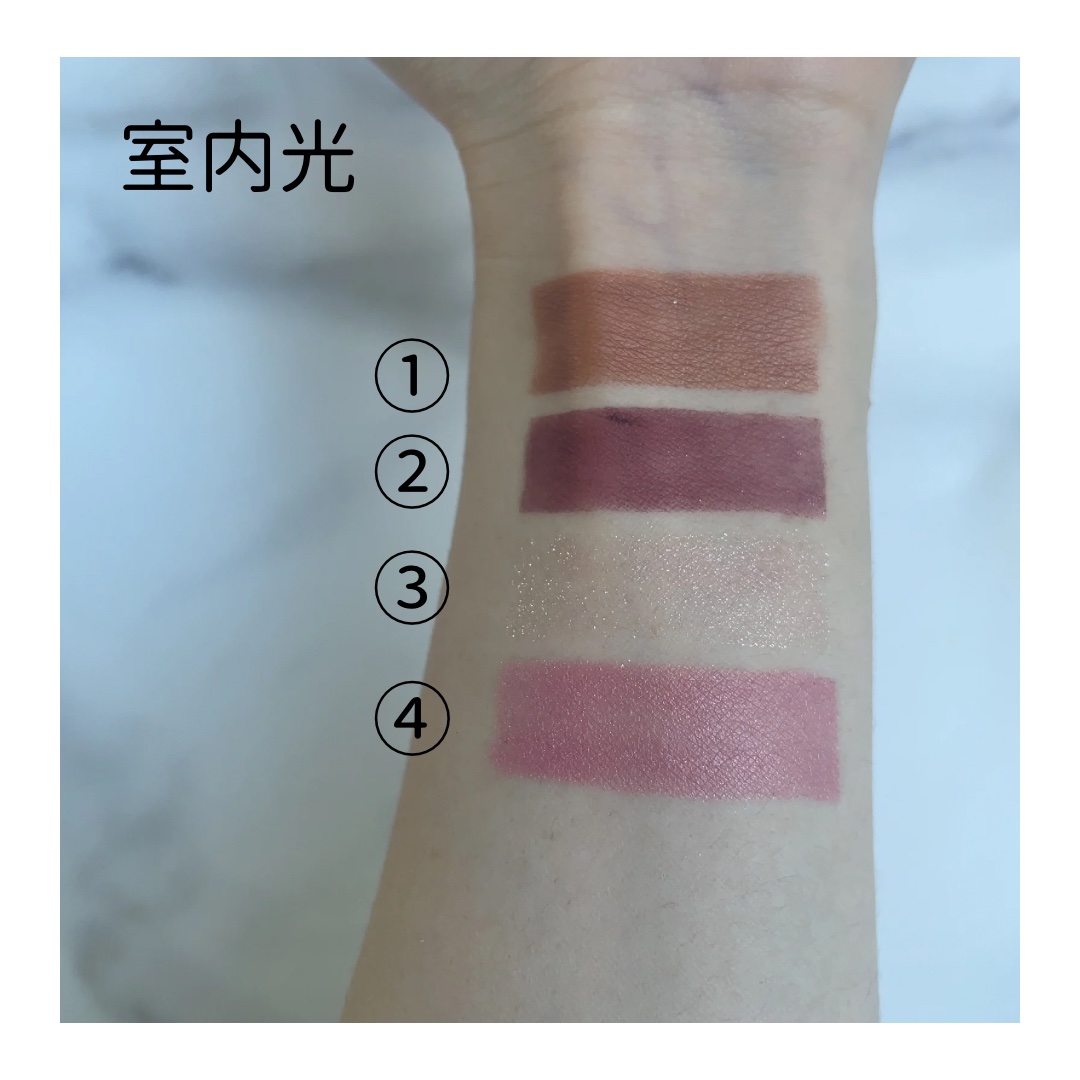 ツヤと血色感、両方手に入る欲張りチーク✨ 粘度が低い液体で、サッと滑らせるだけでも綺麗につきます(スウォッチは指で3回伸ばした) 指で伸ばしてから境目をぽんぽんするだけでも良いですが、スポンジで丁寧に馴染ませるとより自然な仕上がりに✨ スウォッチはピーチピンク&ゴールデンシマーのゴールドパールが目立ちますが、少量頬につけて馴染ませると意外とキラキラした感じがなくて艶に見えます👀 ブルベなので、ソフトライラック1本だけでも良かったんですが、青みが少ないアイメイクをする時はモーヴピンクを使うことも ピーチピンク&ゴールデンシマーはゴールドパールが入っているのでマットのアイシャドウとの相性はちょっと微妙、下2色はどんな質感のアイシャドウとも相性が良いかと思います このリキッドチークは色展開も豊富で購入する時迷いましたが(3/12現在で9色)、モーヴピンクかソフトライラックが失敗が少ないかもしれません