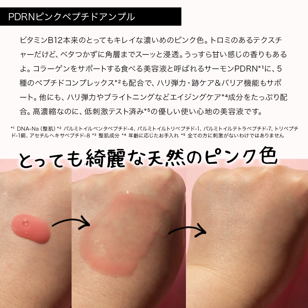 - 韓国の美容の専門機関からのアイデアを得て、サーモン由来成分PDRN(*1)と5種のペプチド(*1)成分を配合したピンク色の美容液です。 PDRN成分は肌のくすみ(*2)など、整肌ケアにおすすめの話題の美容液です。 5種のペプチド(*1)成分は、乾燥などの外部の刺激でゆらぎがちな肌のバリア機能をサポートして、肌を健やかに保ちます。 *1. 整肌・保湿成分 *2. 古い角質、汚れによるもの
