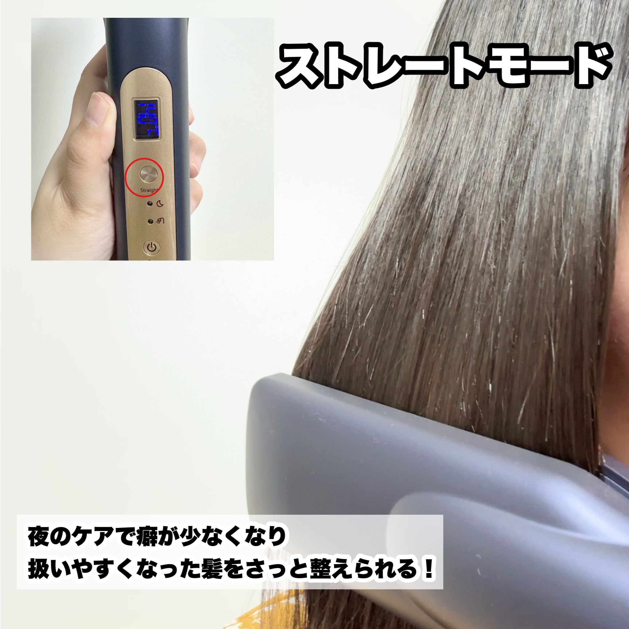 - ヘアドライ後のワンステップで、朝が、髪の質感が変わる。 辿り着いた新習慣「夜アイロン」 ヤーマン独自の低温×超音波テクノロジーで夜のうちに、髪の浸透補修をサポートしながら毛流れを整える。“髪にも美顔器”発想で誕生した、ヘアケアの新習慣「夜アイロン」。 朝が、髪の質感が変わる新習慣「夜アイロン」 スタイリング、湿気、洗髪、ブラッシング… 生活の中で受ける髪ダメージは意外と多いもの。 また、ドライヤーだけで取り切れないクセがあると感じる方は、 なんと約80%※も。 そんなお悩みに応え、 1台で浸透補修×クセ伸ばしをサポートするのが夜アイロン。 ヘアドライ後の仕込みケアで、扱いやすい髪へ。 一日の終わりに、受けた髪ダメージをケアし、 ヘアドライ後の毛流れを整える。 新習慣「夜アイロン」を始めませんか? ※「ヘアケアに関する調査」調査手法:インターネットリサーチ 調査期間:2024年3月15日~3月21日 対象者:全国20-50代女性。髪悩みあり・ヘアケア関心層かつヘアドライを行う方(n=360) ■製品仕様 定格電源:DC12V 4.0A 消費電力:充電時15W、アダプタ駆動時40W サイズ:約50mm×51mm×295mm( W×D×H) 質量:約485g 設定温度: ディープトリートメントモード 50℃ ナイトリペアモード 90℃ ストレートモード 140℃~180 ℃( 20℃刻みの3段階) 材質: PPS+GF、PA+GF、PET+GF、ポリカーボネート、ABS樹脂、ステンレス、アルミ、シリコン 付属品: ストラップ 1個 A Cアダプター 1個 取扱説明書( 保証書付) 型番:YJHB4L