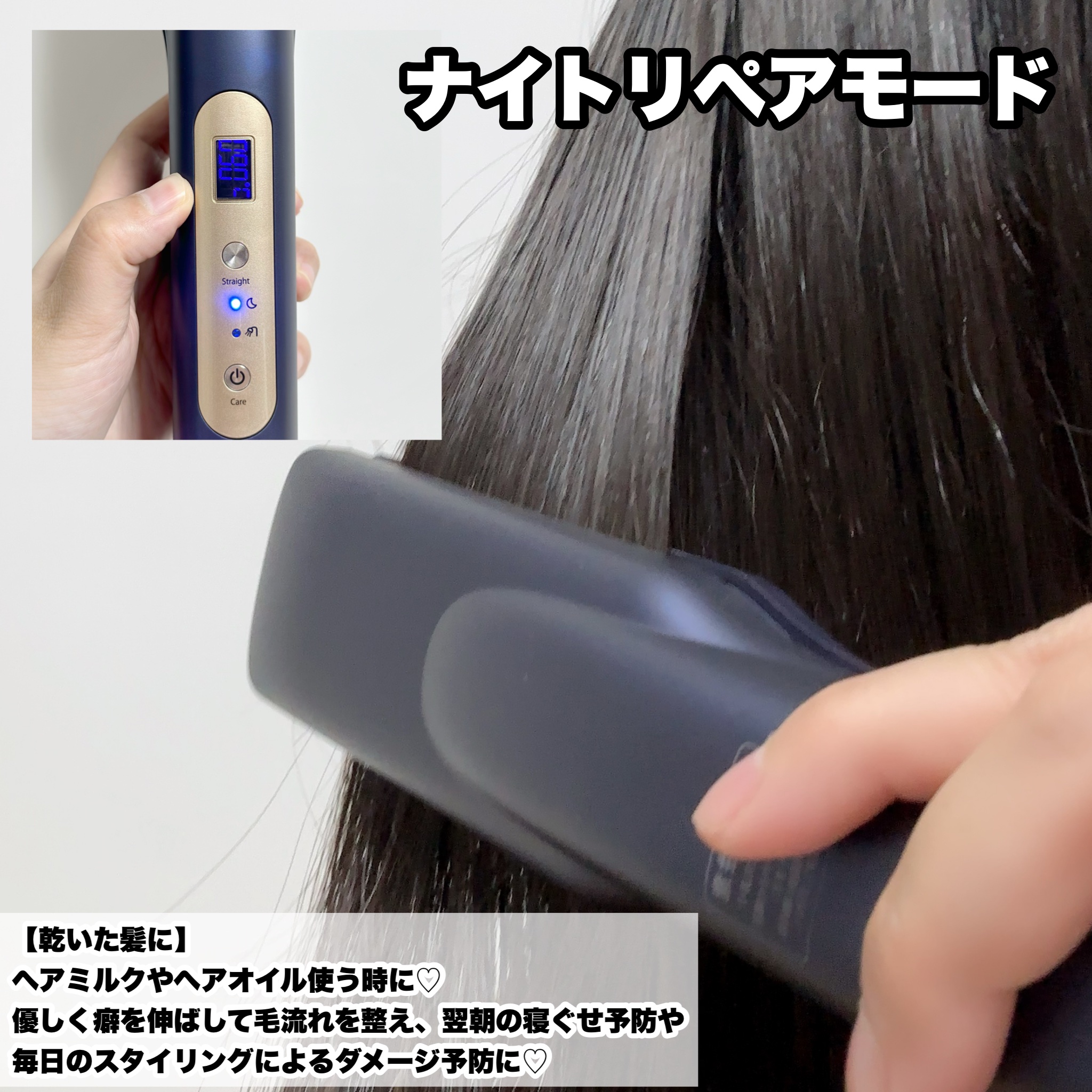 髪がパサパサ、整ってないとそれだけで老け見えしちゃう… 髪が綺麗なだけで清潔感あるように見えるし年齢関係なく垢抜けて見えるポイントだよ☝🏻 ナイトリペアアイロンで翌朝のためのケア「夜アイロン」でお家で髪質改善*がオススメ🌃 毎秒約100万回の超音波振動の力でトリートメントや補修成分を細かくし毛髪内部へ叩き込む!