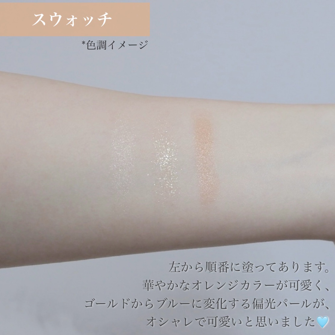 高輝度偏光パール×大粒グリッターを贅沢に配合した3色セットのアイカラー。角度によって色と輝きが変化する偏光パールが目元に魅力的な輝きを与えます! グリッターカラーがすごく可愛くてまぶた全体に塗ってもギラギラし過ぎない💫 パッケージはコンパクトでスリムなデザインでふた部分も水面のような立体感があり美しい💗
