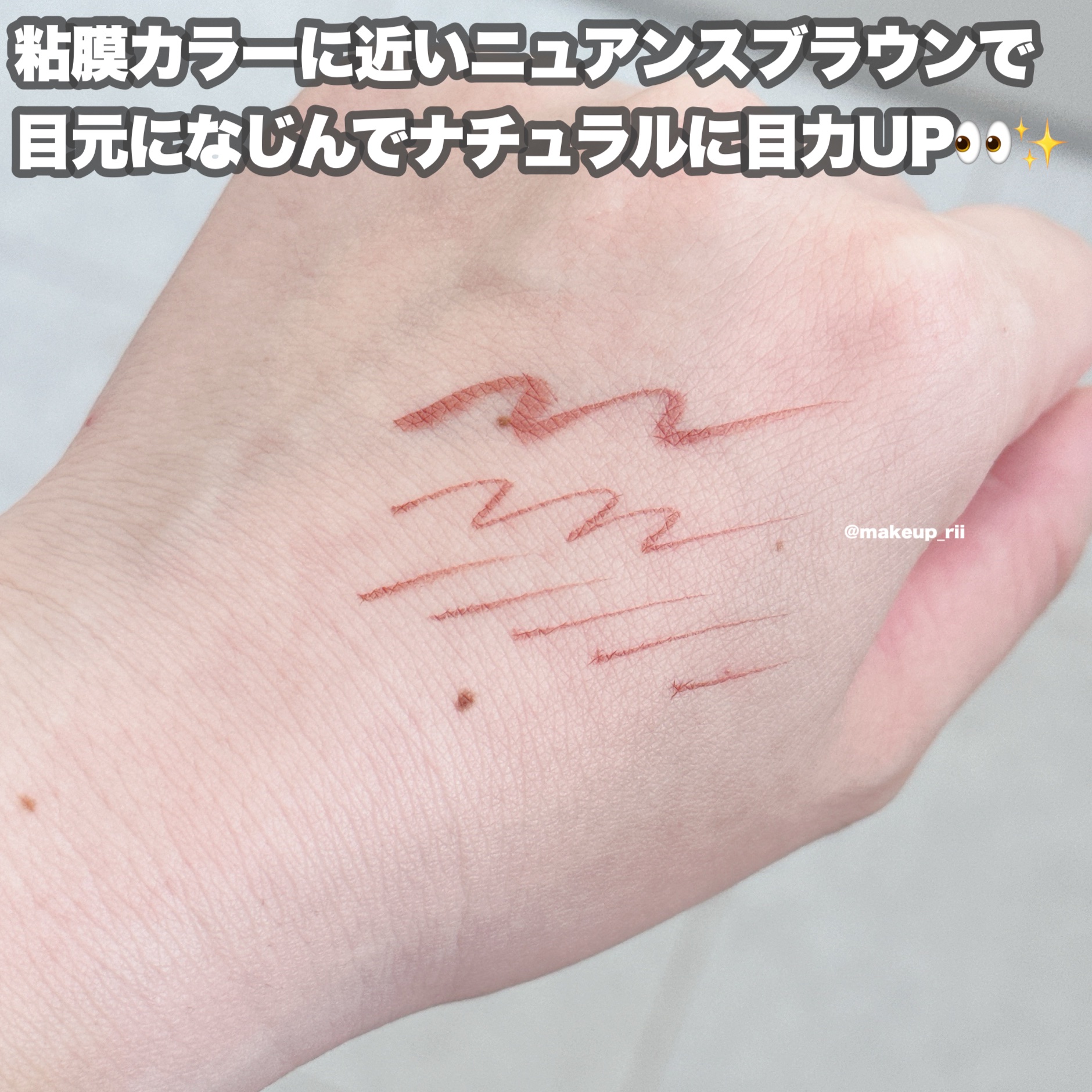 - 筆先までずっとなめらか、目尻で感動するリキッドアイライナー。 必要な量が肌にのる新設計で、まぶたの上をすべるような、滑らかな描き心地。しなやかでコシのある筆が、筆圧のコントロールを容易にし、太いラインも細いラインも思い通りに仕上げます。水、汗、涙に強いウォータープルーフタイプなのに、通常洗顔で簡単オフ。肌に色素が残らない顔料を使用。5種類の美容液成分を従来品の200%配合し、メイクしながら目元ケアまで。 ●ブラウンブラック ※2020年9月12日 バラエティショップ先行発売 ●漆黒ブラック ※2020年12月頃発売予定 ●ナチュラルブラウン ※2020年12月頃発売予定 ●シフォンブラウン 「毎日メイクに透明感と抜け感」 ブラウンでも、グレーでも、ベージュでもないニュアンスカラー。 自然な印影で素の目元を際立て、頑張りすぎない、ふんわりとした目元に。 ●アプリコットブラウン 「じゅわっと血色感。 肌に馴染むおしゃれカラー」 温かみのあるアプリコットがじゅわっと滲む血色感を目元に演出。 肌馴染みが良いので、カラーライナーに抵抗がある方もブラウンの延長線上で楽しめる、使いやすい色味です。 ”ちょっとオシャレ”な空気感を演出するカラー。 ●ピンクショコラ アイライナー 「ピンクが溶け込む濃厚ブラウン」 肌馴染みが良く、目元にじんわり血色感をプラス。 さりげなく女性らしさが加速するようなカラー。 ●ピスタチオラテ (2022年7月29日(金)発売) 「“目尻”に抜け感アクセント」 肌に馴染むのに映える絶妙なグリーン。 トレンドカラーに“くすみ”と“抜け感”をプラスしたまろやかな発色。 ●マスタードブラウン 「“イエロー”が揺れる、大人の洒落色」 (2022年7月29日(金)発売) まるで太陽のような暖かさを感じる新しいブラウン。 ほんのり感じるイエローでメイクが一気に垢抜ける稀有な色。 ●シフォンピンク(2023年2月10日発売) 「ふんわり柔らか"まろみピンク"」 甘くなりすぎない青みニュアンスで目元の透明感UP。 目元を引き締め、ピンクメイクにありがちな腫れぼったさを解消。 ●ミルクカプチーノ(2023年4月21日発売) まろやかな深みの“優しい締め色” どんなメイクにも合わせやすいカラー。 自然な陰影でさりげなく目幅を拡張します。 ●グレーカシミア(2023年10月1日発売) ブラウンがほんのり溶け込んだ、暖色グレー まろやかな発色で、パーソナルカラーを問わず肌に馴染む 目元の陰影になりすまし、抜け感と目力を欲張りに叶える ●ダークフィグ(2024年6月1日発売) するする”なめらか。描きやすいのに、落ちにくい。 クッキリ可愛いほの甘ダークブラウン ●ピーチモカ(2024年8月1日発売) ふわっと自然に盛れる“桃色ブラウン” ほんのり血色感で目元にうるみ感を演出 ●スターダストブラウン(2024年12月11日発売) キラッと繊細に輝く''星屑ブラウン'' 透け感のあるダークブラウンの色味とラメの輝きが、目元に艶のある立体感を演出 ●チャコールモカ(2025年4月10日発売) 目元を締める''深みグレージュ'' 黄みや赤みに偏りすぎない絶妙な色設計で、自然に目元を強調