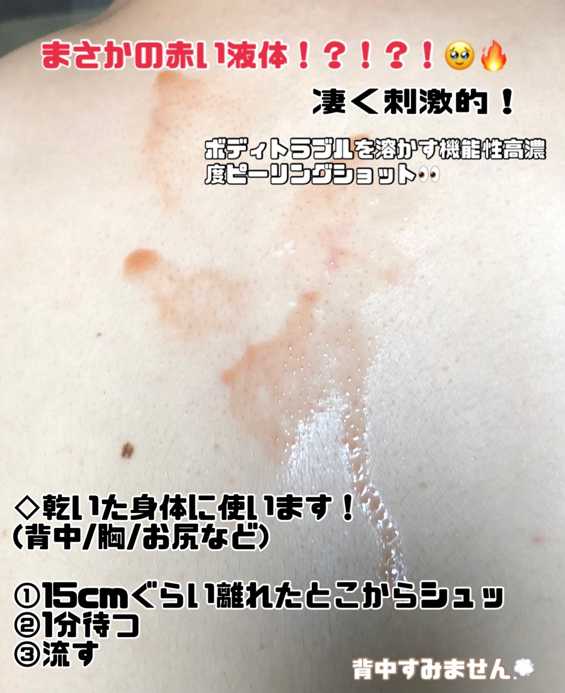ボディのトラブルや過剰な皮脂や角質の悩み、でこぼこした皮膚状態に悩んでいる方向けのピーリングです🥹 赤っぽい液体で(ボルシチみたい)つけて、伸ばして、流すだけです🚿 背中ニキビがたまにできてしまって、予防として何かできないかなと思ってたのでボディのピーリングができるのはすごく嬉しいです!!