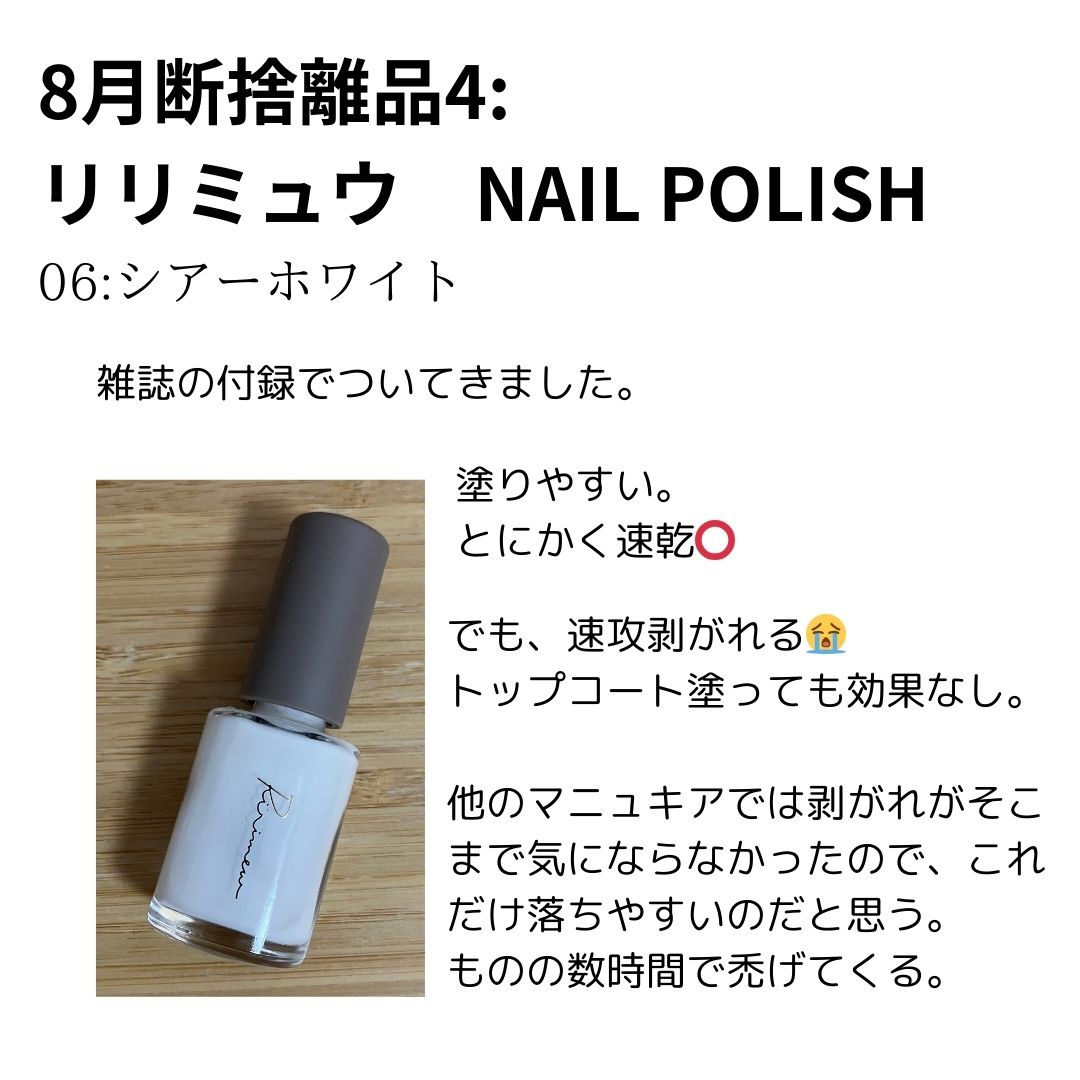 透け感がかなりあるので柔らかいホワイトネイルになります🥰 重ねてつけることで発色も増して、私は三度塗りの透け感と発色がちょうど良くて好み💖 驚いたのが速乾具合!! 今まで使ってきたネイルポリッシュの中で1番乾くの早いって思いました!! サイズ感も小さめでコスパもいいので、他のカラーも買います😍