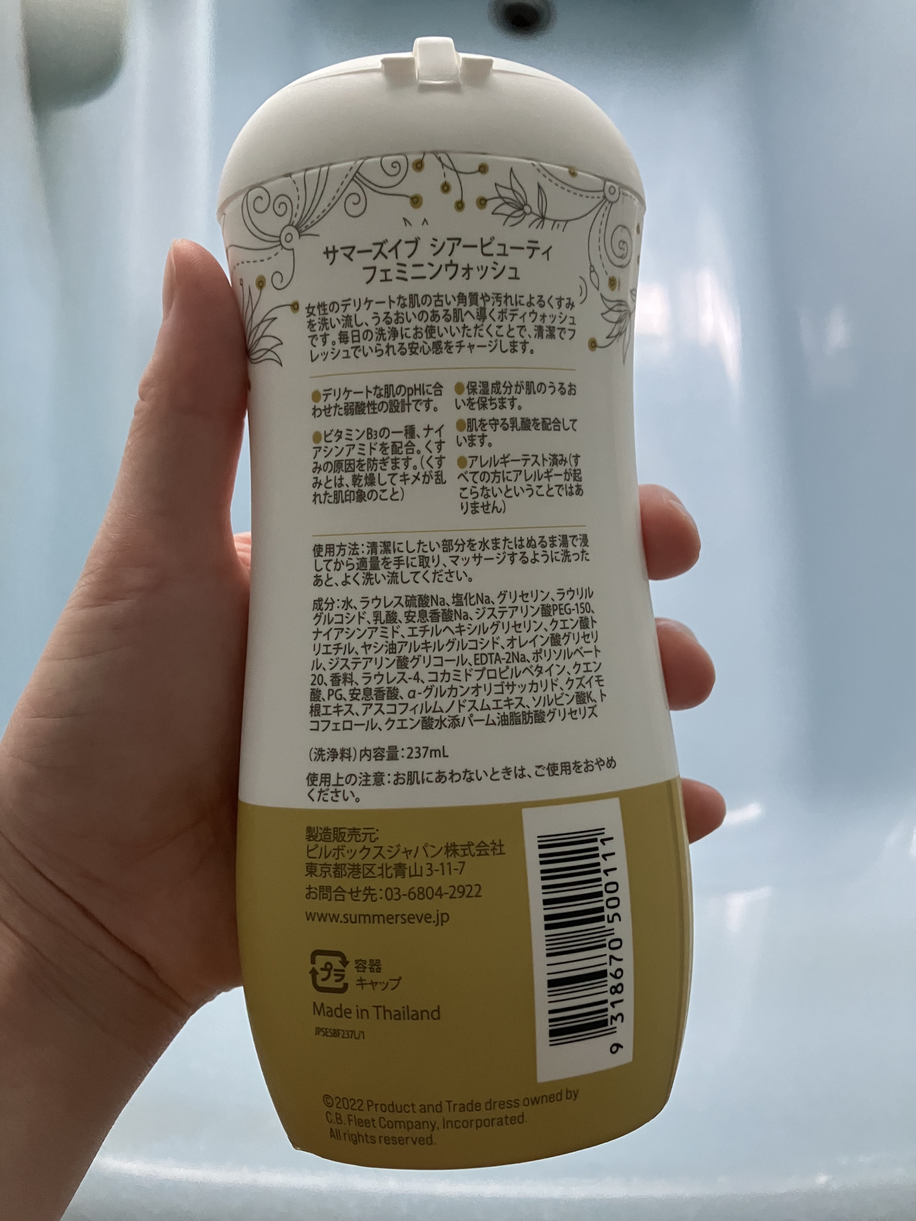 - 肌に優しい使い心地のデリケートゾーン用ボディウォッシュです。 デリケートな肌のphに合わせてつくられた弱酸性設計。 女性のデリケートな肌の古い角質や汚れによるくすみを洗い流し、うるおいのある肌へ導くボディウォッシュです。 デリケートゾーンの黒ずみ*やニオイ*、ムレ、カサツキなどに悩まれている方におすすめです。 * 古い角質や汚れによる 【日米で話題のデリケートゾーンケアブランド】 Summer’s Eve(サマーズイブ)は、アメリカで生まれたデリケートゾーンケアブランドです。 1972年から、フェムテック分野のパイオニアとして、世界30カ国以上で販売しています。日本での販売は2013年から。 アメリカ、日本の両国でデリケートゾーンケアの売上シェア1位*を獲得しました。 *IRI Market Advantageデータ 米国婦人衛生用品ブランド別金額シェア2020年12月調べ(12カ月計) *富士経済「美容家電・化粧雑貨マーケティングトレンドデータ2018」マーケットシェア、デリケートゾーン用洗浄・シート市場、金額ベース、2016年実績 【専門機関による各種テストを実施】 安全性使用テストを発売前にすべての製品で実施 ⑤パッチテスト*:専門機関監修のもと、一定期間使用し、肌にアレルギー症状が出ないかテスト済 ⑥エチケット効果テスト:サマーズイブを使用してエチケット対策の変化に関するテストを実施 *すべての方にアレルギーや刺激が起こらないわけではありません。
