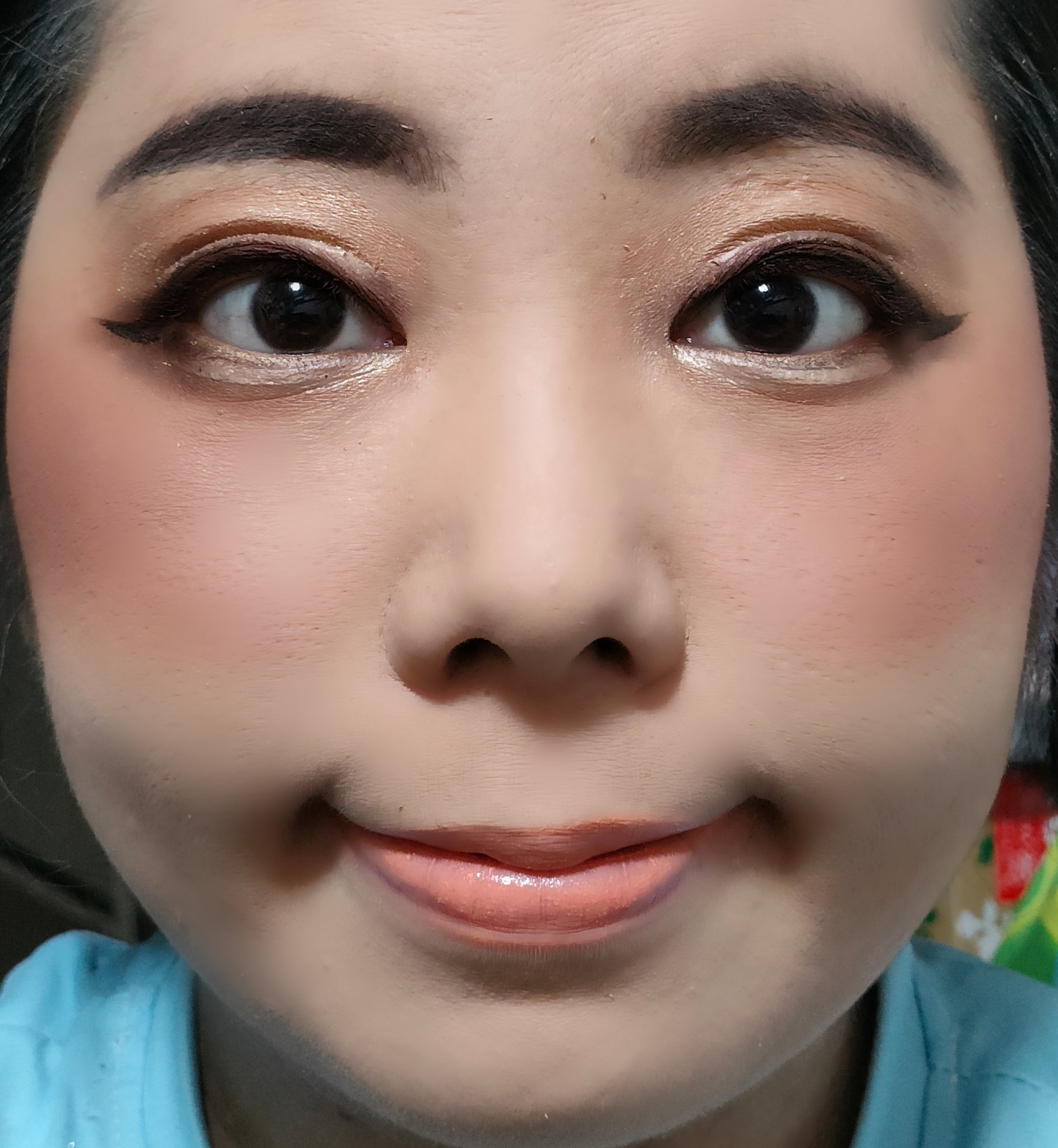 アリィー ニュアンスチェンジUV ジェル RSを、顔全体にまんべんなく塗ります。 RMK RMK ジェルクリーミィファンデーション 103を、顔全体にまんべんなく塗ります。 ジョンソンベビー ジョンソン ベビーパウダーを、顔全体にまんべんなく軽くはたきます。 THE BODY SHOP bronze shade warm glowを、両頬に塗ります。 KATE リフレクトミラーアイズ BR-1の締め色を、眉毛全体にまんべんなく塗ります。 URGLAM UR GLAMBLOOMING EYE COLOR PALETTE 01を、使用しました。 ちふれ リキッド アイライナー 筆ペンタイプ BK30 ブラックを、塗ります。 CEZANNE エアリーカールマスカラを、まつ毛全体にまんべんなく塗ります。 MAYBELLINE NEW YORK コロッサルボリュームエクスプレスを、まつ毛全体にまんべんなく塗ります。 MAYBELLINE NEW YORK SPステイ マットインク 135を、唇全体にまんべんなく塗ります。