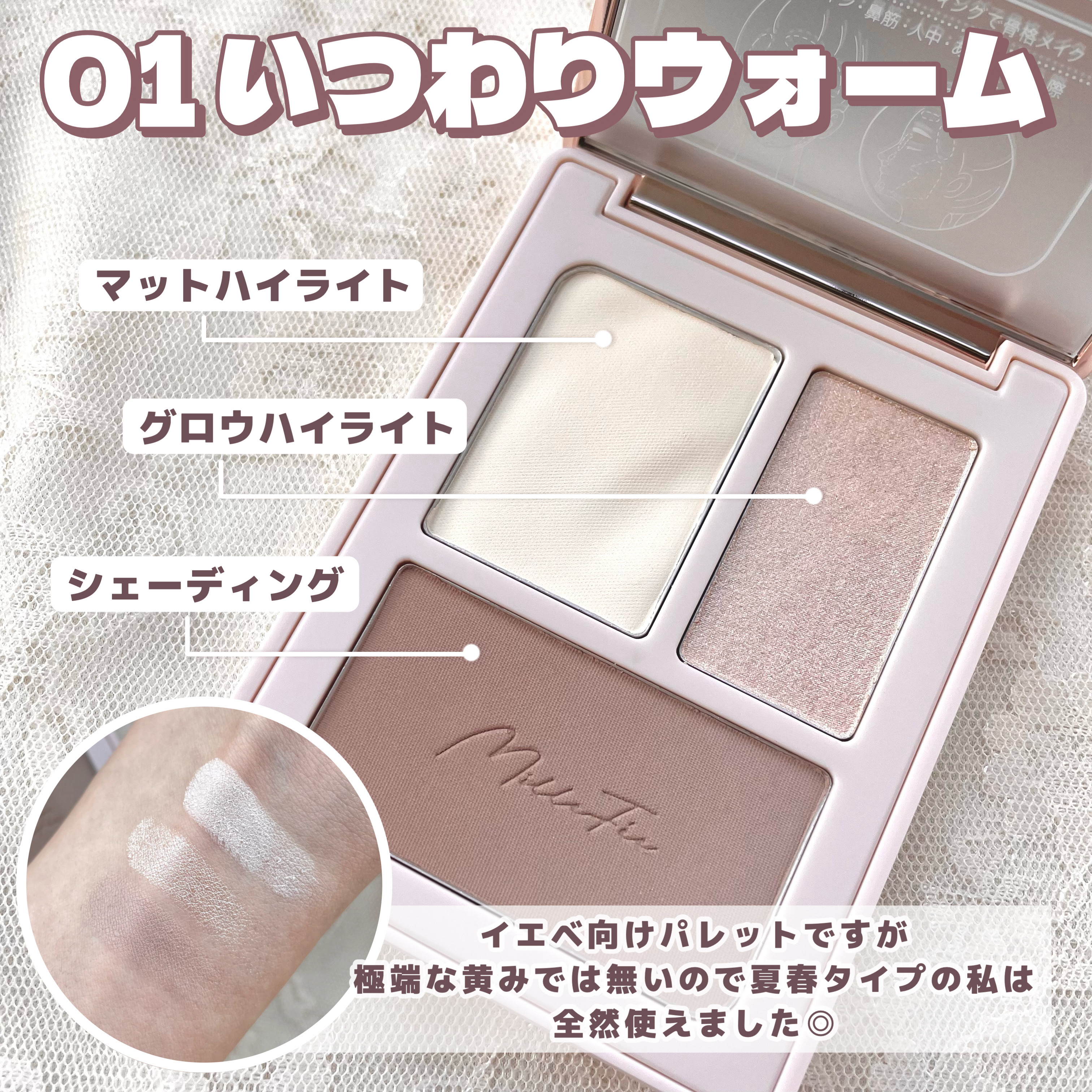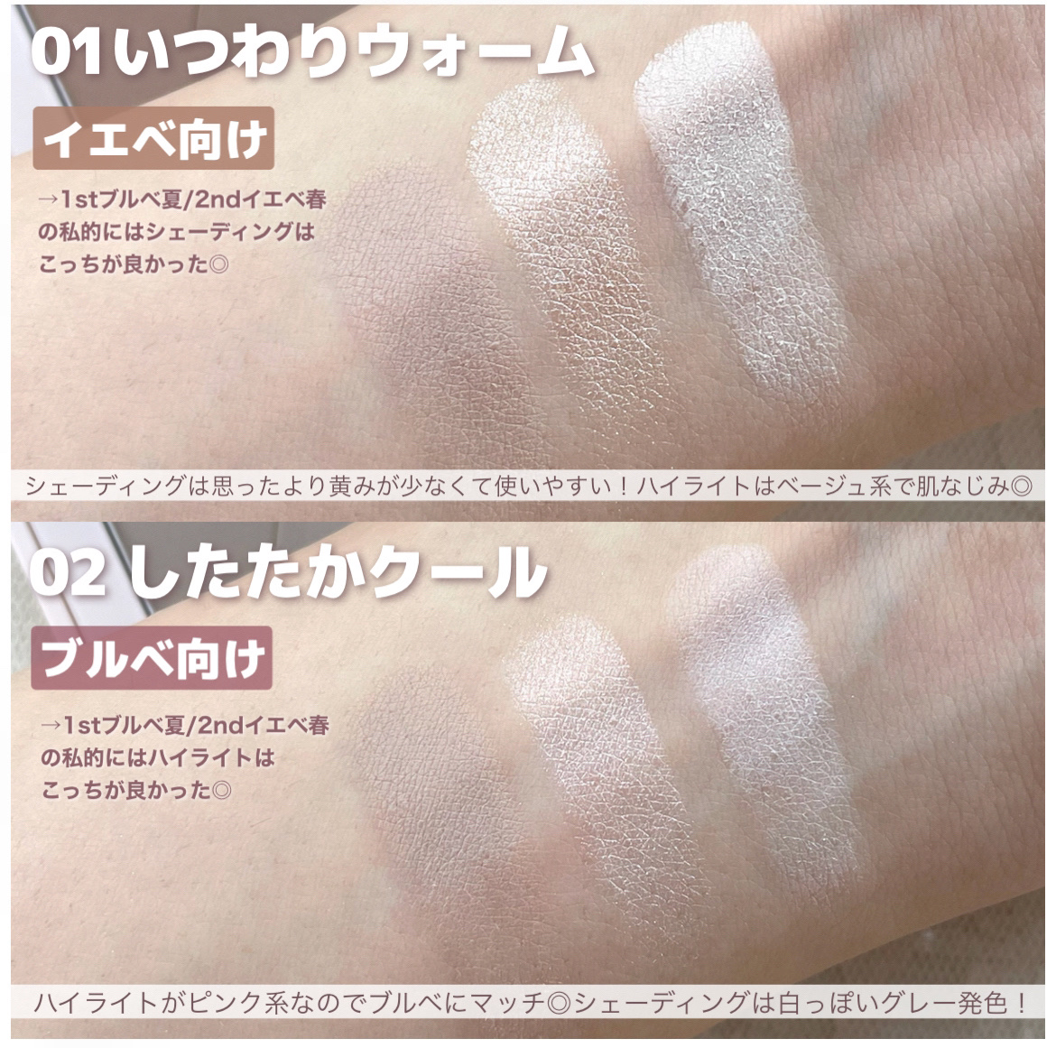 - マット質感でナチュラルボーンな輪郭演出!これぞ「#チート顔」 2色のハイライトが1つのパレットに入っており、用途によって使い分けが可能です。より高さを出したい、強調したいというところにはつやタイプのハイライトを、ナチュラルに輪郭補正したいところやテカリを抑えつつ肌に凹凸を出したいところにはマットハイライトを乗せる使い分けがおすすめです。 イエベ・ブルベ別のカラー展開 本製品は「01 いつわりウォーム」がイエベ向け、「02 したたかクール」がブルベ向けの2色展開となっております。ハイライトカラーもパーソナルカラーに基づいて調整された色味のため、自然で可愛い輪郭を演出します。 スマートなフォルムで持ち運びにも 3色も入って鏡付きなのに薄くスマートな設計のため、持ち運びに適しています。自宅でのメイクにも、出先でのメイク直しにも使える便利なアイテムです。 2024年6月17日よりQoo10、楽天市場店、Yahoo!ショッピングで販売を開始予定 店頭では7月上旬より全国のロフトおよびロフトネットストア、ハンズおよびハンズネット、アインズ&トルペ、@cosme STOREにて順次先行販売を開始予定(いずれも一部店舗を除く)