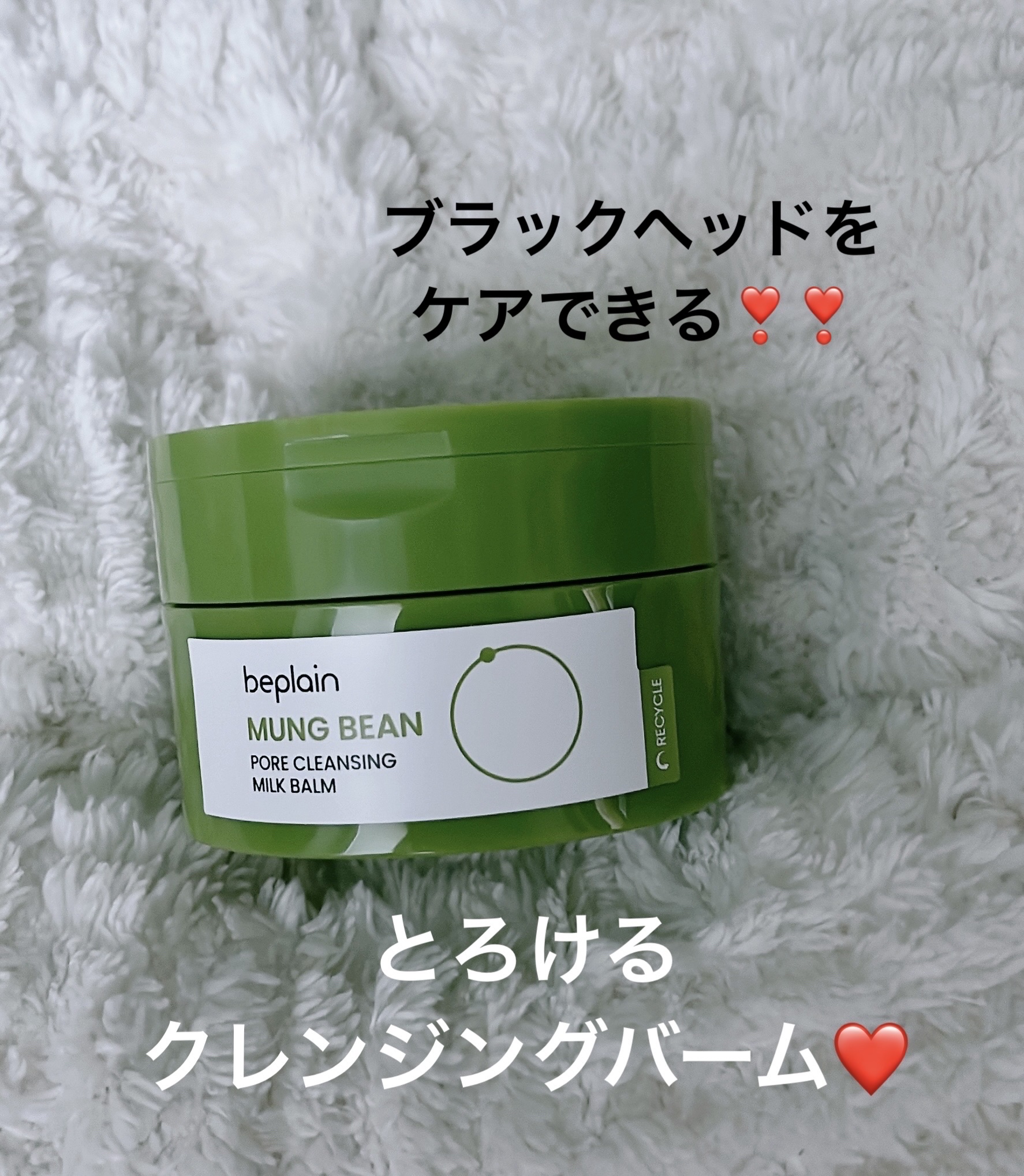 beplain緑豆毛穴クレンジングミルクバームヘアメイクアップアーティストJunJunさんと共同開発されたクレンジングバーム👀💕beplainらしいグリーンカラーのパケが可愛い💚やや柔らかめのバームが肌温度でとろんっとミルクテクスチャーに変化...