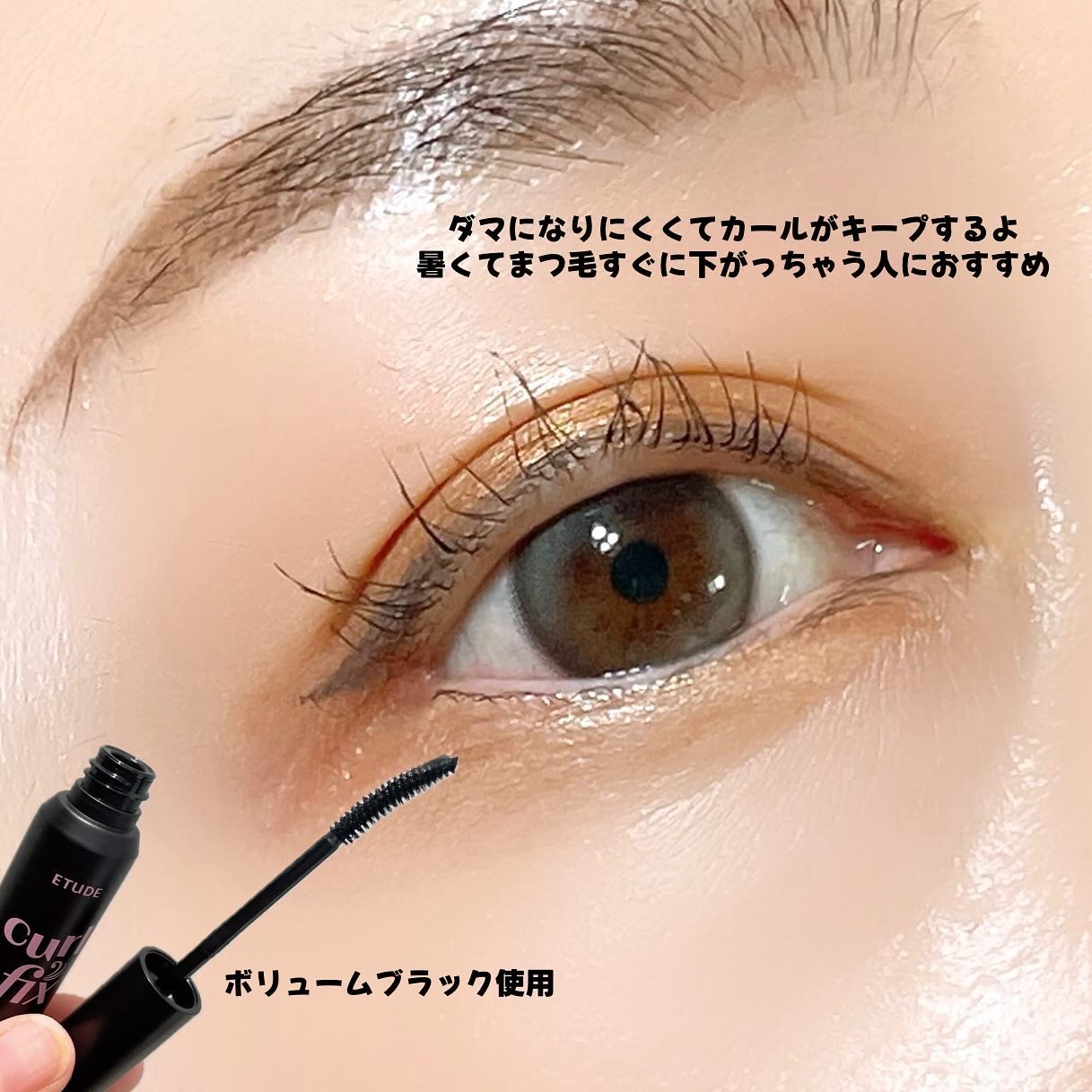上向き束感まつ毛がつくれるカールフィックスマスカラにボリュームタイプ♬ 目のカーブに合う小さめブラシで細かい毛もキャッチして液づきもしっかり🙆♀️ 涙目になりやすいから、にじみにくいのって嬉しい🥰