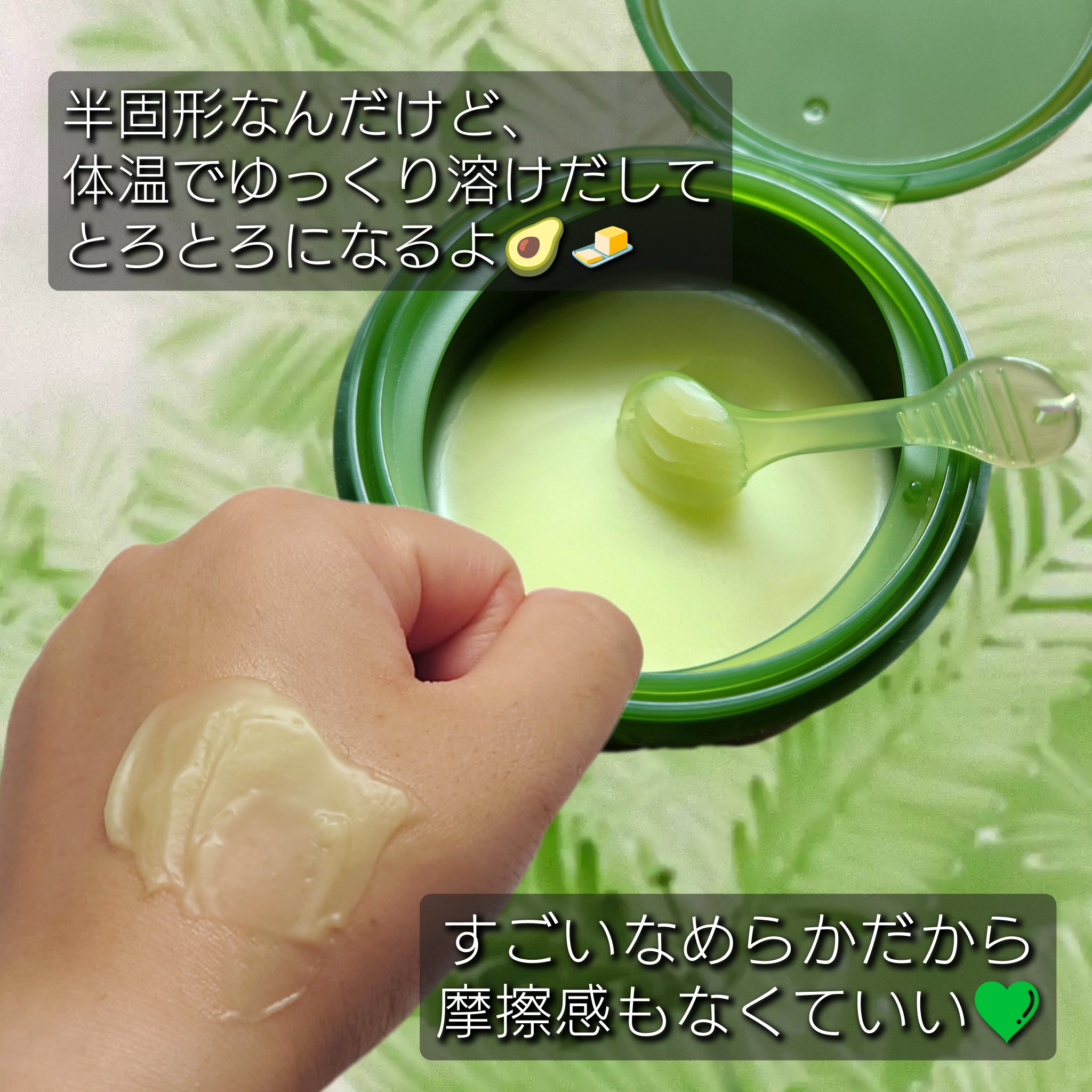 これ1つでメイク汚れ、皮脂、角質、黒ずみまで洗浄! 最初はバームでメイクなどの汚れを溶かし、オイルに変わるとブラックヘッドや角質を優しく除去し、最後にミルクに変わりつっぱりない仕上がり。 柔らかいシャーベット状のアボカドバームです。良い香りがします😌