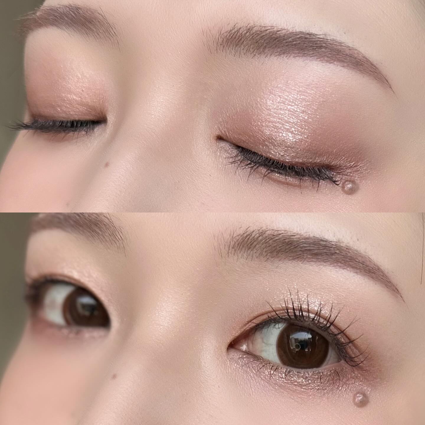 手に試した感じではベースのブルーは弱く、ラメ自体がブルーで可愛すぎる…! BAさんはパウダーアイシャドウのベースにもおすすめと教えてくれたので、 今日はこちらをベースにピンクブラウン系の アイシャドウを使ってメイクしてみたよ🫶🏻 肌に伸ばすとすぐにサラサラになるから ベタベタが残ったりしないし、 パウダーアイシャドウの上に重ねてもヨレない◎