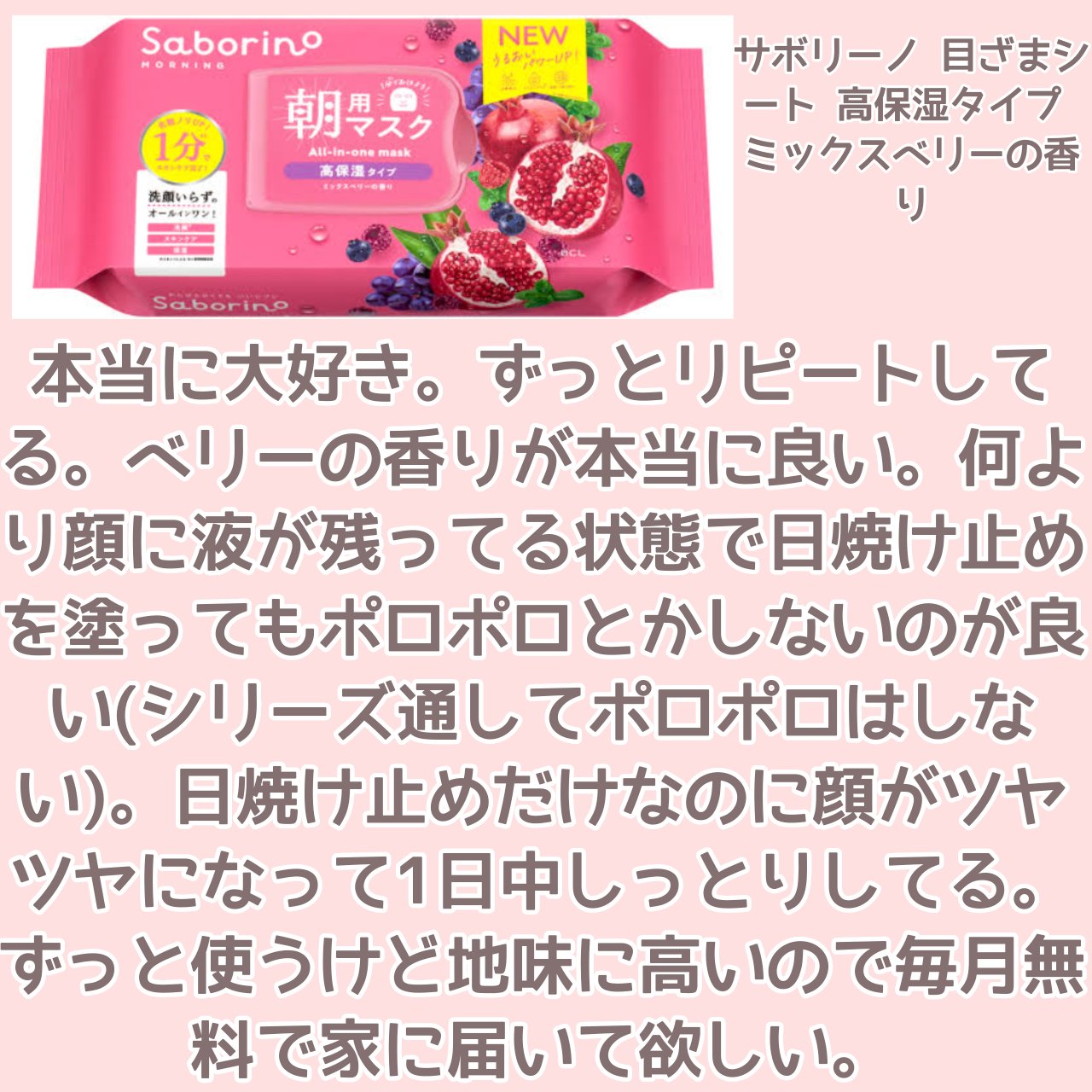 サボリーノネーミング通り朝に洗顔したくないだるい人にピッタリ♪ スッキリ夜寝ている間汚れた肌をキレイキレイしてくれ、パックした後直ぐに化粧水とか色々しなくて済む☆ 朝に忙しいお人使って欲しい☆ タイプ香りも色々あり選び放題☆☆