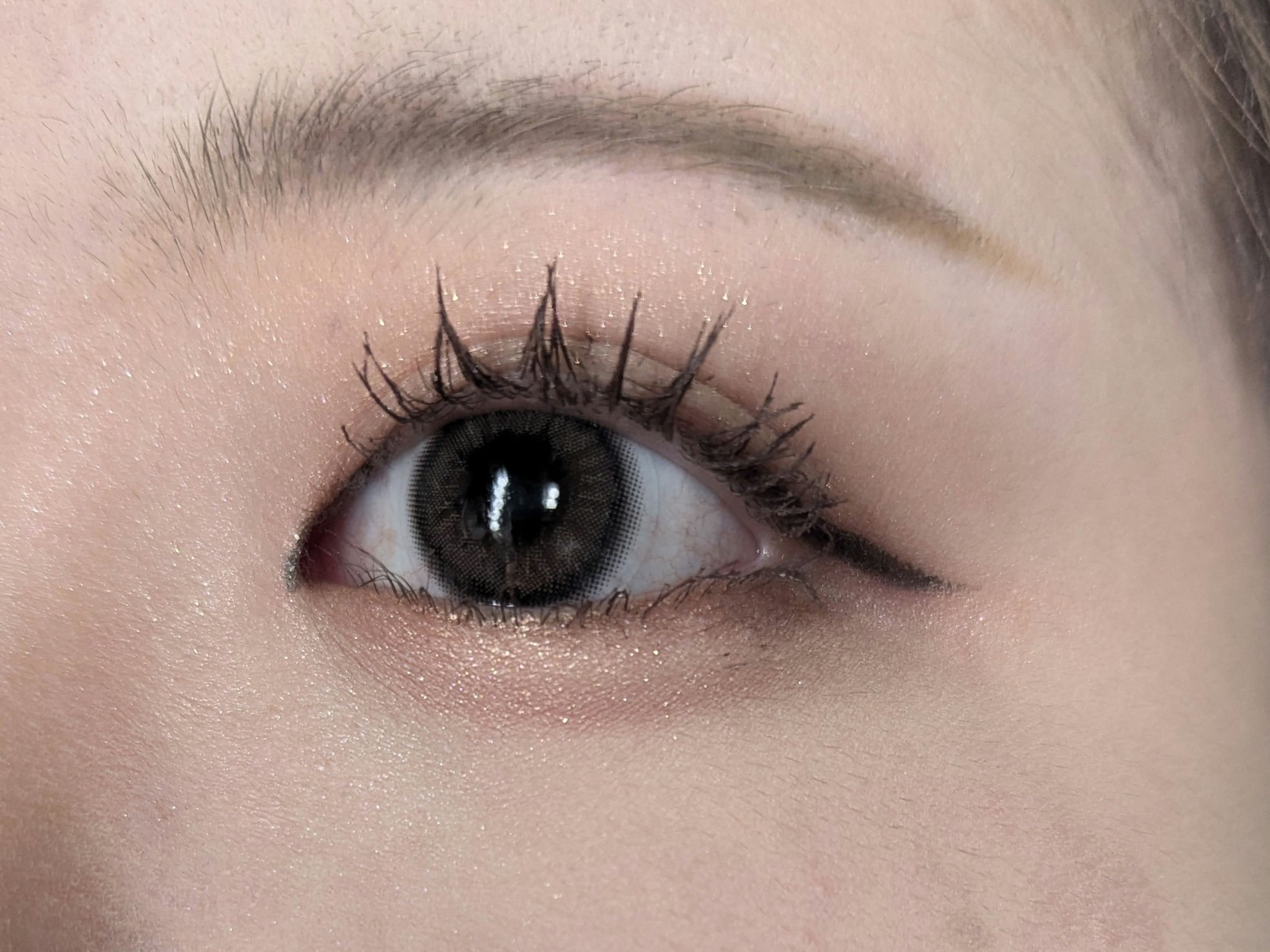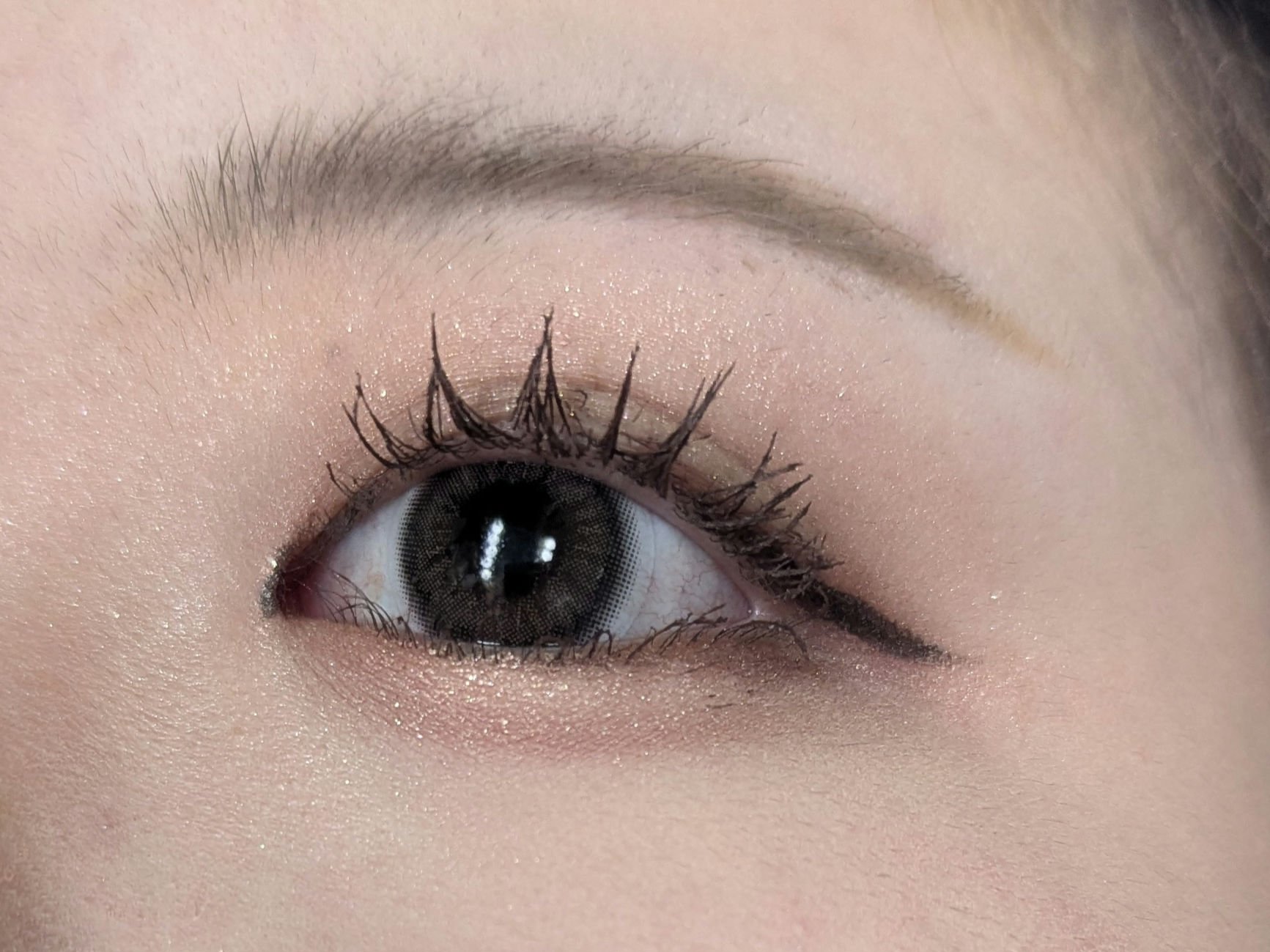 着色直径13.8mmなので、少し大きめと思いがちですがそんなことないんです! ドットふちなので派手すぎる心配もなく、ふわっと溶け込んでくれる仕上がりなので普段のメイクがあまり濃くない方でも使いやすいと思います♡♡ 茶目の私がつけるとと若干裸眼よりも全体のトーンは暗く見えますが、デザイン的に光が入って見えるのでむしろ目が明るく見える✨️