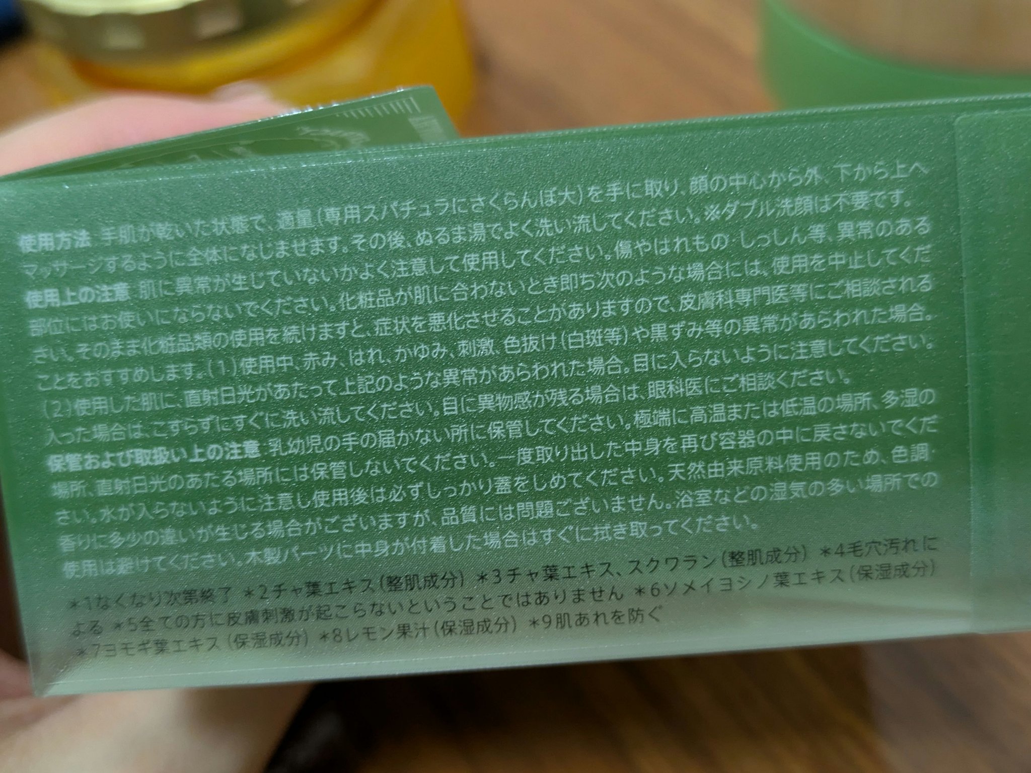 - パルミチン酸エチルヘキシル,トリ(カプリル酸/カプリン酸)グリセリル,トリイソステアリン酸PEG-20グリセリル,炭酸ジカプリリル,合成ワックス,トリイソステアリン酸PEG-5グリセリル,ペンチレングリコール,ベヘン酸ベヘニル,チャ葉,チャ葉エキス,イノシトール,レモン果汁,マンダリンオレンジ果皮エキス,ソメイヨシノ葉エキス,シャクヤク根エキス,ユキノシタエキス,ヨモギ葉エキス,ユズ果実エキス,水添ヒマシ油,シリカ,ジメチルシリル化シリカ,スクワラン,BG,ポリアミノプロピルビグアニド,トコフェロール,水,香料