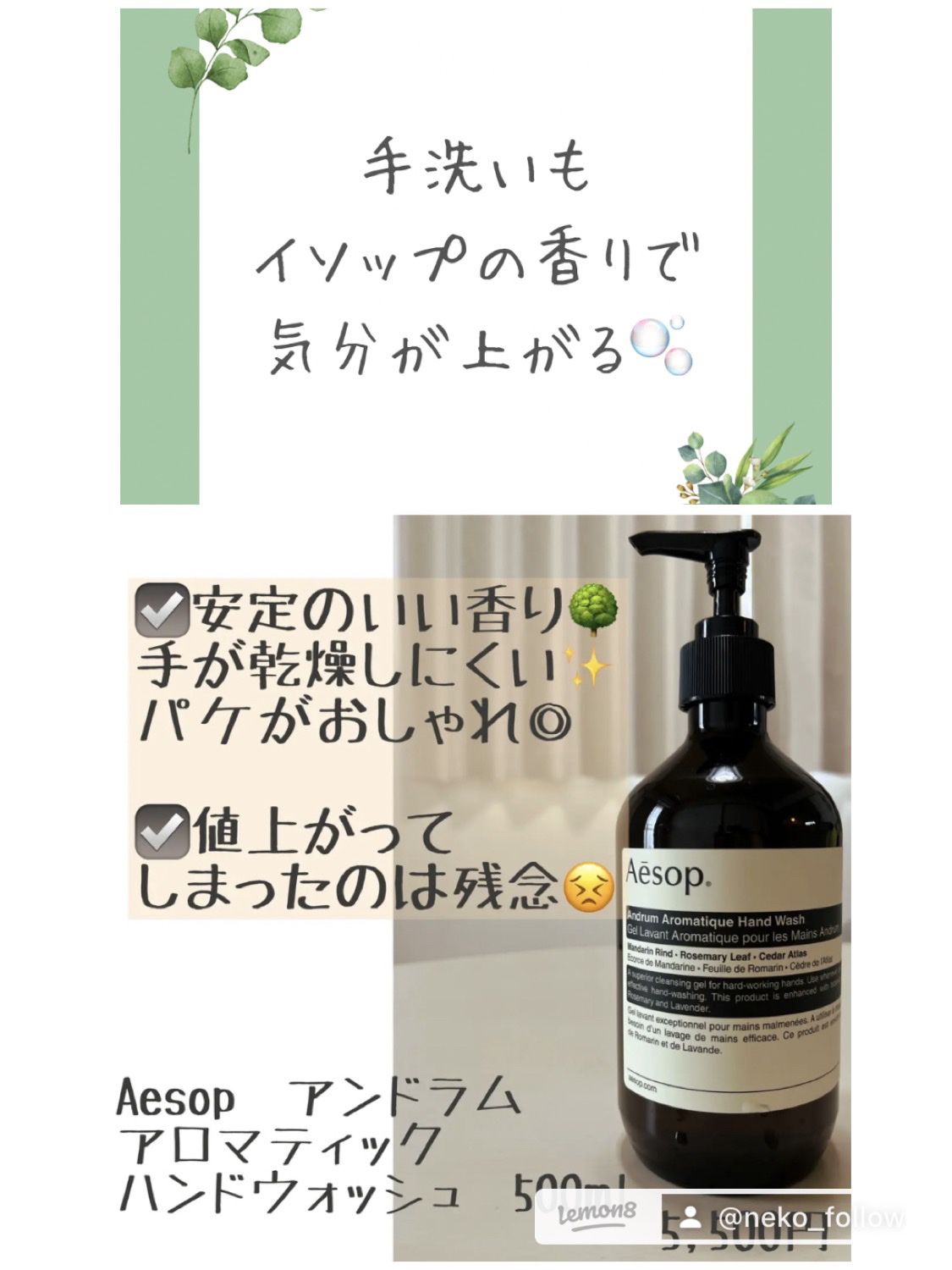 高級ホテル…においてあるハンドソープの香りアロマの香りいい女の子香り高いけどお気に入り…#Aesop#イソップ#アンドラムアロマティックハンドウォッシュ#ハンドソープ気になってる方はチェックしてみてください※個人の感想です#イソップハンドソー...