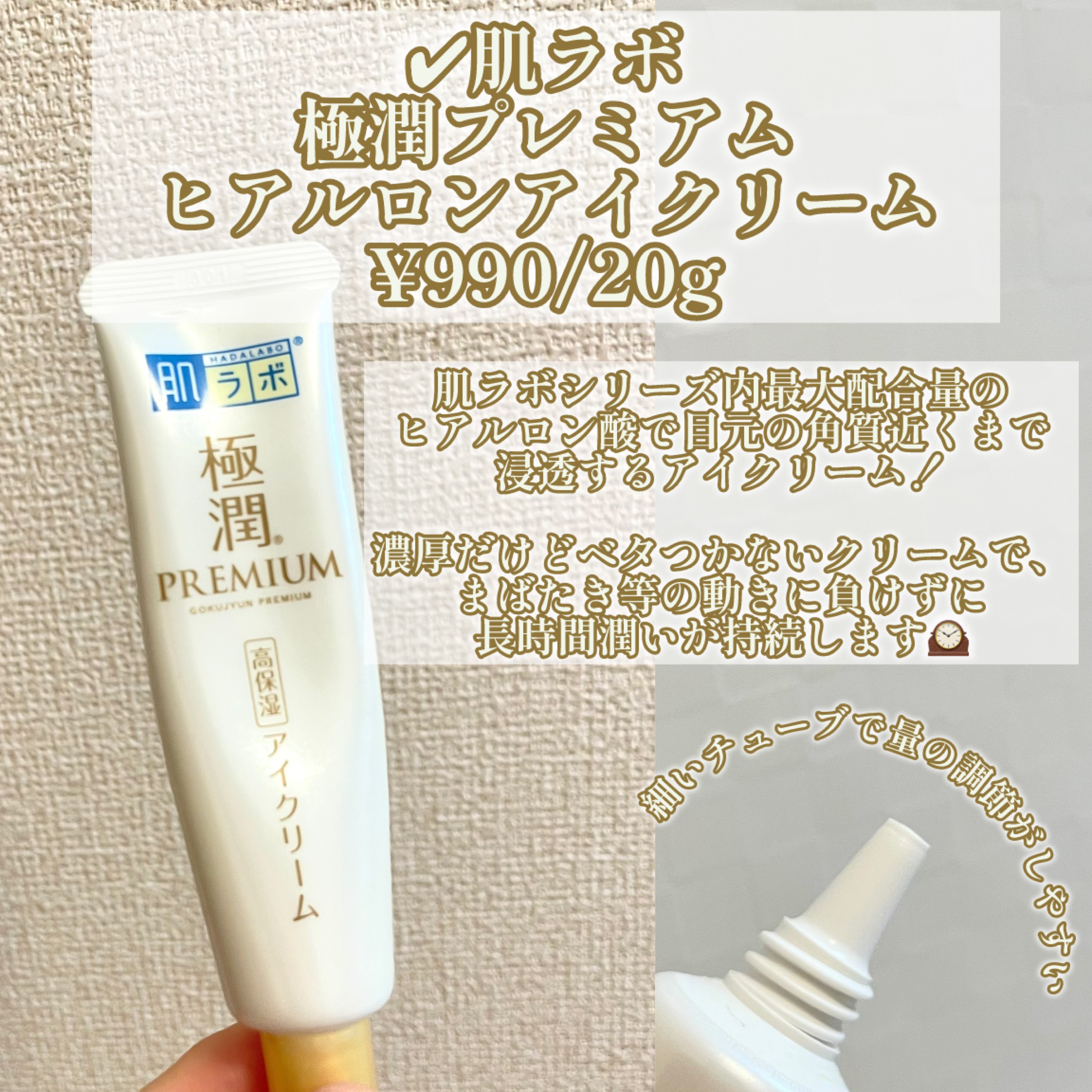 肌ラボ極潤プレミアムヒアルロンアイクリーム7種類のヒアルロン酸が配合されている高保湿・高密着なアイクリーム長時間うるおい持続処方乾燥による小じわを目立たなくし(効能評価試験済み)、潤ってふっくらハリのある目元へ✨️✨️肌へのやさしさに配慮した...