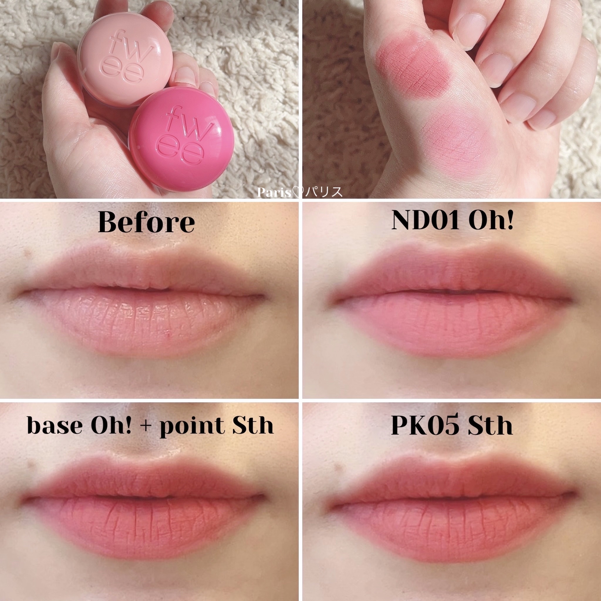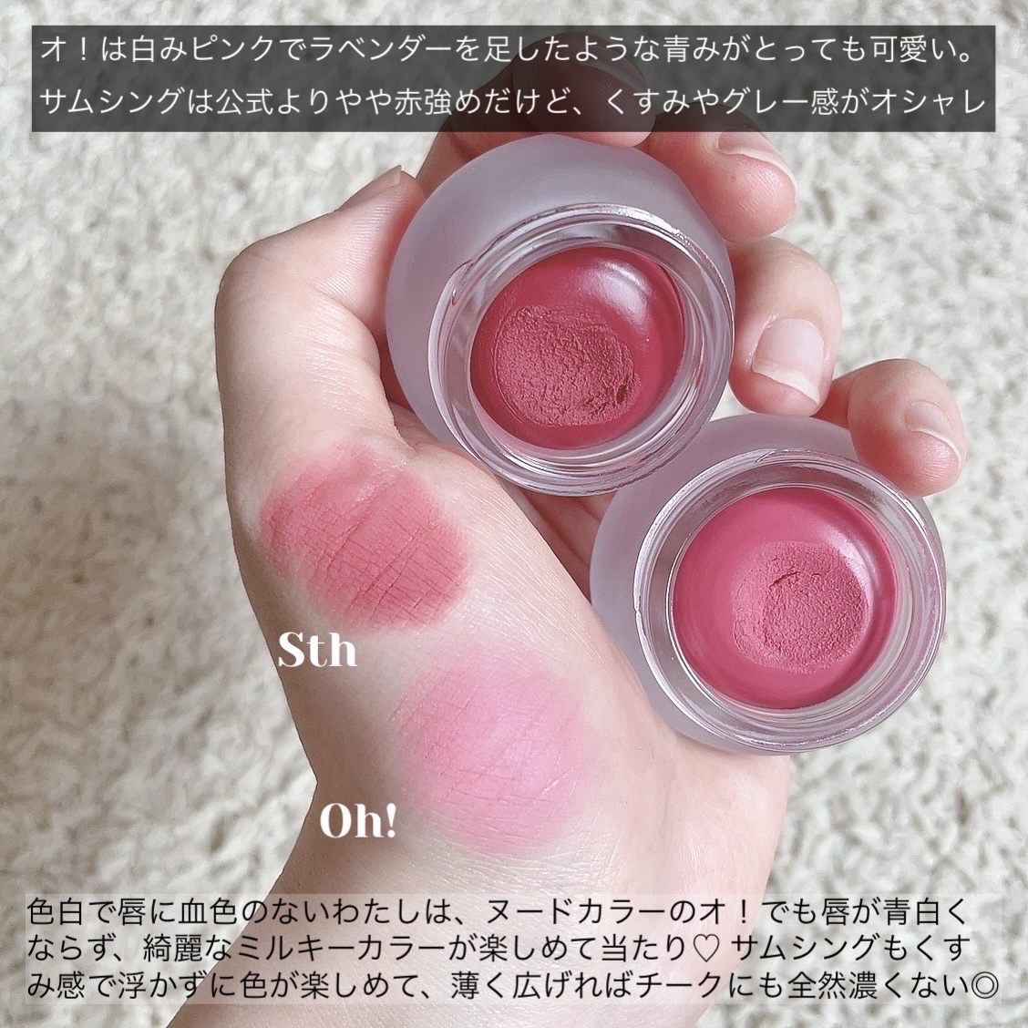 コロンとした丸みのある可愛らしいデザイン。ふんわりとしたムースプリンのようなクリーム質感のリップアンドチーク。肌に馴染ませるとサラッとしているマットな使用感です。 ND01 OH!は、くすみ感のないフレッシュな青みピンクカラー。好みの濃さに、またパウダーチークと重ねることも出来るのでイエベでも可愛らしい青みピンクカラーに挑戦しやすかったです。 値段も手頃で色展開も豊富なので、コーラル系やピーチ系のカラーも集めたくなりました。