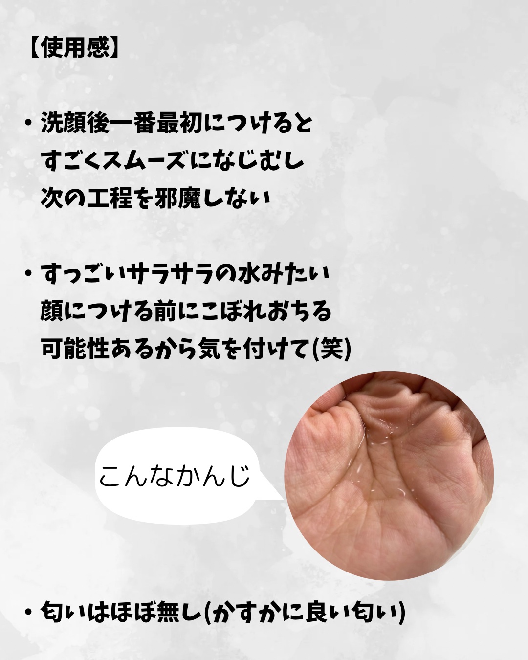 しゃばしゃばしていてサッパリした使い心地。肌に馴染みやすく、塗った後はサラッとします。 これをつけると次に使う化粧水がいつもより馴染みやすいように感じました。 サラッとしているから、夏でも使いやすそう🫶