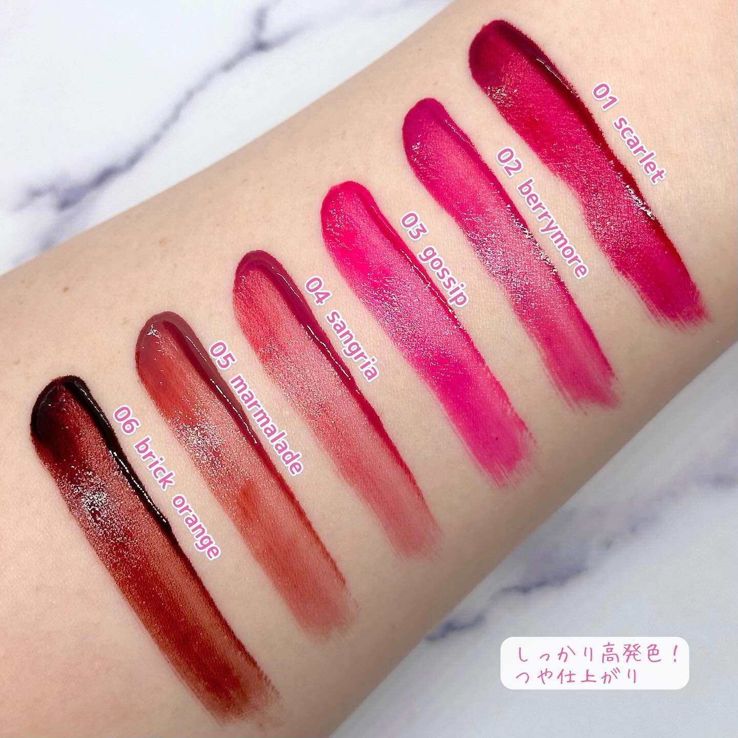 - <【旧】01 スカーレット(SCARLET)> 水、オクチルドデカノール、BG、ダイマージリノール酸水添ヒマシ油、DPG、ジグリセリン、ペンチレングリコール、(アクリル酸Na/アクリロイルジメチルタウリンNa)コポリマー、イソヘキサデカン、トリ(カプリル酸/カプリン酸)グリセリル、グリセリン、ステアリン酸ソルビタン、エチルセルロース、PEG-60水添ヒマシ油、ポリソルベート80、オレイン酸ソルビタン、エチルヘキシルグリセリン、エチレンジアミンジコハク酸3Na、没食子酸プロピル、セテアリルアルコール、フェノキシエタノール、赤227、黄5、赤104(1)、黄4 <【旧】02 ベリーモア(BERRY MORE)> 水、オクチルドデカノール、ダイマージリノール酸水添ヒマシ油、DPG、BG、ジグリセリン、グリセリン、ペンチレングリコール、(アクリル酸Na/アクリロイルジメチルタウリンNa)コポリマー、トリ(カプリル酸/カプリン酸)グリセリル、ステアリン酸ソルビタン、エチルセルロース、イソヘキサデカン、PEG-60水添ヒマシ油、ポリソルベート80、エチルヘキシルグリセリン、オレイン酸ソルビタン、エチレンジアミンジコハク酸3Na、オキシ水酸化Al、ポリアクリル酸アンモニウム、没食子酸プロピル、セテアリルアルコール、フェノキシエタノール、酸化チタン、赤227、黄4、赤104(1)、青1 <【旧】03 ゴシップ(GOSSIP)> 水、オクチルドデカノール、ダイマージリノール酸水添ヒマシ油、DPG、BG、ジグリセリン、グリセリン、ペンチレングリコール、(アクリル酸Na/アクリロイルジメチルタウリンNa)コポリマー、トリ(カプリル酸/カプリン酸)グリセリル、ステアリン酸ソルビタン、イソヘキサデカン、エチルセルロース、PEG-60水添ヒマシ油、ポリソルベート80、オレイン酸ソルビタン、エチルヘキシルグリセリン、エチレンジアミンジコハク酸3Na、オキシ水酸化Al、ポリアクリル酸アンモニウム、没食子酸プロピル、セテアリルアルコール、フェノキシエタノール、酸化チタン、赤104(1)、赤227、黄4、黄5、青1 <【旧】04 サングリア(SANGRIA)> 水、オクチルドデカノール、ダイマージリノール酸水添ヒマシ油、DPG、BG、ジグリセリン、グリセリン、ペンチレングリコール、(アクリル酸Na/アクリロイルジメチルタウリンNa)コポリマー、トリ(カプリル酸/カプリン酸)グリセリル、ステアリン酸ソルビタン、エチルセルロース、イソヘキサデカン、PEG-60水添ヒマシ油、ポリソルベート80、エチルヘキシルグリセリン、オレイン酸ソルビタン、エチレンジアミンジコハク酸3Na、オキシ水酸化Al、ポリアクリル酸アンモニウム、没食子酸プロピル、セテアリルアルコール、フェノキシエタノール、酸化チタン、赤227、黄4、黄5、赤104(1)、青1 <【旧】05 マーマレード(MARMALADE)> 水、オクチルドデカノール、ダイマージリノール酸水添ヒマシ油、DPG、BG、ジグリセリン、グリセリン、ペンチレングリコール、(アクリル酸Na/アクリロイルジメチルタウリンNa)コポリマー、トリ(カプリル酸/カプリン酸)グリセリル、ステアリン酸ソルビタン、エチルセルロース、イソヘキサデカン、PEG-60水添ヒマシ油、ポリソルベート80、エチルヘキシルグリセリン、オレイン酸ソルビタン、エチレンジアミンジコハク酸3Na、オキシ水酸化Al、ポリアクリル酸アンモニウム、没食子酸プロピル、セテアリルアルコール、フェノキシエタノール、酸化チタン、黄4、赤227、黄5、青1 <【旧】06 ブリックオレンジ(BRICK ORANGE)> 水、オクチルドデカノール、ダイマージリノール酸水添ヒマシ油、DPG、BG、ジグリセリン、グリセリン、ペンチレングリコール、(アクリル酸Na/アクリロイルジメチルタウリンNa)コポリマー、イソヘキサデカン、トリ(カプリル酸/カプリン酸)グリセリル、ステアリン酸ソルビタン、エチルセルロース、PEG-60水添ヒマシ油、ポリソルベート80、オレイン酸ソルビタン、エチルヘキシルグリセリン、エチレンジアミンジコハク酸3Na、オキシ水酸化Al、ポリアクリル酸アンモニウム、没食子酸プロピル、セテアリルアルコール、フェノキシエタノール、黄4、赤227、黄5、酸化チタン、青1