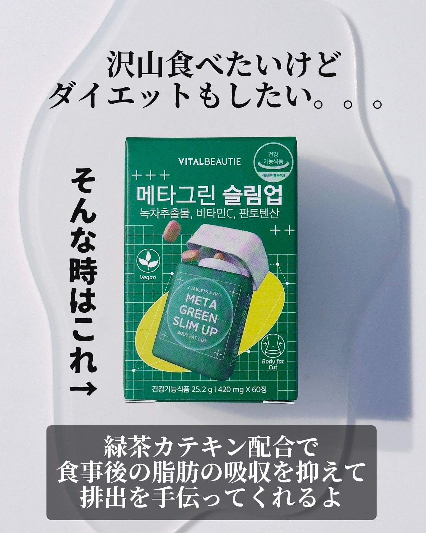 #PRメタグリーンスリムアップ🌿▶@vitalbeautie_official1日2粒💚食後必須アイテム✨緑茶カテキン配合で、食事後の脂肪の吸収を抑えて、排出を手伝ってくれる♡小粒だから飲みやすくて続けやすいのも◎✨#ダイエット#体脂肪減少#...