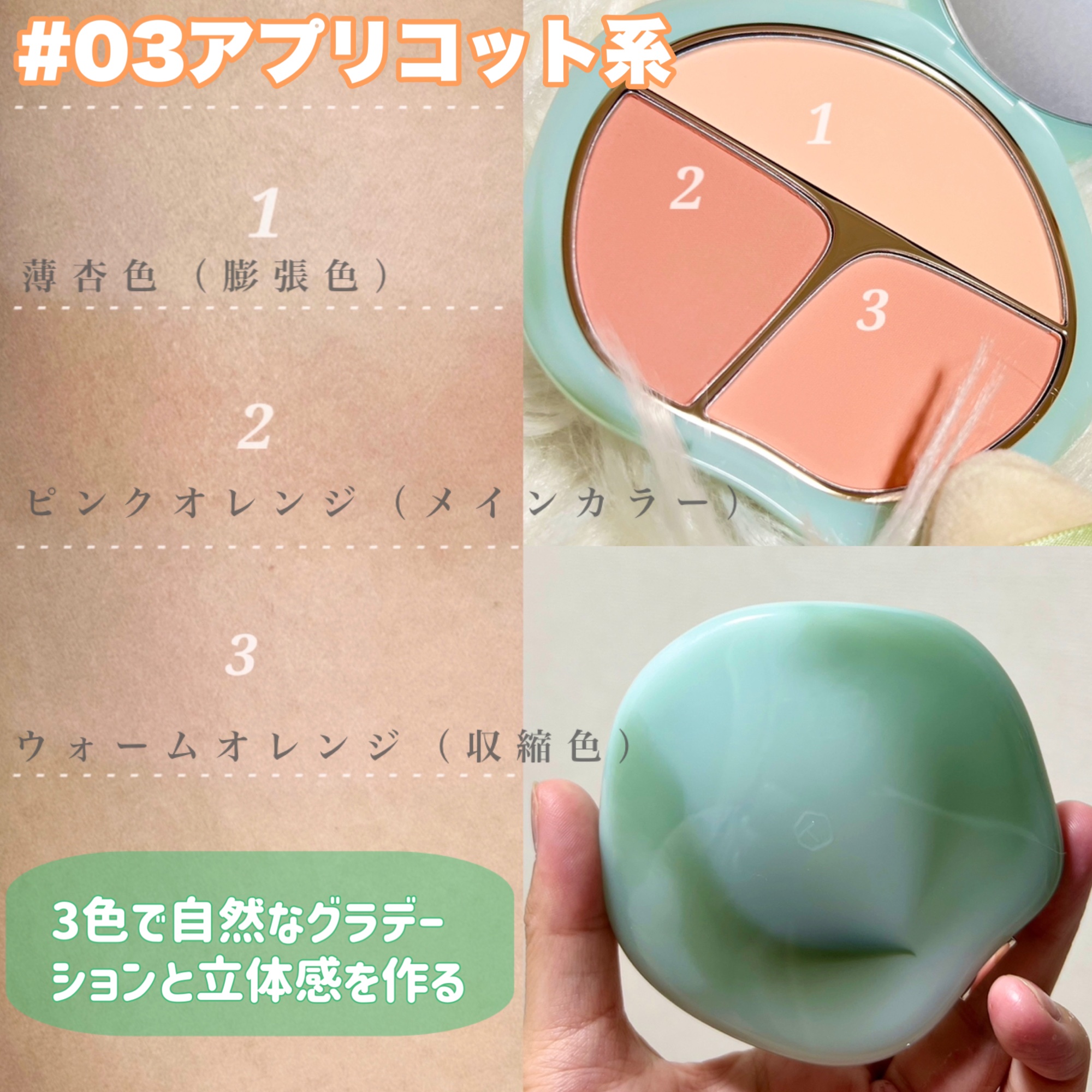 - 「膨張色+メインカラー+収縮色」の三色一体型チークパレット。 異なる明度と彩度の色で自然なグラデーションと立体感を作ることが可能。単色で使用すれば様々な雰囲気のメイクが楽しめ、違う色を重ねて使用すると、三色が程よいバランスで雰囲気と立体感を作り出す。