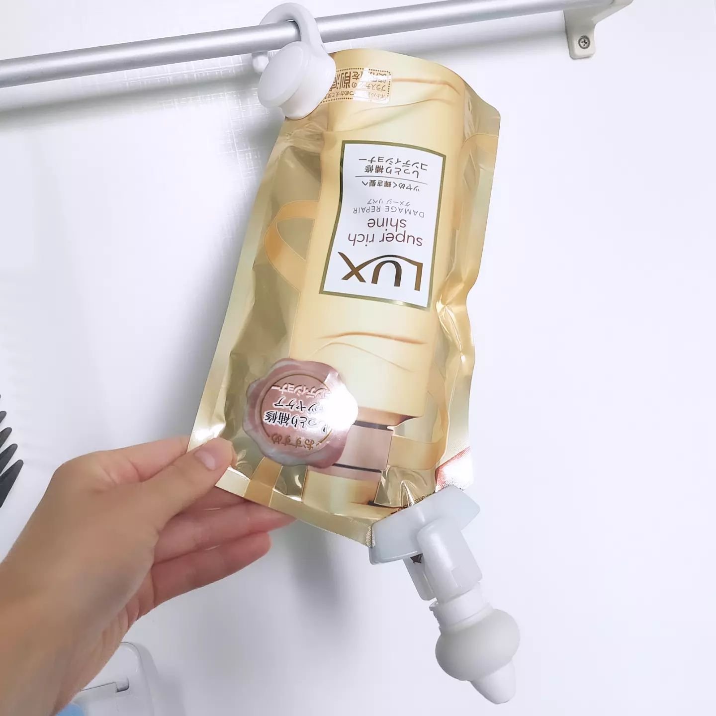 ボディ/シャンプー/リンス(固すぎるとダメですが)の詰め替えを説明書通りに取り付けると、お風呂場のいろんなところに引っ掛けられるのでめっちゃ便利!です。 逆さにしても大丈夫?漏れない?と思いきや、そこはしっかり固定されてます。 透明ボトルじゃないのでそろそろ買わなきゃ?って懸念がなくホント助かってます。
