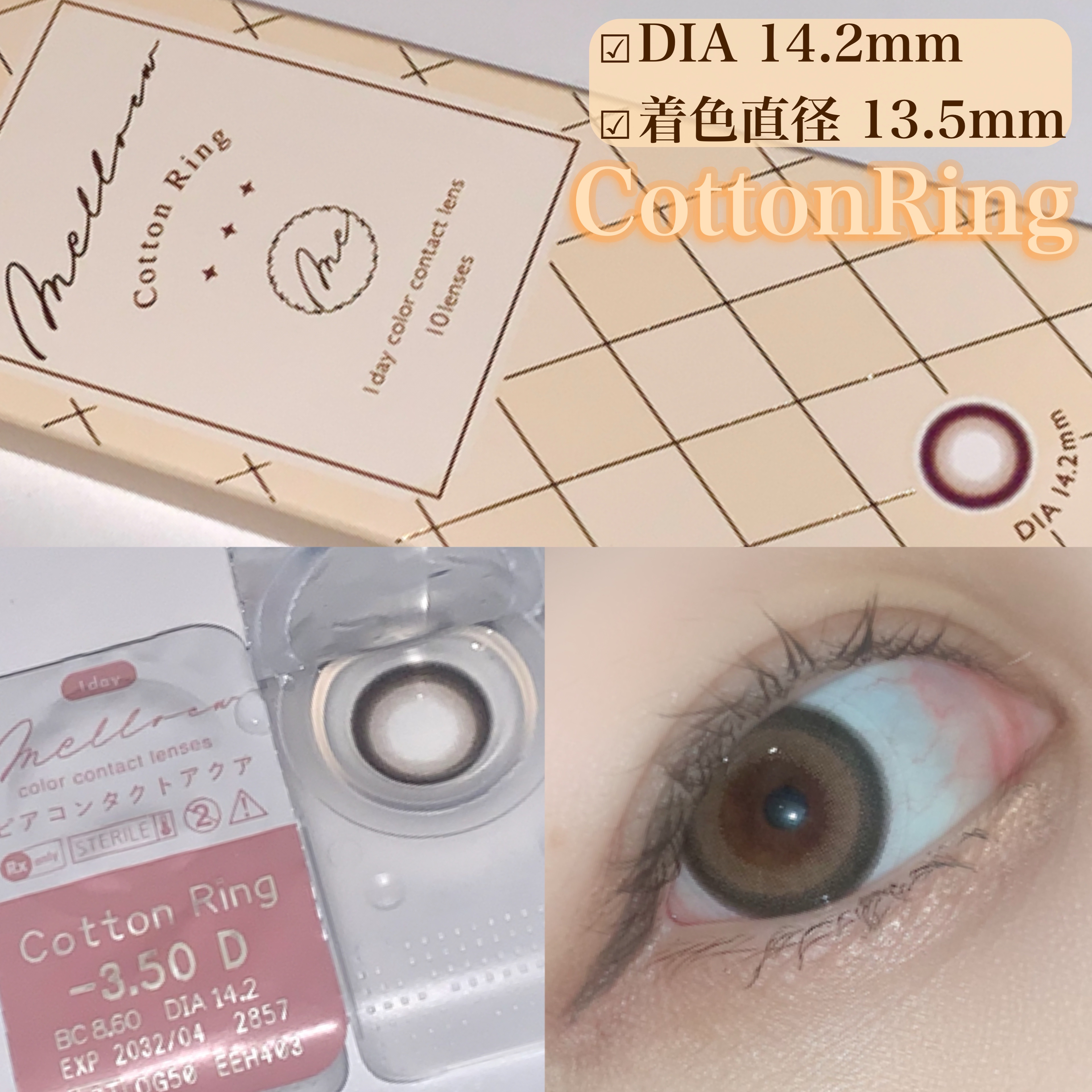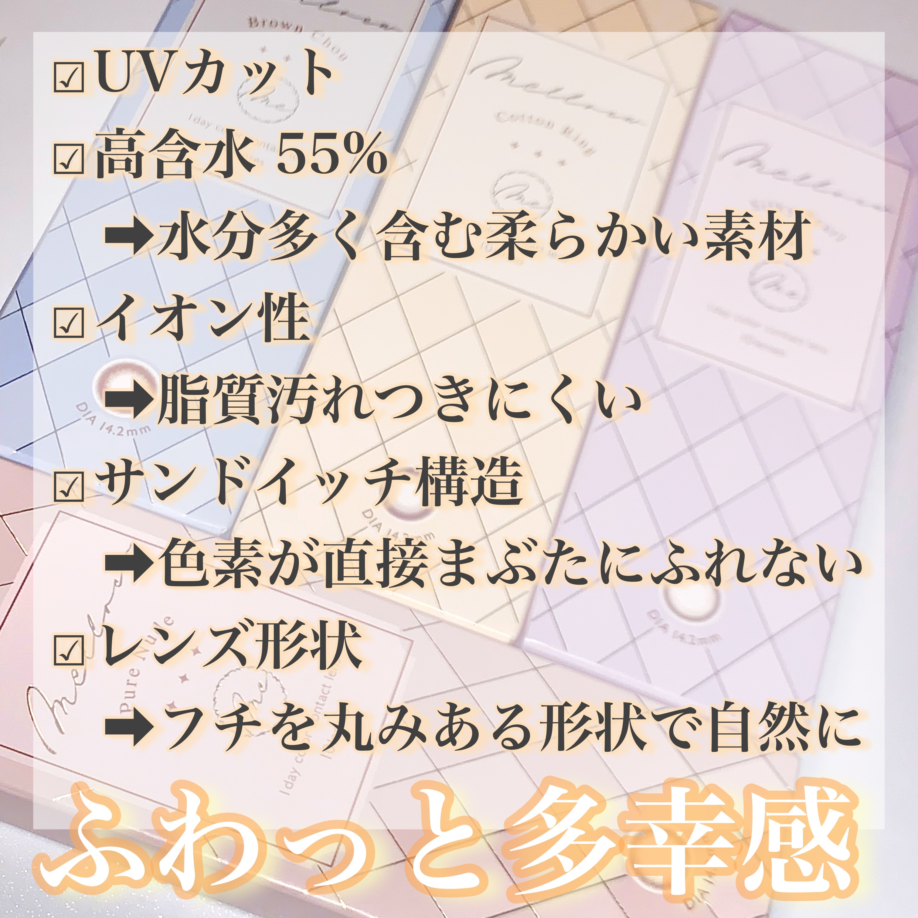 - ※2025年6月以降、商品パッケージ裏面・側面の一部表記を順次変更いたします。尚、これにかかる商品の交換・返品は承っておりません。 ふわっと漂う多幸感 キラキラとした瞳 そんな多くの人が憧れる印象はmelloewで作れる! 王道盛れからあざと盛れまでどんな盛れも叶うラインナップで瞳をコーディネート☆ Cotton Ring(コットンリング) DIA14.2㎜/着色直径13.5㎜ 溶け込みベージュ×くっきりフチ 写真でもリアルでも盛れちゃう♪ Silky Pearl(シルキーパール) DIA14.2㎜/着色直径13.5㎜ ツヤっぽベージュ×細フチ 垢抜けた印象にしたい方におすすめ♪ Truffle Gray(トリュフグレー) DIA14.2㎜/着色直径13.4㎜ おしゃれモテ♡ 濃いめグレージュ×ぼかし細フチ 品よく盛れるお嬢様な瞳に Pure Nude(ピュアヌード) DIA14.2㎜/着色直径13.2㎜ 絶妙ヌーディカラー×グラデフチ お仕事やカラコン初心者にもおすすめ♪ Brown Chou(ブラウンシュー) DIA14.2㎜/着色直径13.6㎜ まろやかブラウン×ぼかしフチ 日常使いにもおすすめ♪ Mocha Powder(モカパウダー) DIA14.2㎜/着色直径13.6㎜ リピ確モテ♡ ふわふわモカ×くりっとフチ 絶対盛れちゃう甘い瞳に Love Cacao(ラブカカオ) DIA14.2㎜/着色直径13.0㎜ 清楚モテ♡ とろふわチョコレート×こっそりフチ バレずに盛れちゃう瞳に カラーコンタクトレンズの不適正使用による眼障害の危険性等などがあります。 ●コンタクトレンズは高度管理医療機器です。不十分な洗浄・消毒など不適切なケアや、長時間・交換期間を超えた装用により、アレルギー性結膜炎、角膜感染症、角膜潰瘍等の重篤な眼障害が発生する危険性があります ●ご使用前に取扱説明書を確認してください 使用上の留意事項 ●眼科医院等を受診してからお求めください ●眼に異常を感じたら直ちにレンズ使用を中止し、お近くの眼科等で診察を受けてください ●医師の指示にしたがってご使用ください ●コンタクトレンズを装用する場合、自覚症状がなくても、眼科医院等での定期検査を受けてください ●レンズに不具合がある場合は使用しないでください