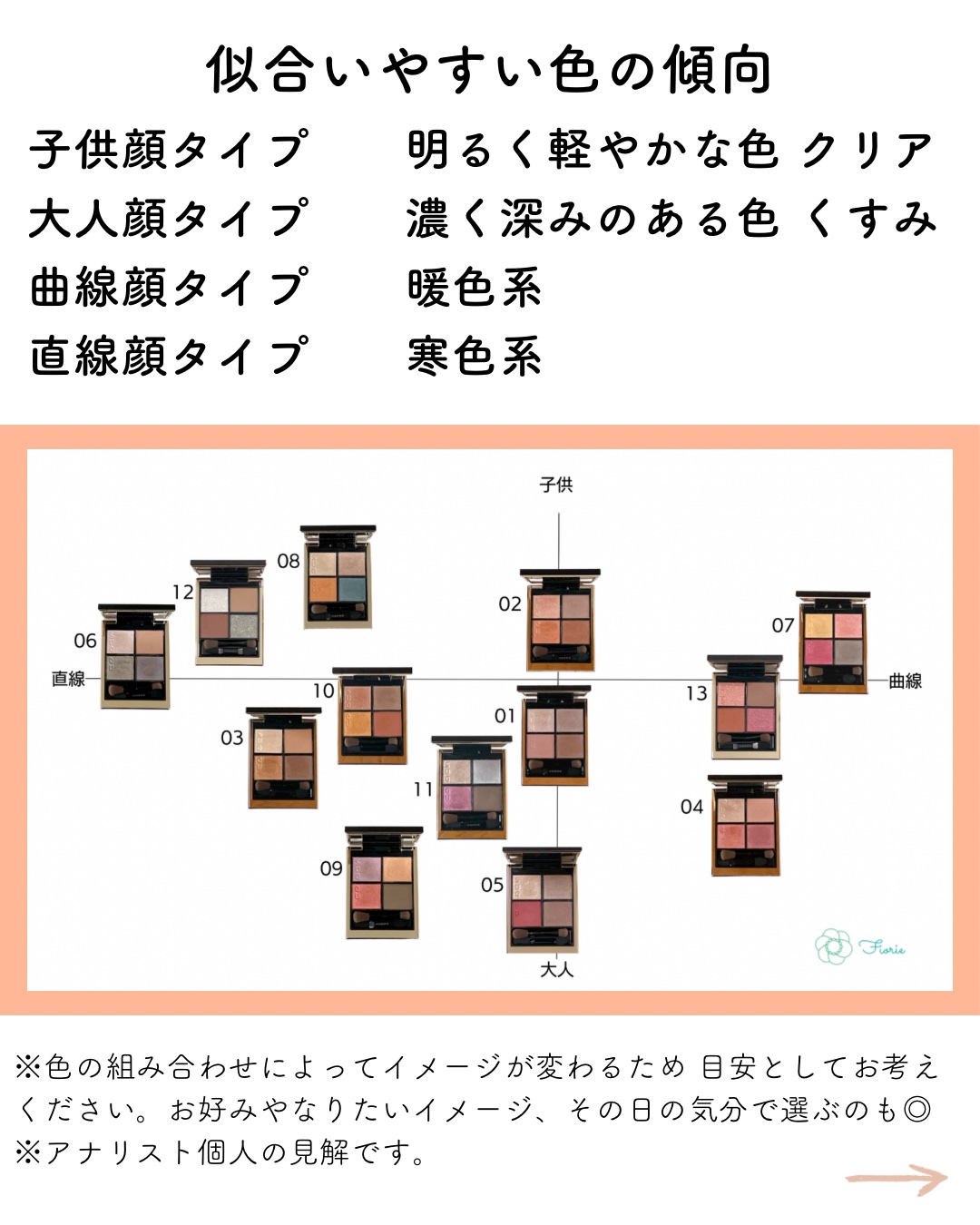 - <01 瑞花 -MIZUHANA> マイカ、合成フルオロフロゴパイト、タルク、ジメチコン、ジフェニルシロキシフェニルトリメチコン、ラウロイルグルタミン酸ジ(フィトステリル/オクチルドデシル)、シリカ、(ジメチコン/ビニルジメチコン)クロスポリマー、ジステアリン酸Al、ミリスチン酸Mg、リンゴ酸ジイソステアリル、ミリスチン酸亜鉛、ステアロイルグルタミン酸2Na、イソステアリン酸ソルビタン、メチコン、水酸化Al、ホホバ種子油、シア脂、カニナバラ果実油、ラウロイルグルタミン酸ジ(オクチルドデシル/フィトステリル/ベヘニル)、ヒアルロン酸Na、クロルフェネシン、デヒドロ酢酸Na、(+/-)アルミナ、グンジョウ、コンジョウ、酸化チタン、酸化鉄、酸化スズ、ホウケイ酸(Ca/Al)、黄4、赤202、赤226 <02 陽香色 -YOUKOUIRO> マイカ、合成フルオロフロゴパイト、タルク、ジメチコン、ジフェニルシロキシフェニルトリメチコン、ラウロイルグルタミン酸ジ(フィトステリル/オクチルドデシル)、シリカ、(ジメチコン/ビニルジメチコン)クロスポリマー、ジステアリン酸Al、ミリスチン酸Mg、リンゴ酸ジイソステアリル、ミリスチン酸亜鉛、ステアロイルグルタミン酸2Na、イソステアリン酸ソルビタン、メチコン、水酸化Al、ホホバ種子油、シア脂、カニナバラ果実油、ラウロイルグルタミン酸ジ(オクチルドデシル/フィトステリル/ベヘニル)、ヒアルロン酸Na、クロルフェネシン、デヒドロ酢酸Na、(+/-)アルミナ、グンジョウ、コンジョウ、酸化チタン、酸化鉄、酸化スズ、ホウケイ酸(Ca/Al)、黄4、赤202、赤226 <03 光暮 -HIKARIGURE> マイカ、タルク、合成フルオロフロゴパイト、ジメチコン、ジフェニルシロキシフェニルトリメチコン、ラウロイルグルタミン酸ジ(フィトステリル/オクチルドデシル)、シリカ、(ジメチコン/ビニルジメチコン)クロスポリマー、ジステアリン酸Al、ミリスチン酸Mg、リンゴ酸ジイソステアリル、ミリスチン酸亜鉛、ステアロイルグルタミン酸2Na、イソステアリン酸ソルビタン、水酸化Al、ホホバ種子油、シア脂、カニナバラ果実油、ラウロイルグルタミン酸ジ(オクチルドデシル/フィトステリル/ベヘニル)、ヒアルロン酸Na、クロルフェネシン、デヒドロ酢酸Na、(+/-)アルミナ、酸化チタン、酸化鉄、酸化スズ、ホウケイ酸(Ca/Al)、赤226 <04 純撫子 - SUMINADESHIKO> マイカ、合成フルオロフロゴパイト、タルク、ジメチコン、ジフェニルシロキシフェニルトリメチコン、ラウロイルグルタミン酸ジ(フィトステリル/オクチルドデシル)、シリカ、(ジメチコン/ビニルジメチコン)クロスポリマー、ジステアリン酸Al、ミリスチン酸Mg、リンゴ酸ジイソステアリル、ミリスチン酸亜鉛、ステアロイルグルタミン酸2Na、イソステアリン酸ソルビタン、メチコン、水酸化Al、ホホバ種子油、シア脂、カニナバラ果実油、ラウロイルグルタミン酸ジ(オクチルドデシル/フィトステリル/ベヘニル)、ヒアルロン酸Na、クロルフェネシン、デヒドロ酢酸Na、(+/-)アルミナ、グンジョウ、コンジョウ、酸化チタン、酸化鉄、酸化スズ、ホウケイ酸(Ca/Al)、黄4、赤202、赤226 <05 緋影 - AKEKAGE> マイカ、合成フルオロフロゴパイト、タルク、ジメチコン、ジフェニルシロキシフェニルトリメチコン、ラウロイルグルタミン酸ジ(フィトステリル/オクチルドデシル)、シリカ、(ジメチコン/ビニルジメチコン)クロスポリマー、ジステアリン酸Al、ミリスチン酸Mg、リンゴ酸ジイソステアリル、ミリスチン酸亜鉛、ステアロイルグルタミン酸2Na、イソステアリン酸ソルビタン、メチコン、水酸化Al、ホホバ種子油、シア脂、カニナバラ果実油、ラウロイルグルタミン酸ジ(オクチルドデシル/フィトステリル/ベヘニル)、ヒアルロン酸Na、クロルフェネシン、デヒドロ酢酸Na、(+/-)アルミナ、グンジョウ、コンジョウ、酸化チタン、酸化鉄、酸化スズ、ホウケイ酸(Ca/Al)、黄4、赤202、赤226 <06 深奏 - FUKAKANADE> マイカ、合成フルオロフロゴパイト、タルク、ジメチコン、ジフェニルシロキシフェニルトリメチコン、ラウロイルグルタミン酸ジ(フィトステリル/オクチルドデシル)、シリカ、(ジメチコン/ビニルジメチコン)クロスポリマー、ジステアリン酸Al、ミリスチン酸Mg、リンゴ酸ジイソステアリル、ミリスチン酸亜鉛、ステアロイルグルタミン酸2Na、イソステアリン酸ソルビタン、メチコン、水酸化Al、ホホバ種子油、シア脂、カニナバラ果実油、ラウロイルグルタミン酸ジ(オクチルドデシル/フィトステリル/ベヘニル)、ヒアルロン酸Na、クロルフェネシン、デヒドロ酢酸Na、(+/-)アルミナ、グンジョウ、コンジョウ、酸化チタン、酸化鉄、酸化スズ、ホウケイ酸(Ca/Al)、黄4、赤202、赤226 <08 風撫 -KAZENADE-> マイカ、タルク、合成フルオロフロゴパイト、ジフェニルシロキシフェニルトリメチコン、ジメチコン、ワセリン、ラウロイルグルタミン酸ジ(フィトステリル/オクチルドデシル)、シリカ、リンゴ酸ジイソステアリル、ステアロイルグルタミン酸2Na、ミリスチン酸亜鉛、トリイソステアリン酸イ