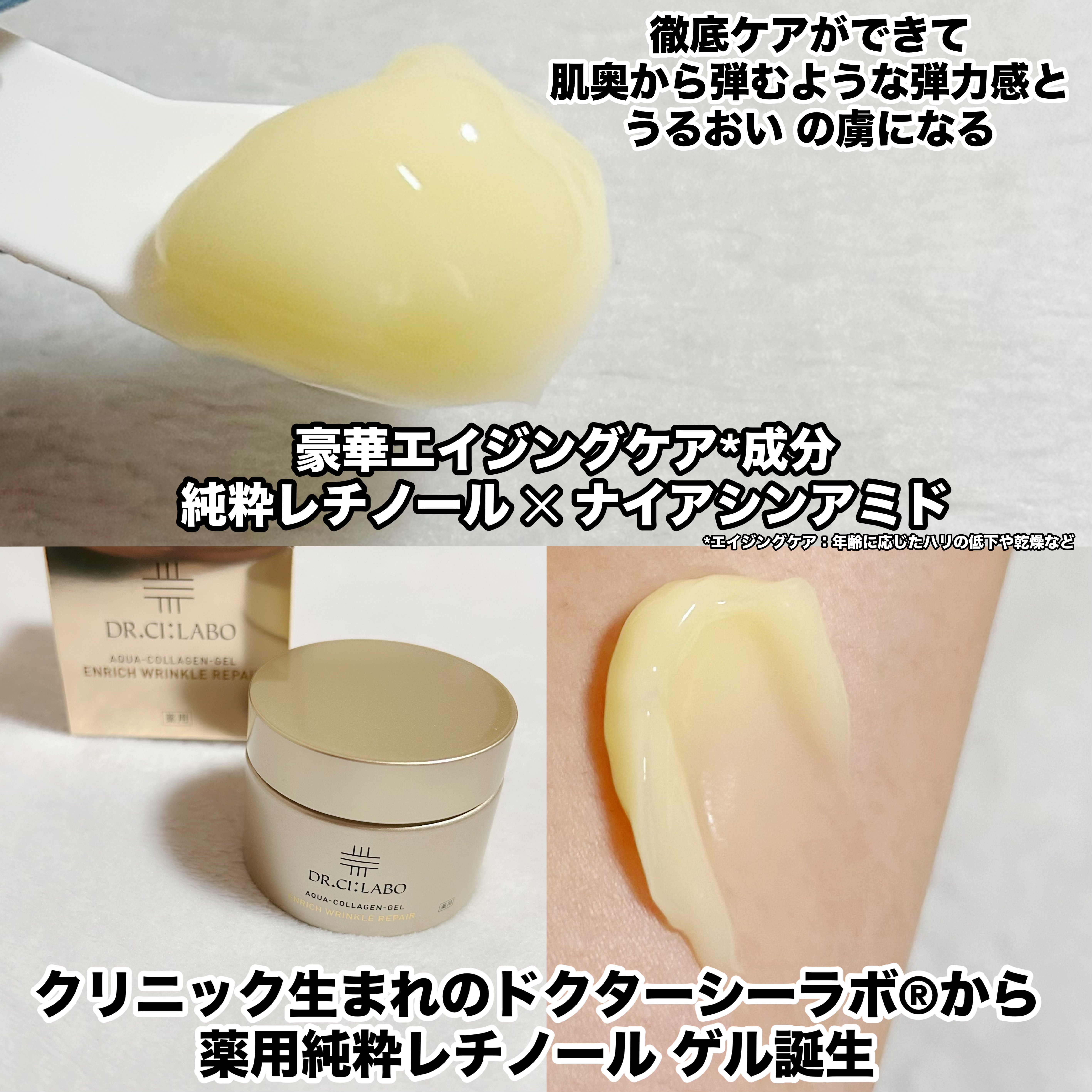 有効成分としてナイアシンアミドを配合し、シワ改善が期待できる薬用エイジングケアゲル。純粋レチノールも配合で、弾むようなハリのあるうるおい肌へ! やわらかなプリンのような、なめらかなテクスチャー。 伸びよくするすると広がるため、重さは感じにくくみずみずしく使える印象✨ 顔全体のしっとりと使えるので、さっとケアしたい方やハリのある肌を目指す方におすすめです。