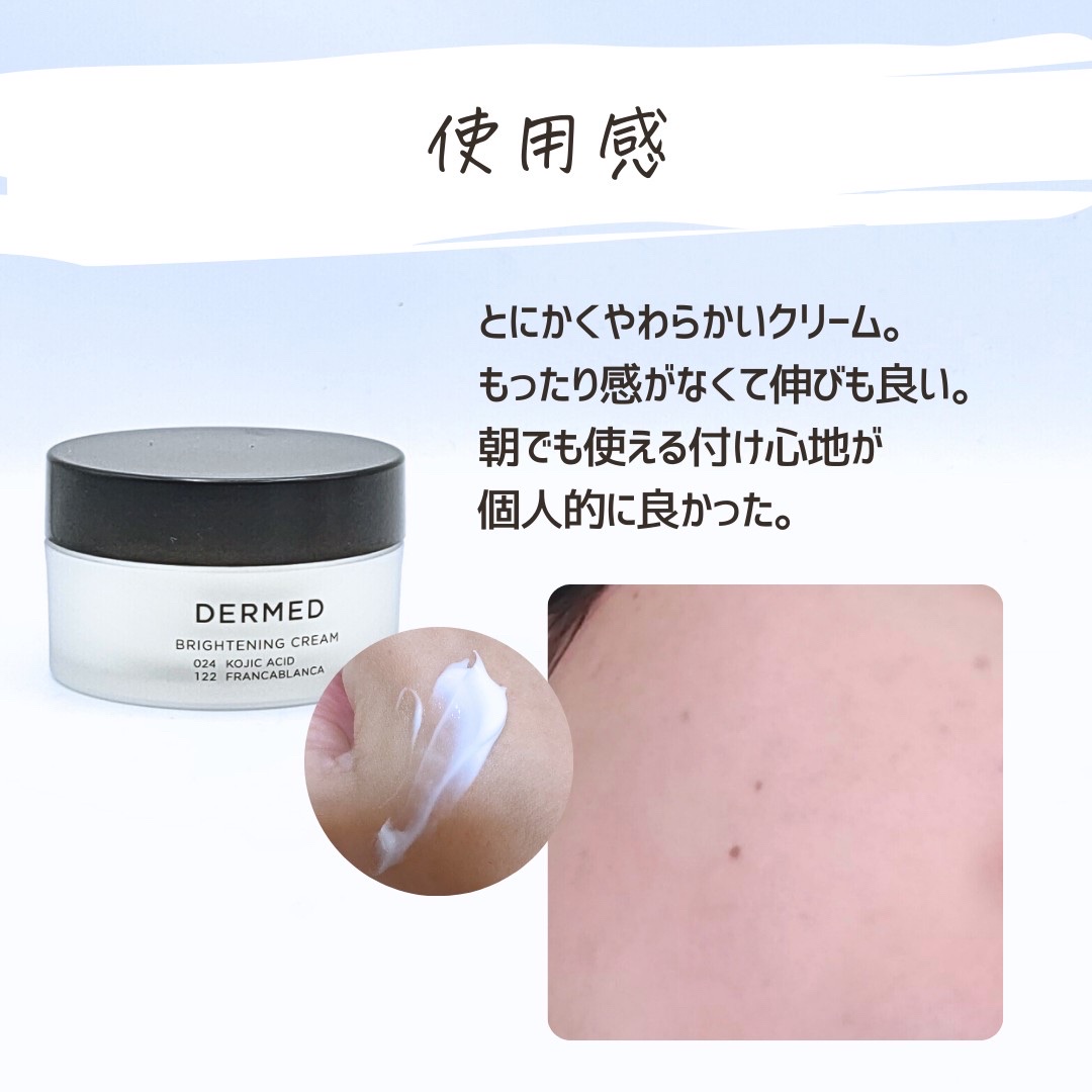 デルメッドのブライトニングクリームよかったよ🙌 知らないって人が多いかもだけど、それもそのはず。コスメブランドに成分を卸す製薬会社発なんだって🥺 コウジ酸ってシミのもととなるメラニン生成に先回りアプローチしてくれるらしいよ👏✨ 続けやすいよう使用感にもすごくこだわっていて朝のメイク前にも使える軽いテクスチャーが嬉しい☺️