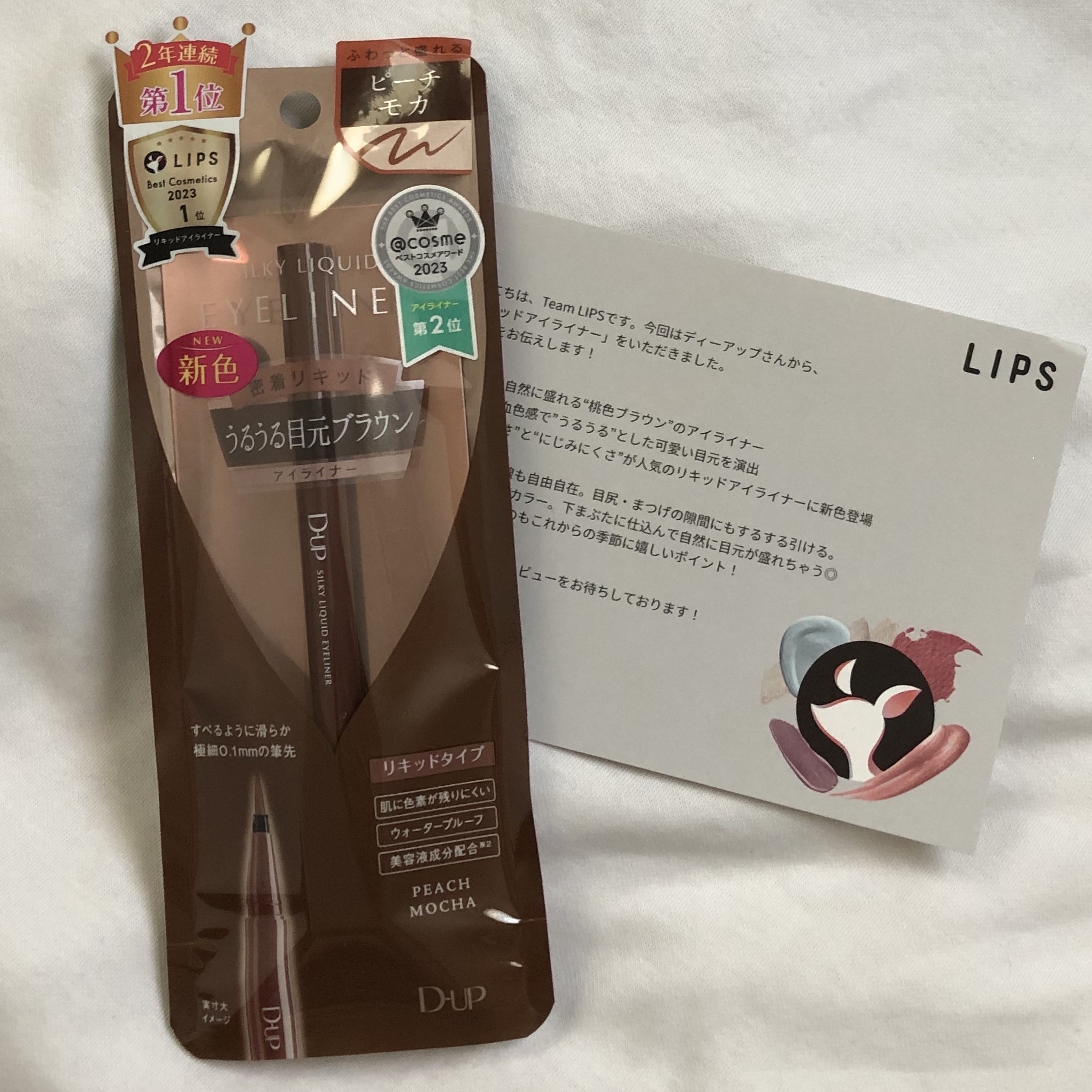 D-UPシルキーリキッドアイライナーWPチャコールモカディーアップさまからLIPSさまを通じていただきましした以前、シフォンブラウンを使ったことがあり、書きやすく気に入っていましたブラックよりは肌なじみがよく、茶色より黒に近く、くっきりとした...
