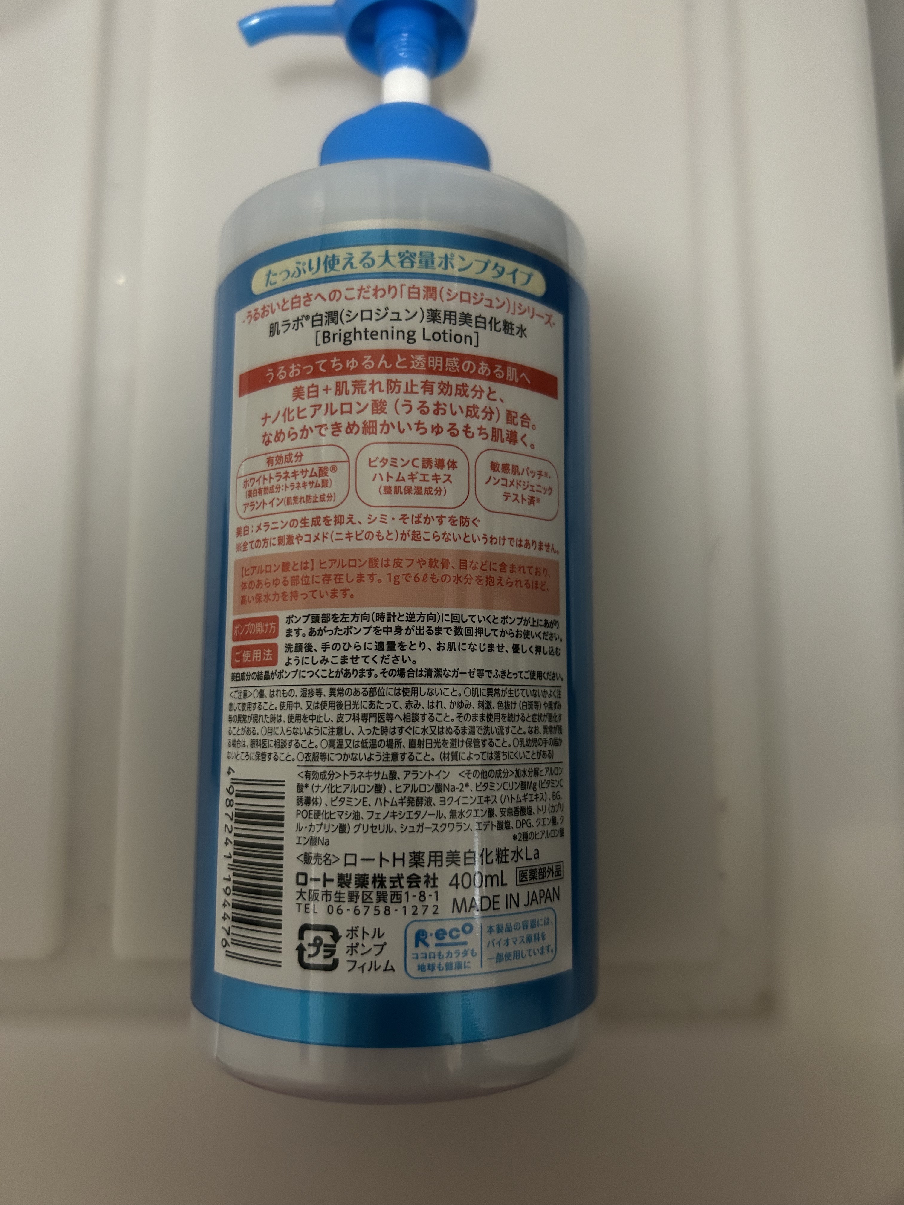 - <ボトル 170ml> 有効成分 トラネキサム酸、アラントイン その他の成分 加水分解ヒアルロン酸(ナノ化ヒアルロン酸)、ヒアルロン酸Na-2、ビタミンCリン酸Mg (ビタミンC誘導体)、ビタミンE、ハトムギ発酵液、ヨクイニンエキス(ハトムギエキス)、BG、POE硬化ヒマシ油、フェノキシエタノール、無水クエン酸、安息香酸塩、トリ(カプリル・カプリン酸) グリセリル、シュガースクワラン、エデト酸塩、DPG、クエン酸、クエン酸Na <つめかえ用 170ml> 有効成分 トラネキサム酸、アラントイン その他の成分 加水分解ヒアルロン酸(ナノ化ヒアルロン酸)、ヒアルロン酸Na-2、ビタミンCリン酸Mg (ビタミンC誘導体)、ビタミンE、ハトムギ発酵液、ヨクイニンエキス(ハトムギエキス)、BG、POE硬化ヒマシ油、フェノキシエタノール、無水クエン酸、安息香酸塩、トリ(カプリル・カプリン酸) グリセリル、シュガースクワラン、エデト酸塩、DPG、クエン酸、クエン酸Na <大容量ポンプ 400ml> 有効成分 トラネキサム酸、アラントイン その他の成分 加水分解ヒアルロン酸(ナノ化ヒアルロン酸)、ヒアルロン酸Na-2、ビタミンCリン酸Mg (ビタミンC誘導体)、ビタミンE、ハトムギ発酵液、ヨクイニンエキス(ハトムギエキス)、BG、POE硬化ヒマシ油、フェノキシエタノール、無水クエン酸、安息香酸塩、トリ(カプリル・カプリン酸) グリセリル、シュガースクワラン、エデト酸塩、DPG、クエン酸、クエン酸Na