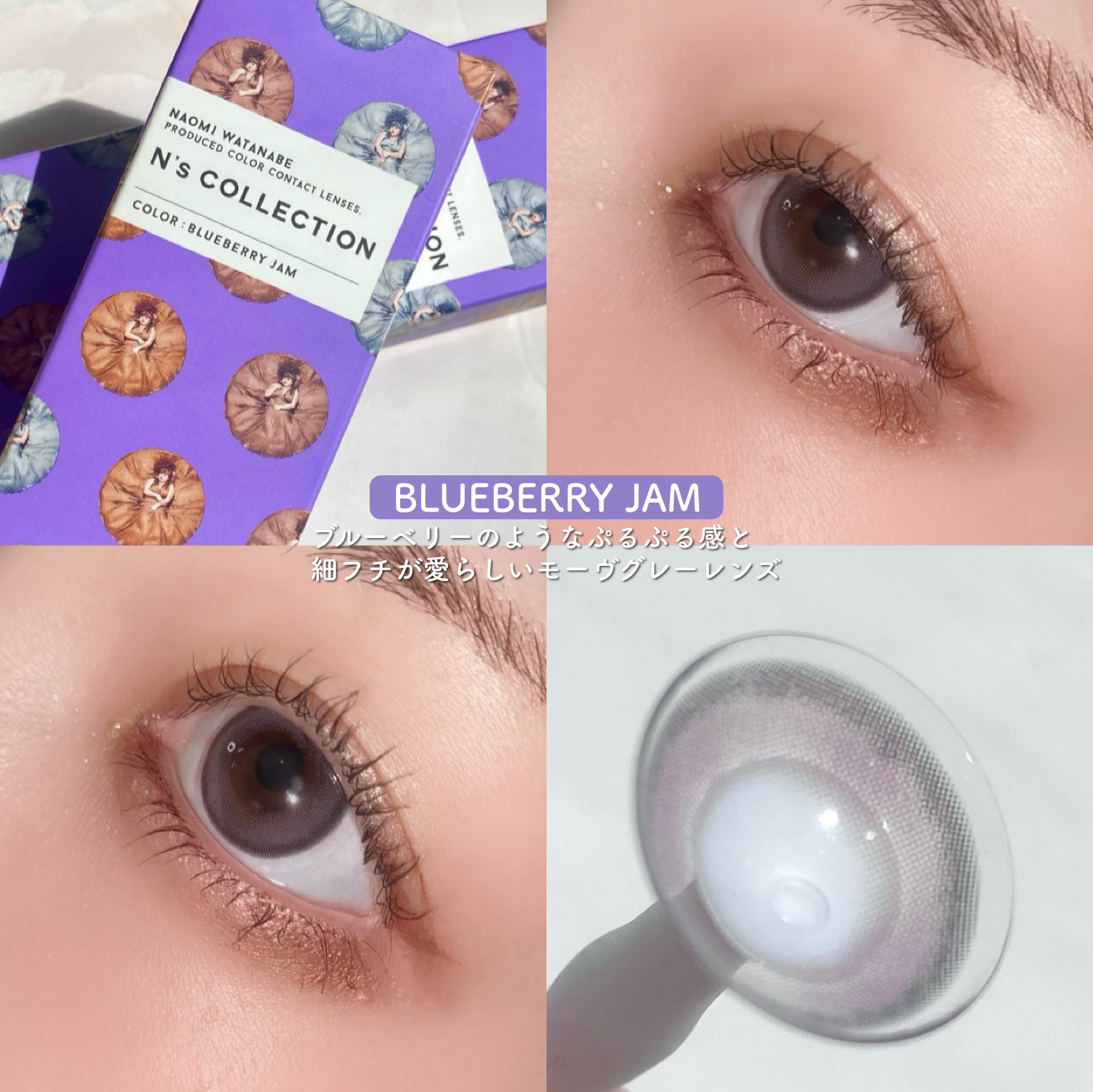 鮮やかなライトブルーとブラックのコントラストが煌めいて高発色な水光グラデーションと海の波のようなデザイン性が唯一無二の瞳に。 高発色なのにマイルドなカラーでつけやすい! ブルーベリーのようなぷるぷる感と細フチが愛らしいモーヴグレーレンズ♡