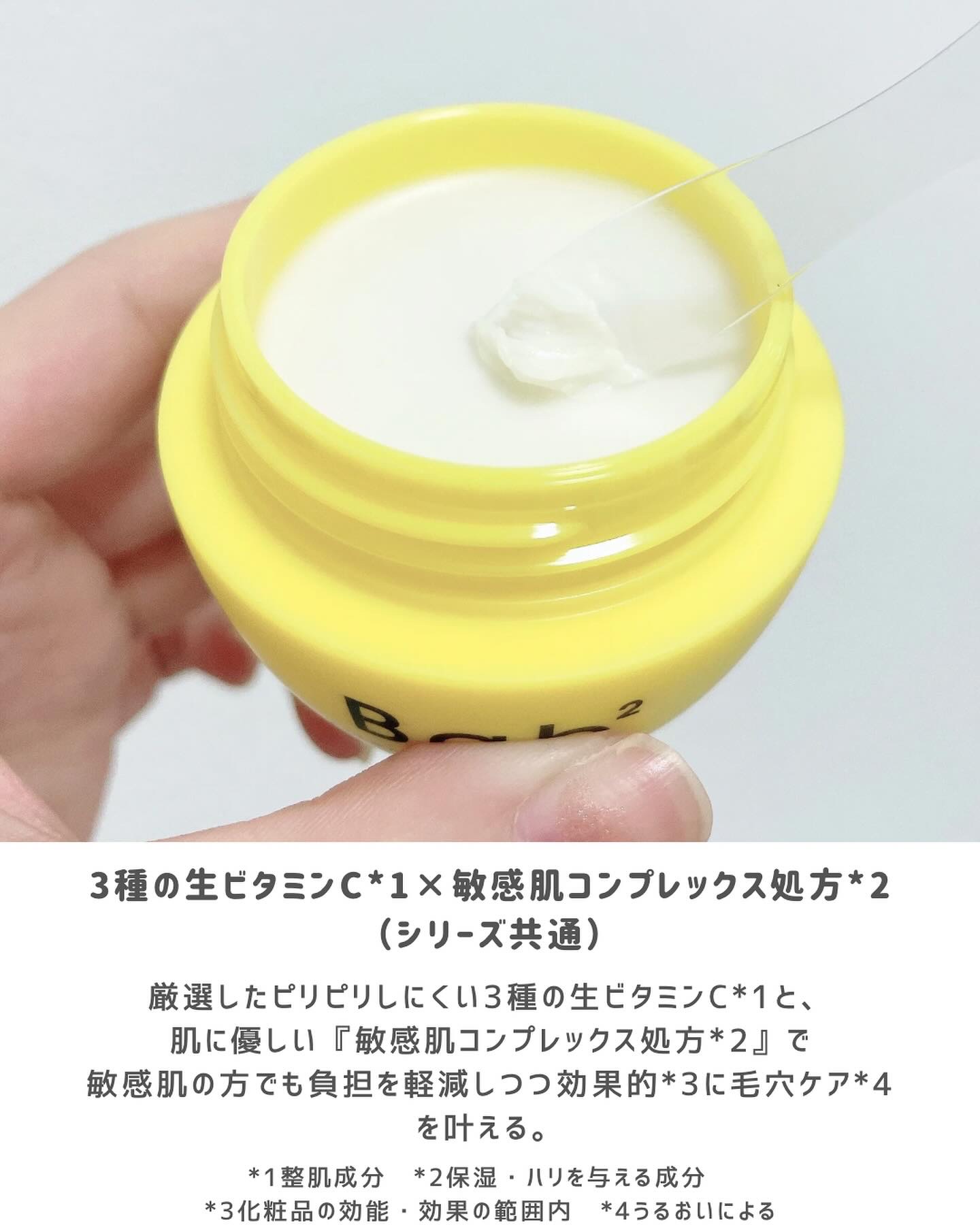 - ①うるおいを閉じ込め、ベタつかない高保湿美容バーム【モイストフィルム構造】 オイルの中にたっぷりの水分を閉じ込めているので、肌にのばすとバームが崩れみずみずしいうるおいがじゅわっとあふれ出し、角層のすみずみまで浸透、オイルが肌表面をしっとりと包み込みうるおいを密封します。高い保湿力を発揮しながらベタつかないテクスチャー。翌朝までしっとりが続きます。 ②美容成分をしっかり届ける【ディープデリバリープログラム】 加水分解ヒアルロン酸*³、2種のコラーゲン*³、ナイアシンアミド*³などの保湿・ハリケア成分にプラスして、表皮に水分を行き渡らせる*⁴役割を担うアクアポリン3の産生をサポートするグリセリルグルコシド*³を配合。さらに3種のペプチドを配合した『ペプチドコンプレックス』*³で肌の奥*⁴までうるおいを届けます。 ③リフトケアも同時に叶える【3Dリフティング処方】 ・素早くハリを与えるクイックリフト*³ ・ハリ感をキープするオシリフト*³ ・皮膚表面に弾力性に優れたフィルムを形成し、上向き肌へアプローチするポリリフト*³ の3成分を効果的に処方し、リフトケアを叶えます ④シリーズ共通特徴【3種の生ビタミンC*¹ 配合 × 敏感肌コンプレックス処方】 毛穴に効果*⁵があるビタミンCは肌に塗った時に刺激を感じやすく、ピリピリするものが多い印象ですが、敏感肌*²の方にもお使いいただけるピリピリしにくい *⁶3種の生ビタミンC*¹(ピュアビタミンC*⁷ 、速攻型ビタミンC*⁷ 、浸透型ビタミンC*⁷)に着目し採用 。特に毛穴が気になる肌にピュアなまま浸透*⁴し、集中ケアを叶えます。さらにバリア機能に着目し3種のセラミド*³、CICA(ツボクサエキス*³)など肌へのやさしさにこだわった成分を配合した「敏感肌コンプレックス処方」を採用し、ゆらぎやすい敏感肌*²を整えながら、しっとりとした毛穴レス*⁸な肌へと導きます。 *1 整肌成分として配合、ビタミンCそのもの、もしくは分解されず角層まで届くよう誘導体化されたビタミンC(3-O-エチルアスコルビン酸、アスコルビン酸、テトラヘキシルデカン酸アスコルビル) *2 すべての方に肌トラブルが起きないわけではありません *3 保湿・ハリを与える成分 *4 角層まで *5 化粧品の効能・効果の範囲内 *6 個人差があります *7 整肌成分 *8 うるおいで毛穴が目立たなくなること 2024年8月31日(土)に各種モールにて先行で新発売