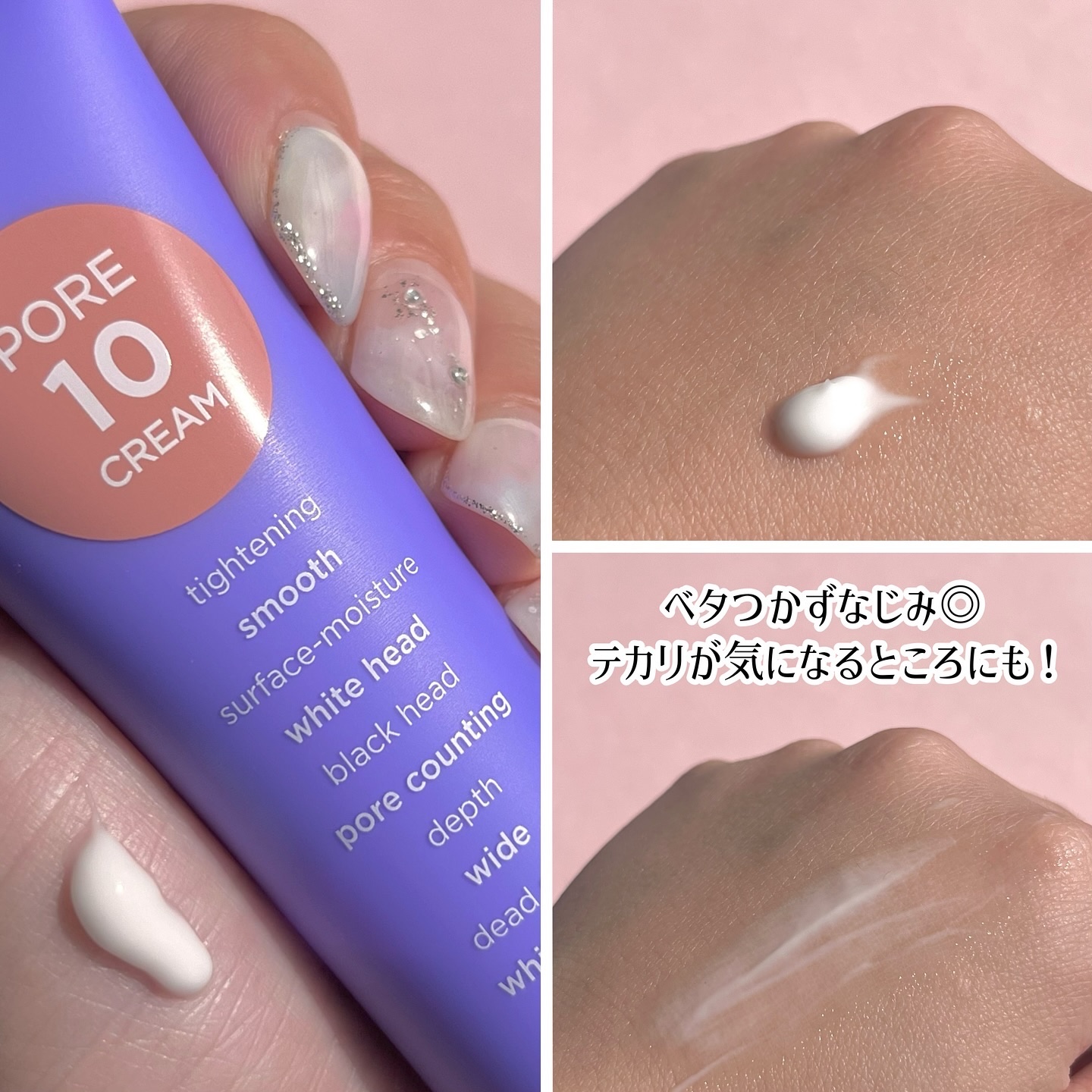 毛穴ケアだけでなく角質ケア、肌の水分補給、肌鎮静も!なんと70枚も入っているんです✨ ポアテンクリームはLIPSの『【2024年最新】韓国毛穴レススキンケア特集!』でも紹介された注目アイテム!毛穴のタイトニング効果に加え、プライマーと肌の水分補給も🌼 クリームは柔らかいけど濃密でしっとり系!毛穴の気になる部分に塗ってからファンデするのがお気に入り💛