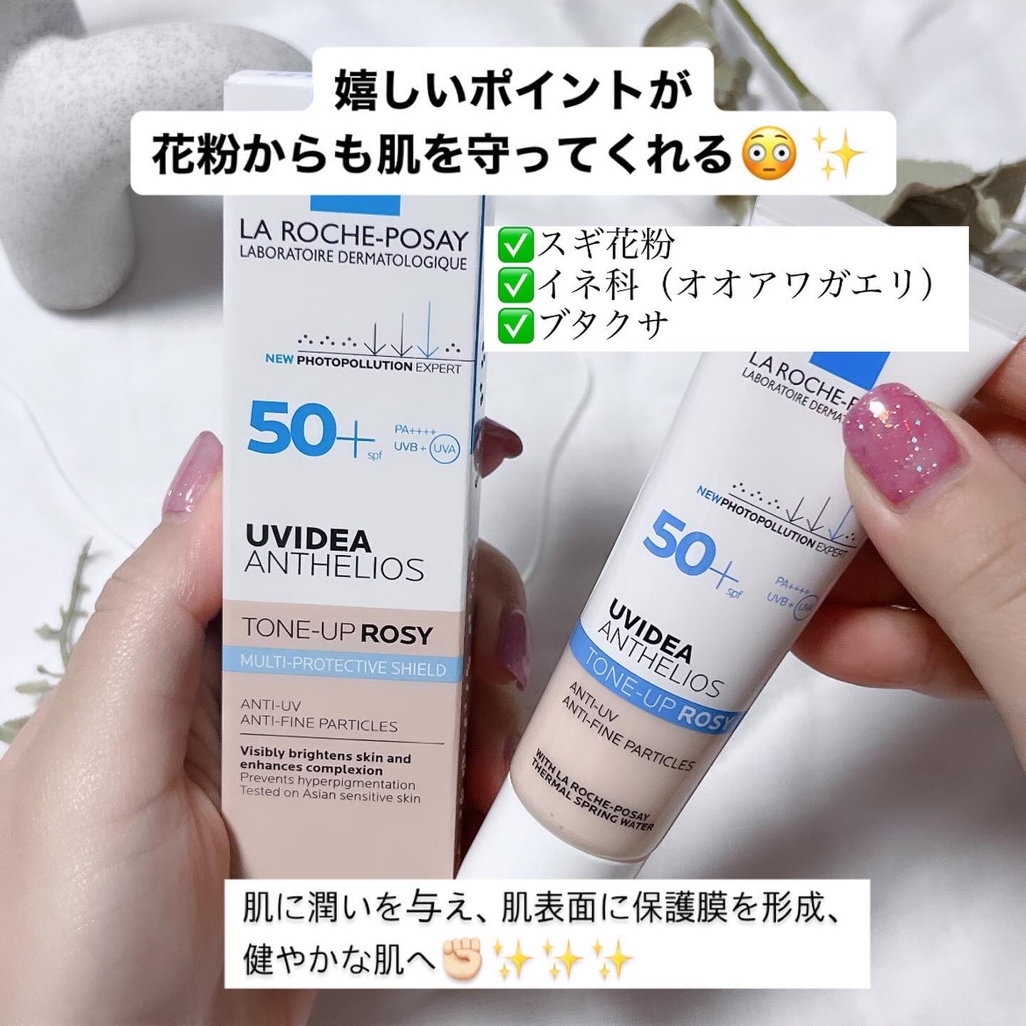 内側から発光してるみたいなツヤ感✨ 【ラ ロッシュ ポゼ/UVイデア XL プロテクショントーンアップ ローズ】 SPF50+/PA++++ スルスル滑らかに伸びる心地よいテクスチャー!! 密着感と保湿感があり、お気に入り◎ トーンアップローズはメイクアップ効果により、血色感を演出してくれる 仕上がりイメージです🌹