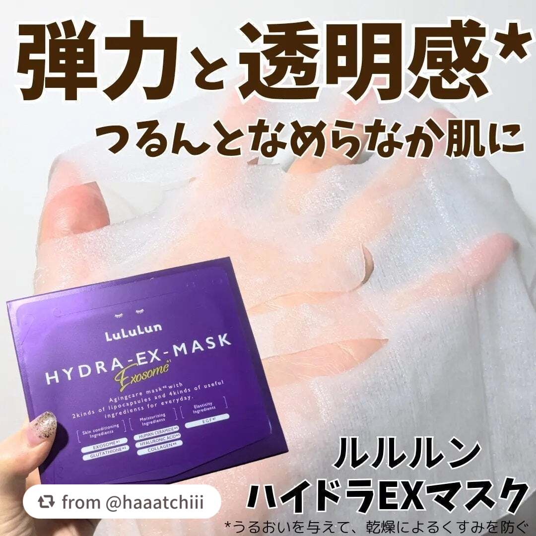- ルルルンハイドラシリーズから新登場。うるおいにプラスするのは、「エクソソーム*1」。先端再生テクノロジーにインスパイアされた、デイリーエイジングケア※1マスクです。白玉※2グルタチオン*2をプラス配合し、弾力・透明感※3・つやめきのあるなめらかなお肌へ導きます。 (*1 整肌成分 ヒト脂肪由来間葉系細胞エクソソーム *2 整肌成分 グルタチオン、アルブチン、レシチン ※1 年齢に応じて肌へうるおいと弾力を与えるケアのこと ※2 白玉のようなキメが整ったツヤのある肌のこと ※3 うるおいを与えて、乾燥によるくすみを防ぐ)