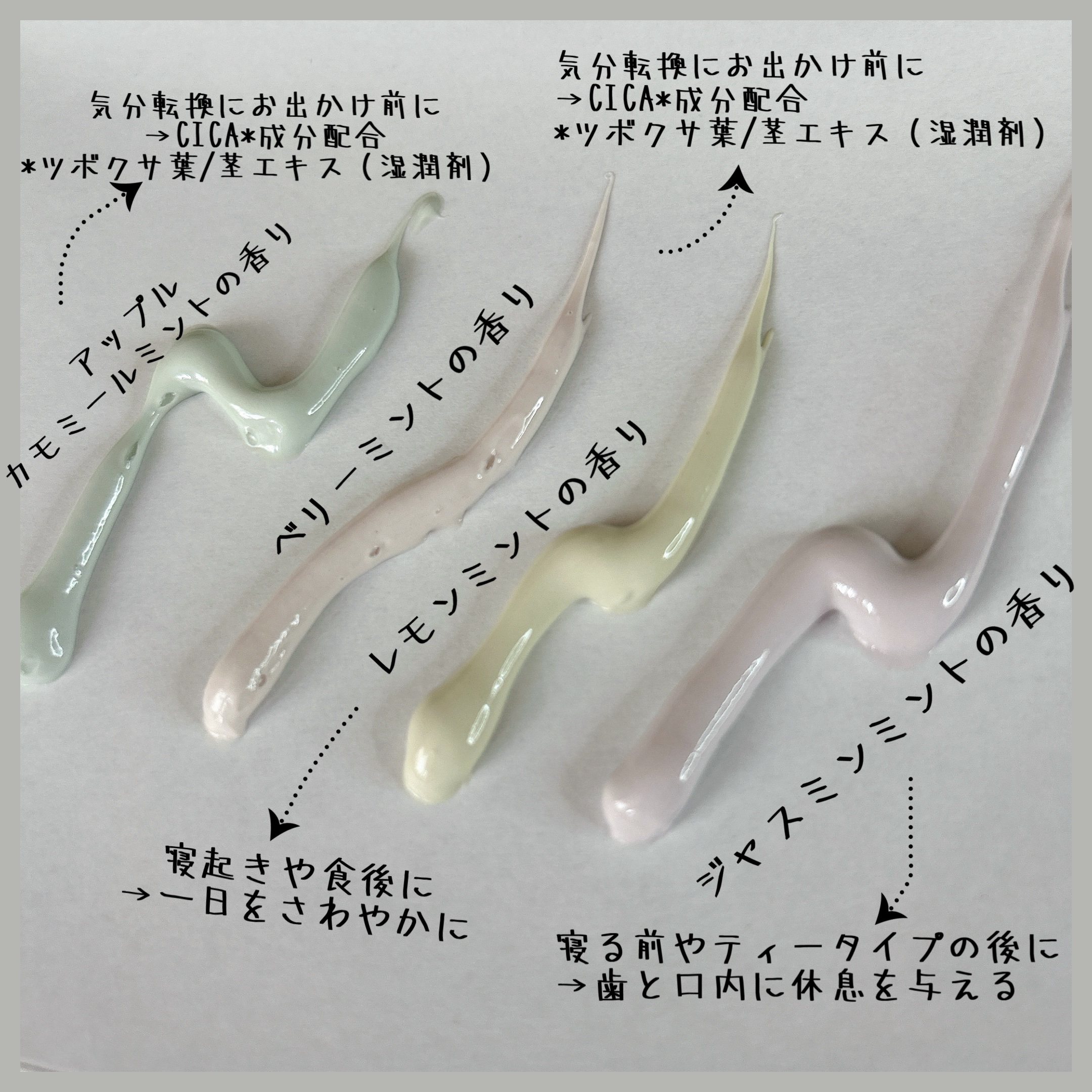 - <ジャスミンミント> カオリン(清掃剤)、ソルビトール(湿潤剤)、水(溶剤)、グリセリン(湿潤剤)、シリカ(清掃剤)、エタノール(溶剤)、セルロースガム(粘結剤)、ラウロイルメチルタウリンNa(発泡剤)、ヒドロキシアパタイト・パール(清掃剤)、乳酸桿菌/セイヨウナシ果汁発酵液・チャ葉エキス(湿潤剤)、メタリン酸Na・ピロリン酸4Na・炭酸水素Na・三リン酸5Na・クエン酸Na(pH調整剤)、サピンヅストリホリアツス果実エキス(清掃助剤)、ライム油・ユーカリ葉油・セージ油・メントール(香味剤)、ベントナイト(増粘剤)、キシリトール・サッカリンNa(甘味剤)、ラウロイルグルタミン酸Na(発泡剤)、PEG-60水添ヒマシ油(可溶化剤)、BG(溶剤)、フェノキシエタノール(防腐剤)、香料(着香剤)、酸化チタン・赤2・黄5・青1(着色剤) <レモンミント> カオリン(清掃剤)、ソルビトール(湿潤剤)、水(溶剤)、グリセリン(湿潤剤)、シリカ(清掃剤)、エタノール(溶剤)、セルロースガム(粘結剤)、ラウロイルメチルタウリンNa(発泡剤)、ヒドロキシアパタイト・パール(清掃剤)、乳酸桿菌/セイヨウナシ果汁発酵液・チャ葉エキス・カミツレ花エキス・セージ葉エキス・シャクヤク根エキス(湿潤剤)、炭酸水素Na・三リン酸5Na・クエン酸Na(pH調整剤)、レモン果皮油・レモングラス油・ユーカリ葉油・ローズマリー葉油・チョウジ葉油・タチジャコウソウ油・メントール(香味剤)、ベントナイト(増粘剤)、キシリトール・サッカリンNa(甘味剤)、ラウロイルグルタミン酸Na(発泡剤)、PEG-60水添ヒマシ油(可溶化剤)、BG(溶剤)、フェノキシエタノール(防腐剤)、香料(着香剤)、酸化チタン・黄4(着色剤) <ベリーミント> カオリン(清掃剤)、ソルビトール(湿潤剤)、水(溶剤)、グリセリン(湿潤剤)、シリカ(清掃剤)、エタノール(溶剤)、セルロースガム(粘結剤)、ラウロイルメチルタウリンNa(発泡剤)、ヒドロキシアパタイト・パール(清掃剤)、乳酸桿菌/セイヨウナシ果汁発酵液・チャ葉エキス・ツボクサ葉/茎エキス・ドクダミエキス(湿潤剤)、炭酸水素Na・三リン酸5Na・クエン酸Na(pH調整剤)、ティーツリー葉油・スペアミント油・ユーカリ葉油・ローズマリー葉油・レモン果皮油・メントール(香味剤)、ベントナイト(増粘剤)、キシリトール・サッカリンNa(甘味剤)、ラウロイルグルタミン酸Na(発泡剤)、PEG-60水添ヒマシ油(可溶化剤)、BG(溶剤)、フェノキシエタノール(防腐剤)、香料(着香剤)、酸化チタン・赤3(着色剤) <アップルカモミールミント> カオリン(清掃剤)、ソルビトール(湿潤剤)、水(溶剤)、グリセリン(湿潤剤)、シリカ(清掃剤)、エタノール(溶剤)、セルロースガム(粘結剤)、ラウロイルメチルタウリンNa(発泡剤)、ヒドロキシアパタイト・パール(清掃剤)、乳酸桿菌/セイヨウナシ果汁発酵液・チャ葉エキス・リンゴ果実水・リンゴ果実エキス・カミツレ花エキス(湿潤剤)、炭酸水素Na・リンゴ酸・三リン酸5Na・クエン酸Na(pH調整剤)、ローマカミツレ花油・スペアミント油・ローズマリー葉油・レモングラス油・ユーカリ葉油・チョウジ葉油・タチジャコウソウ油・メントール(香味剤)、ベントナイト(増粘剤)、キシリトール・サッカリンNa(甘味剤)、ラウロイルグルタミン酸Na(発泡剤)、PEG-60水添ヒマシ油(可溶化剤)、BG(溶剤)、フェノキシエタノール(防腐剤)、香料(着香剤)、酸化チタン・黄4・青1(着色剤)