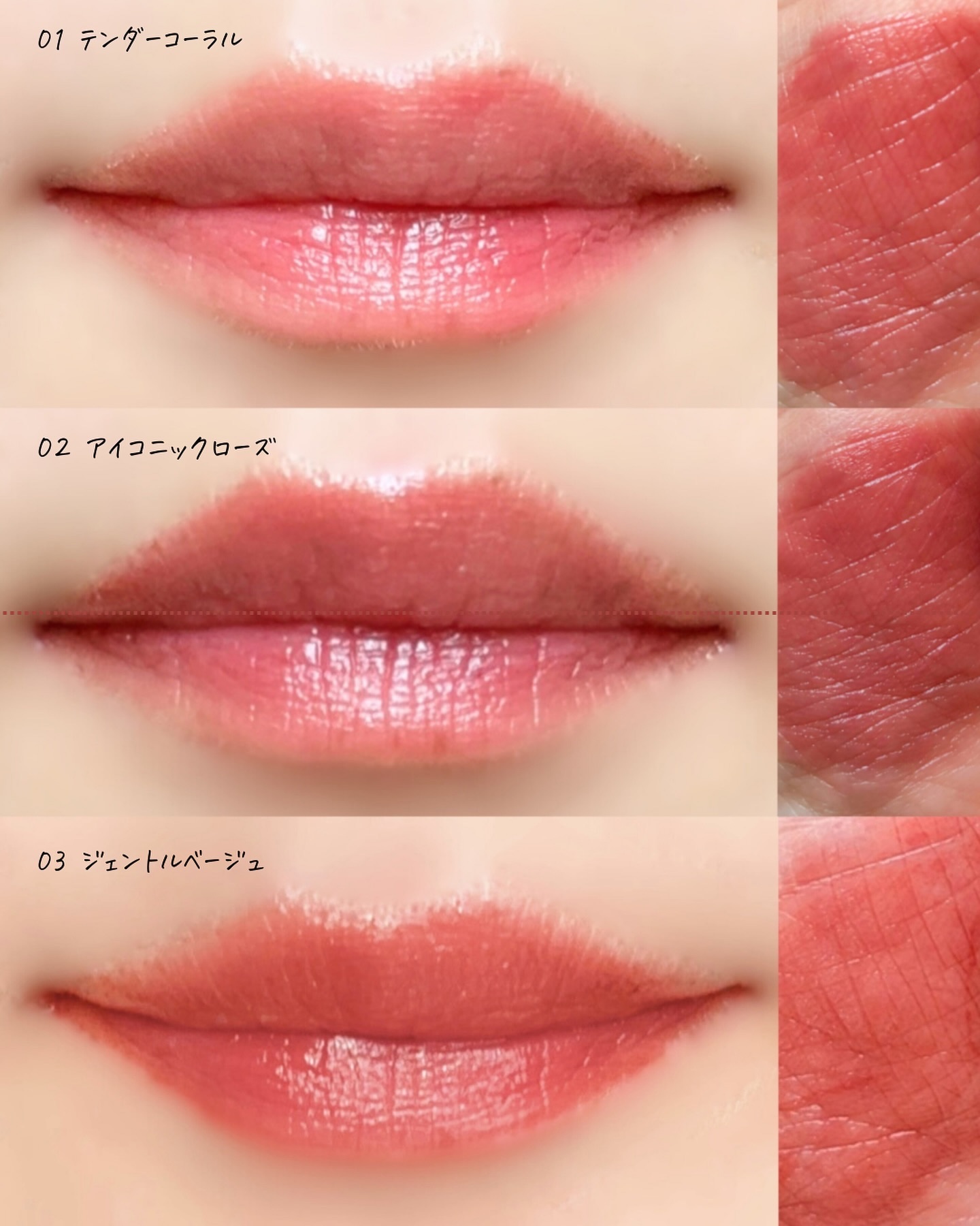 - <01 テンダーコーラル> 水、ダイマージリノール酸ダイマージリノレイルビス(ベヘニル/イソステアリル/フィトステリル)、ビスジグリセリルポリアシルアジペート-2、ジグリセリン、リンゴ酸ジイソステアリル、ジフェニルジメチコン、セチルPEG/PPG-10/1ジメチコン、ペンチレングリコール、トリメチルシロキシケイ酸、カプリリルメチコン、ポリソルベート60、セテアレス-20、ジメチコン、イソドデカン、グリセリン、(アクリル酸ヒドロキシエチル/アクリロイルジメチルタウリンNa)コポリマー、スクワラン、1,2-ヘキサンジオール、ポリアクリレート-13、ポリイソブテン、エチルヘキシルグリセリン、イソステアリン酸ソルビタン、トリイソステアリン酸ポリグリセリル-2、エチレンジアミンジコハク酸3Na、ポリソルベート20、水酸化Al、ポリアクリル酸アンモニウム、BG、アラントイン、ナイアシンアミド、トリ(カプリル酸/カプリン酸)グリセリル、水添レシチン、マカデミア種子油、アブラナステロールズ、ツボクサエキス、レチノール、コレステロール、ラウリン酸ポリグリセリル-10、セラミドNP、ラウロイルグルタミン酸ジ(オクチルドデシル/フィトステリル/ベヘニル)、ステアリン酸水酸化(Al/Mg)、セチルリン酸K、キトサン、クエン酸トリス(テトラメチルヒドロキシピペリジノール)、テトラ(ジ-t-ブチルヒドロキシヒドロケイヒ酸)ペンタエリスリチル、香料、フェノキシエタノール、酸化チタン、黄4、黄5、青1、赤227、赤104(1) <02 アイコニックローズ> 水、ダイマージリノール酸ダイマージリノレイルビス(ベヘニル/イソステアリル/フィトステリル)、ビスジグリセリルポリアシルアジペート-2、ジグリセリン、リンゴ酸ジイソステアリル、ジフェニルジメチコン、セチルPEG/PPG-10/1ジメチコン、ペンチレングリコール、トリメチルシロキシケイ酸、カプリリルメチコン、ポリソルベート60、セテアレス-20、ジメチコン、イソドデカン、グリセリン、(アクリル酸ヒドロキシエチル/アクリロイルジメチルタウリンNa)コポリマー、スクワラン、1,2-ヘキサンジオール、ポリアクリレート-13、ポリイソブテン、エチルヘキシルグリセリン、イソステアリン酸ソルビタン、エチレンジアミンジコハク酸3Na、ポリソルベート20、水酸化Al、ポリアクリル酸アンモニウム、BG、アラントイン、ナイアシンアミド、トリ(カプリル酸/カプリン酸)グリセリル、水添レシチン、マカデミア種子油、アブラナステロールズ、ツボクサエキス、レチノール、コレステロール、ラウリン酸ポリグリセリル-10、セラミドNP、ラウロイルグルタミン酸ジ(オクチルドデシル/フィトステリル/ベヘニル)、ステアリン酸水酸化(Al/Mg)、セチルリン酸K、キトサン、クエン酸トリス(テトラメチルヒドロキシピペリジノール)、テトラ(ジ-t-ブチルヒドロキシヒドロケイヒ酸)ペンタエリスリチル、香料、フェノキシエタノール、酸化チタン、黄4、黄5、青1、赤104(1)、赤227 <03 ジェントルベージュ> 水、ダイマージリノール酸ダイマージリノレイルビス(ベヘニル/イソステアリル/フィトステリル)、リンゴ酸ジイソステアリル、ビスジグリセリルポリアシルアジペート-2、ジグリセリン、ジフェニルジメチコン、セチルPEG/PPG-10/1ジメチコン、ペンチレングリコール、トリメチルシロキシケイ酸、カプリリルメチコン、ポリソルベート60、セテアレス-20、ジメチコン、イソドデカン、グリセリン、(アクリル酸ヒドロキシエチル/アクリロイルジメチルタウリンNa)コポリマー、スクワラン、1,2-ヘキサンジオール、ポリアクリレート-13、ポリイソブテン、エチルヘキシルグリセリン、イソステアリン酸ソルビタン、トリイソステアリン酸ポリグリセリル-2、エチレンジアミンジコハク酸3Na、ポリソルベート20、水酸化Al、ポリアクリル酸アンモニウム、BG、アラントイン、ナイアシンアミド、トリ(カプリル酸/カプリン酸)グリセリル、水添レシチン、マカデミア種子油、アブラナステロールズ、ツボクサエキス、レチノール、コレステロール、ラウリン酸ポリグリセリル-10、セラミドNP、ラウロイルグルタミン酸ジ(オクチルドデシル/フィトステリル/ベヘニル)、ステアリン酸水酸化(Al/Mg)、セチルリン酸K、キトサン、クエン酸トリス(テトラメチルヒドロキシピペリジノール)、テトラ(ジ-t-ブチルヒドロキシヒドロケイヒ酸)ペンタエリスリチル、香料、フェノキシエタノール、酸化チタン、酸化鉄、黄4、黄5、青1、赤104(1)、赤227 <04 ブリスフルピンク> 水、ダイマージリノール酸ダイマージリノレイルビス(ベヘニル/イソステアリル/フィトステリル)、ビスジグリセリルポリアシルアジペート-2、ジグリセリン、リンゴ酸ジイソステアリル、ジフェニルジメチコン、セチルPEG/PPG-10/1ジメチコン、ペンチレングリコール、トリメチルシロキシケイ酸、カプリリルメチコン、ポリソルベート60、セテアレス-20、ジメチコン、イソドデカン、グリセリン、(アクリル酸ヒドロキシエチル/アクリロイルジメチルタウリンNa)コポリ