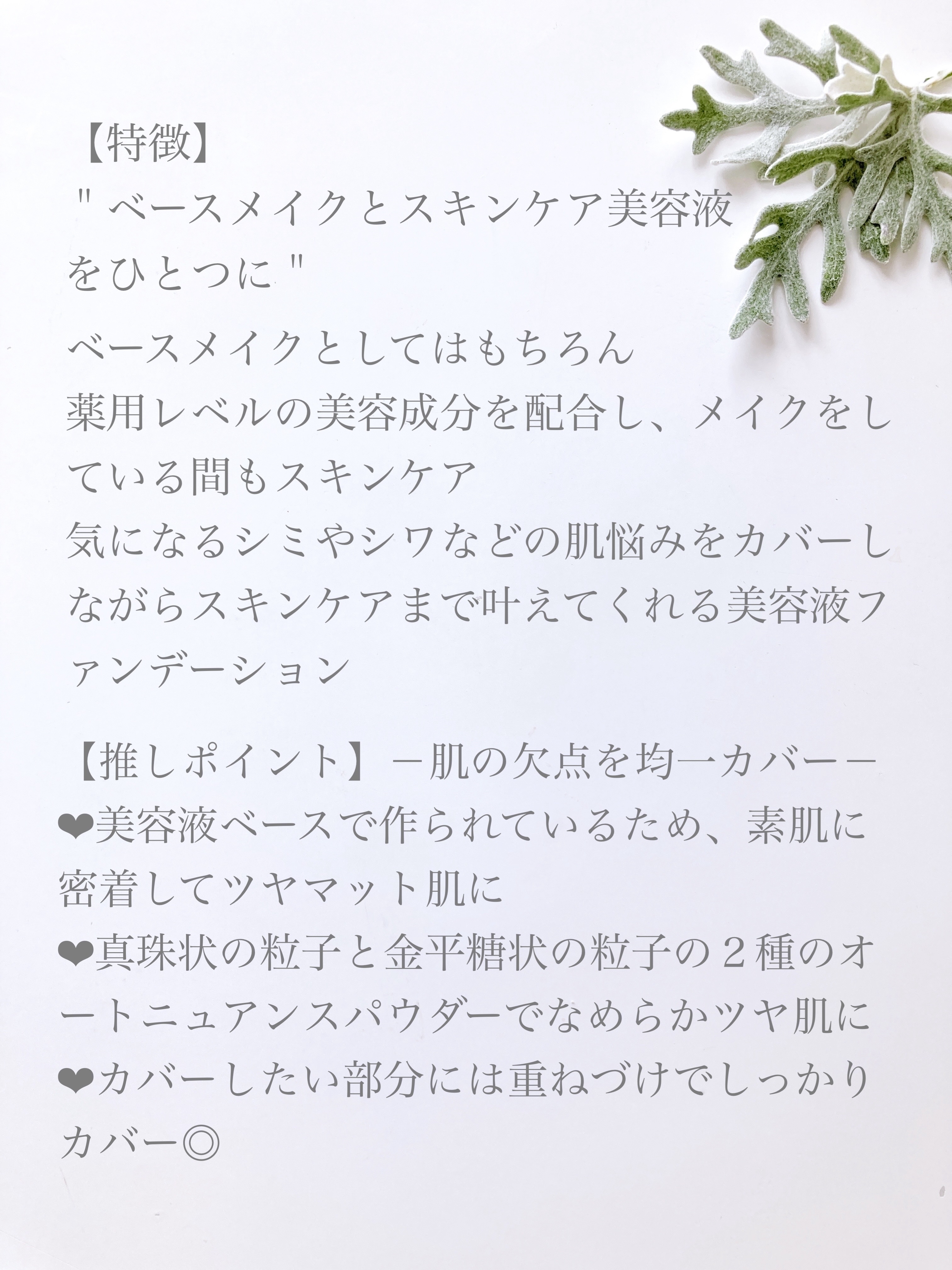美容液・薬用シワ改善・化粧下地・コンシーラーと嬉しいとこどりのファンデーション 日焼け止め(SPF38/PA+++)まで ベタベタ感もなくスルスル伸びるので厚塗りにならない でもキレイな仕上がり カバー力も程よくありコンシーラーいらずのファンデーションなのでメイクの短縮にもなっちゃう