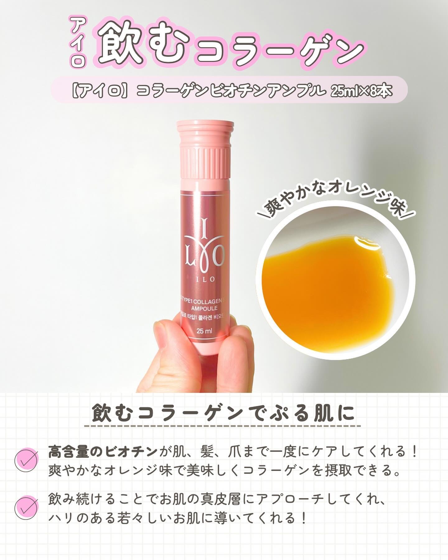 アイロホワイタチオン グルタチオン・ビタミンC・ビタミンEとホワイトトマトが配合された飲む日焼け止め💖 ホワイトトマトとはフィトエン&フィトフルエン含有量を豊富に配合しており、一般のトマトの5倍紫外線対策が出来る凄いトマトで、抗酸化・メラニン合成を抑制して肌のトーンをトーンアップしてくれるみたい💡 2024年7月オリーブヤング全体ランキング1位を獲得した飲むコラーゲン。I型コラーゲンは真皮の90%を構成するコラーゲンでアイロタイプⅠコラーゲンビオチンアンプルにはⅠ型コラーゲンが3000mgも配合😳