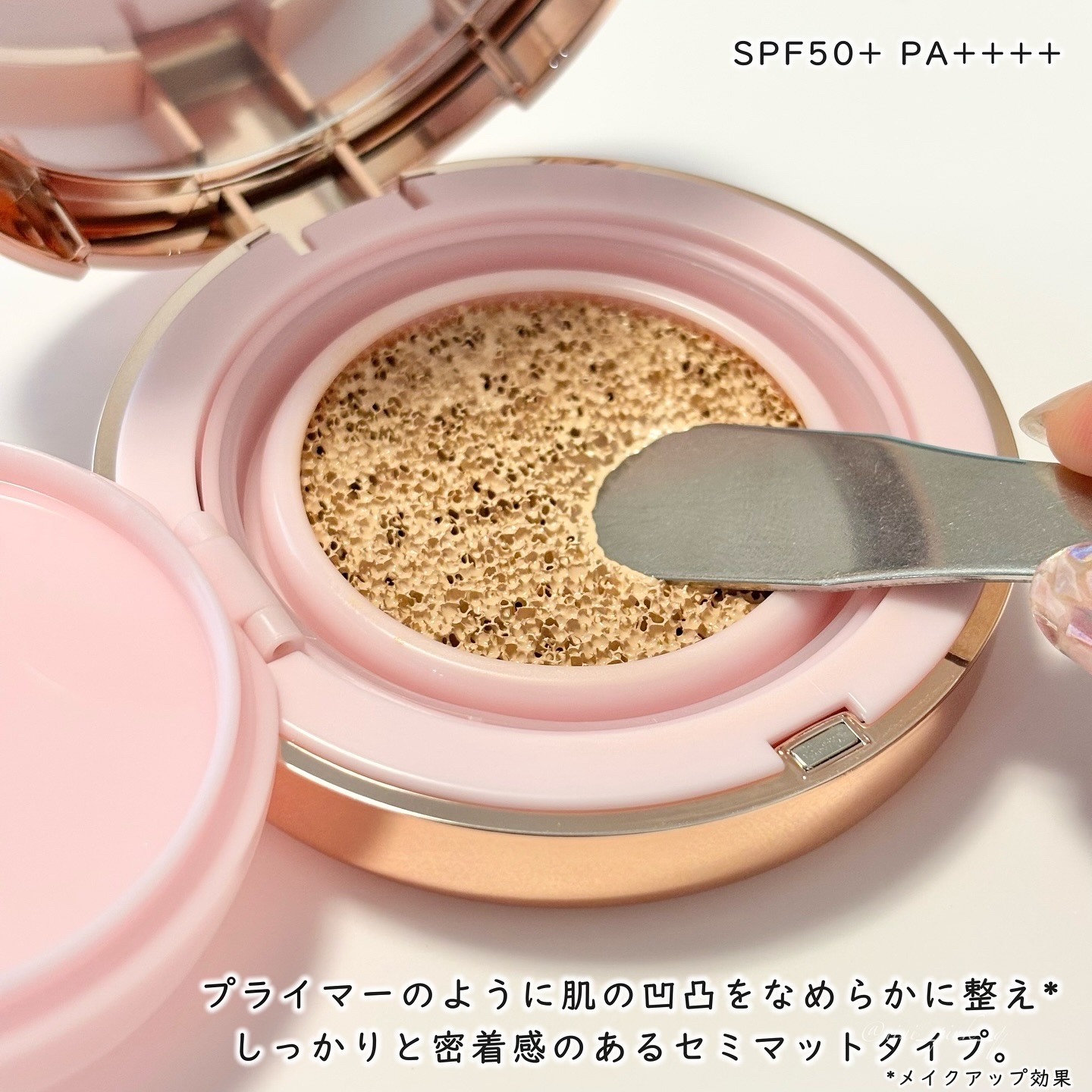 混合肌や敏感肌におすすめのピンクティーツリーカバープライマークッション カラーは『21号』を使用しました! SPF50+ PA++++の高UVカットのクッションファンデーション うるおい感がありながら、ピタッと肌に密着してくれるテクスチャ