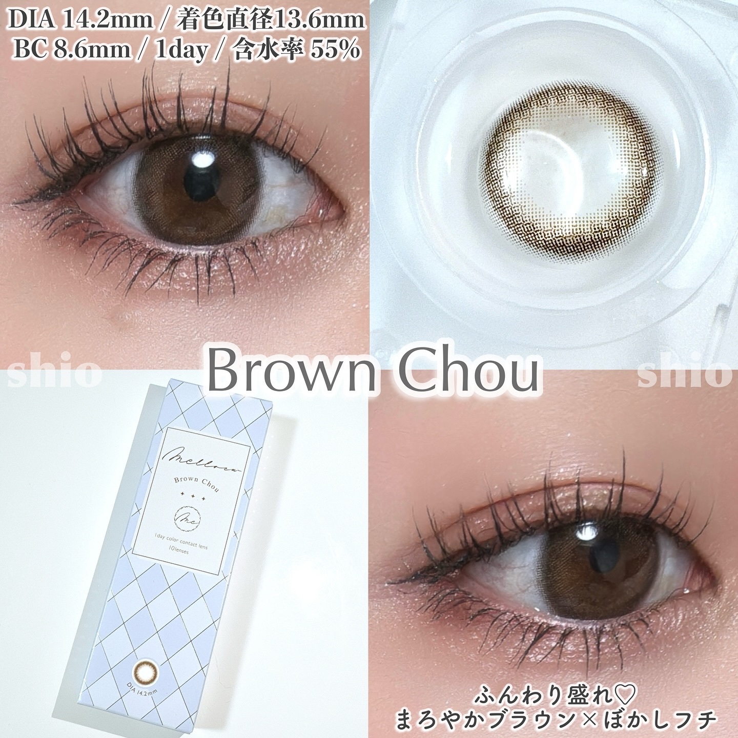 - ※2025年6月以降、商品パッケージ裏面・側面の一部表記を順次変更いたします。尚、これにかかる商品の交換・返品は承っておりません。 ふわっと漂う多幸感 キラキラとした瞳 そんな多くの人が憧れる印象はmelloewで作れる! 王道盛れからあざと盛れまでどんな盛れも叶うラインナップで瞳をコーディネート☆ Cotton Ring(コットンリング) DIA14.2㎜/着色直径13.5㎜ 溶け込みベージュ×くっきりフチ 写真でもリアルでも盛れちゃう♪ Silky Pearl(シルキーパール) DIA14.2㎜/着色直径13.5㎜ ツヤっぽベージュ×細フチ 垢抜けた印象にしたい方におすすめ♪ Truffle Gray(トリュフグレー) DIA14.2㎜/着色直径13.4㎜ おしゃれモテ♡ 濃いめグレージュ×ぼかし細フチ 品よく盛れるお嬢様な瞳に Pure Nude(ピュアヌード) DIA14.2㎜/着色直径13.2㎜ 絶妙ヌーディカラー×グラデフチ お仕事やカラコン初心者にもおすすめ♪ Brown Chou(ブラウンシュー) DIA14.2㎜/着色直径13.6㎜ まろやかブラウン×ぼかしフチ 日常使いにもおすすめ♪ Mocha Powder(モカパウダー) DIA14.2㎜/着色直径13.6㎜ リピ確モテ♡ ふわふわモカ×くりっとフチ 絶対盛れちゃう甘い瞳に Love Cacao(ラブカカオ) DIA14.2㎜/着色直径13.0㎜ 清楚モテ♡ とろふわチョコレート×こっそりフチ バレずに盛れちゃう瞳に カラーコンタクトレンズの不適正使用による眼障害の危険性等などがあります。 ●コンタクトレンズは高度管理医療機器です。不十分な洗浄・消毒など不適切なケアや、長時間・交換期間を超えた装用により、アレルギー性結膜炎、角膜感染症、角膜潰瘍等の重篤な眼障害が発生する危険性があります ●ご使用前に取扱説明書を確認してください 使用上の留意事項 ●眼科医院等を受診してからお求めください ●眼に異常を感じたら直ちにレンズ使用を中止し、お近くの眼科等で診察を受けてください ●医師の指示にしたがってご使用ください ●コンタクトレンズを装用する場合、自覚症状がなくても、眼科医院等での定期検査を受けてください ●レンズに不具合がある場合は使用しないでください