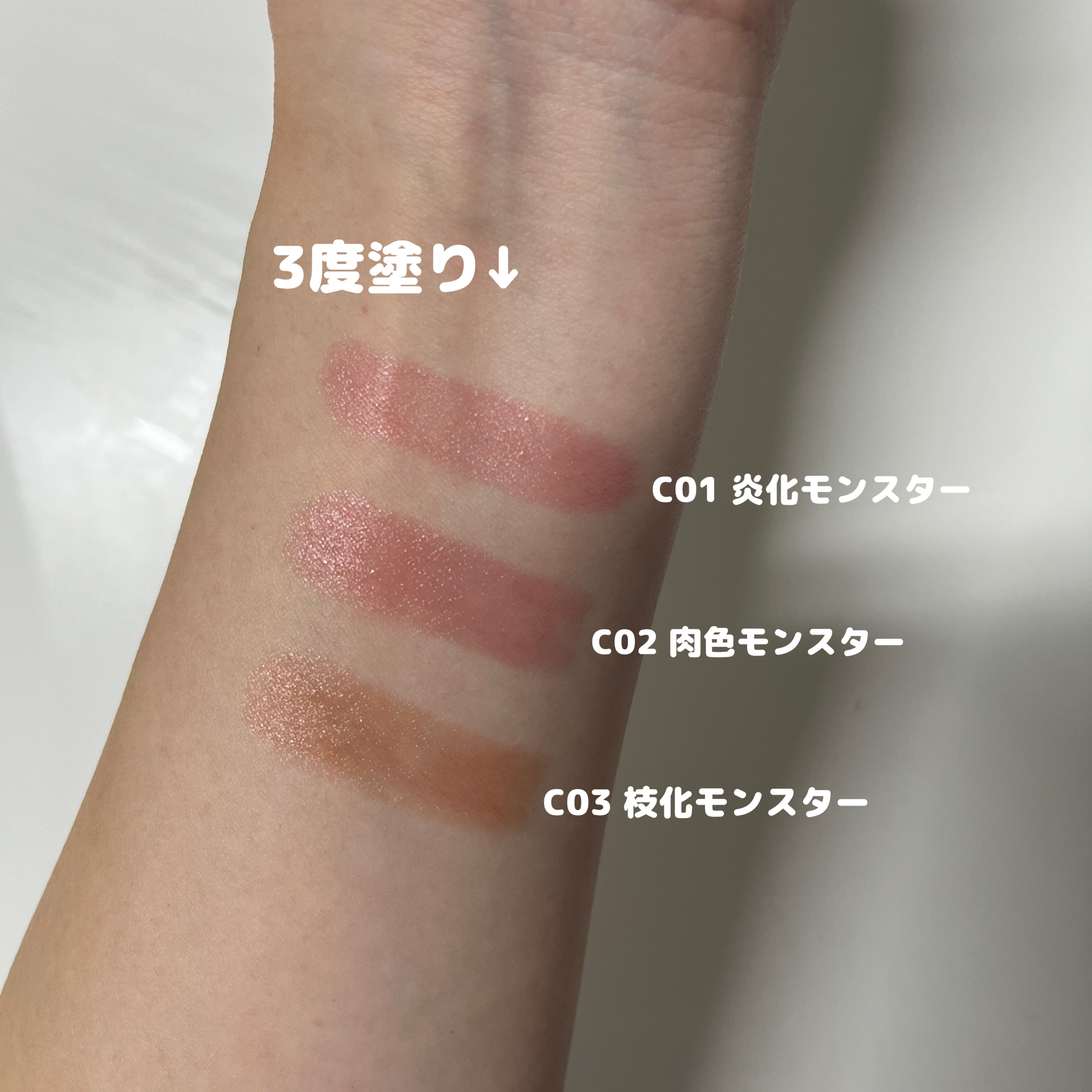 - <C01 炎化モンスター> テトライソステアリン酸ジペンタエリスリチル、オクチルドデカノール、トリ(カプリル酸/カプリン酸)グリセリル、イソノナン酸イソトリデシル、ラウロイルグルタミン酸ジ(フィトステリル/オクチルドデシル)、ビスアルキル(C16-18)グリセリルウンデシルジメチコン、パラフィン、水添ポリイソブテン、合成ワックス、ダイマージリノール酸(フィトステリル/イソステアリル/セチル/ステアリル/ベヘニル)、ラウロイルグルタミン酸ジ(オクチルドデシル/フィトステリル/ベヘニル)、マイクロクリスタリンワックス、水添マイクロクリスタリンワックス、トコフェロール、ホホバ種子油、オリーブ果実油、アーモンド油、ヒドロキシステアリン酸エチルヘキシル、(エチレン/プロピレン)コポリマー、ポリエチレン、(+/-)(チタン/酸化チタン)焼結物、マイカ、ラウロイルアスパラギン酸Na、ラウロイルリシン、塩化亜鉛、酸化鉄、硫酸Ba、トリイソステアリン酸イソプロピルチタン、赤202 <C02 肉色モンスター> テトライソステアリン酸ジペンタエリスリチル、オクチルドデカノール、トリ(カプリル酸/カプリン酸)グリセリル、イソノナン酸イソトリデシル、ラウロイルグルタミン酸ジ(フィトステリル/オクチルドデシル)、ビスアルキル(C16-18)グリセリルウンデシルジメチコン、パラフィン、水添ポリイソブテン、合成ワックス、ダイマージリノール酸(フィトステリル/イソステアリル/セチル/ステアリル/ベヘニル)、ラウロイルグルタミン酸ジ(オクチルドデシル/フィトステリル/ベヘニル)、マイクロクリスタリンワックス、水添マイクロクリスタリンワックス、トコフェロール、ホホバ種子油、オリーブ果実油、アーモンド油、ヒドロキシステアリン酸エチルヘキシル、(エチレン/プロピレン)コポリマー、ポリエチレン、ジメチコン、(+/-)(チタン/酸化チタン)焼結物、マイカ、ラウロイルアスパラギン酸Na、ラウロイルリシン、塩化亜鉛、酸化チタン、酸化鉄、水酸化Al、硫酸Ba、トリイソステアリン酸イソプロピルチタン、赤202 <C03 枝化モンスター> テトライソステアリン酸ジペンタエリスリチル、オクチルドデカノール、トリ(カプリル酸/カプリン酸)グリセリル、イソノナン酸イソトリデシル、ラウロイルグルタミン酸ジ(フィトステリル/オクチルドデシル)、ビスアルキル(C16-18)グリセリルウンデシルジメチコン、パラフィン、水添ポリイソブテン、合成ワックス、ダイマージリノール酸(フィトステリル/イソステアリル/セチル/ステアリル/ベヘニル)、ラウロイルグルタミン酸ジ(オクチルドデシル/フィトステリル/ベヘニル)、マイクロクリスタリンワックス、水添マイクロクリスタリンワックス、トコフェロール、ホホバ種子油、オリーブ果実油、アーモンド油、ヒドロキシステアリン酸エチルヘキシル、(エチレン/プロピレン)コポリマー、ポリエチレン、ジメチコン、(+/-)(チタン/酸化チタン)焼結物、マイカ、ラウロイルアスパラギン酸Na、ラウロイルリシン、塩化亜鉛、酸化チタン、酸化鉄、水酸化Al、硫酸Ba、トリイソステアリン酸イソプロピルチタン、赤202