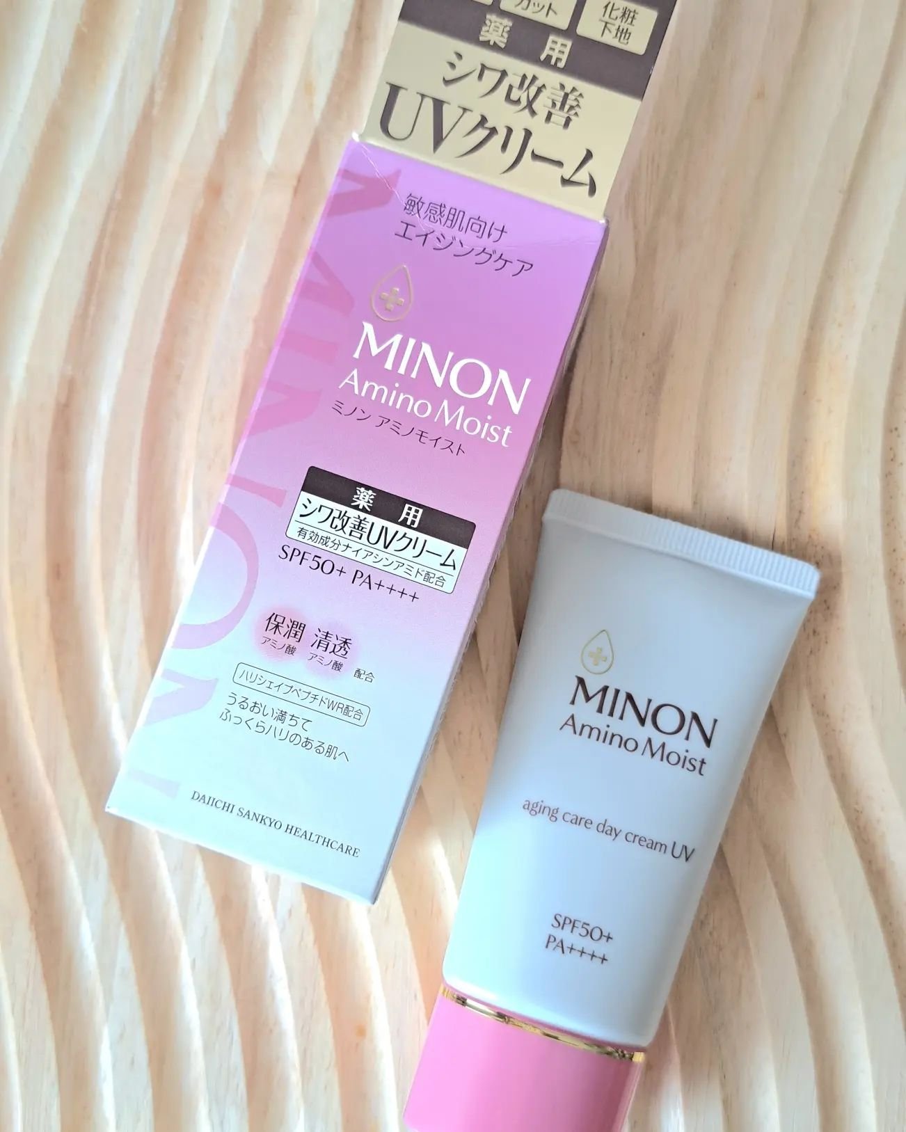 - 【シワ改善もできるUVクリーム】 SPF50+PA++++ シワ改善×UVカットが出来る薬用シワ改善UVクリーム。これ1本で美容クリーム・UVカット・化粧下地の3役。 シワ改善&しみ*予防成分「ナイアシンアミド」、肌あれ予防成分「グリチルリチン酸2K」配合。紫外線吸収剤&酸化亜鉛フリーで敏感肌を考えた処方。自然な輝きを放つ、やわらかなテクスチャーの化粧下地、見る角度で反射色が変わる「艶肌ダブルカラーパウダー」配合で自然な立体感を演出。 エイジングケア:年齢に応じたお手入れケア *メラニンの生成を抑え、しみ・そばかすを防ぐ (販売名:ミノンアミノモイストAU)【医薬部外品】