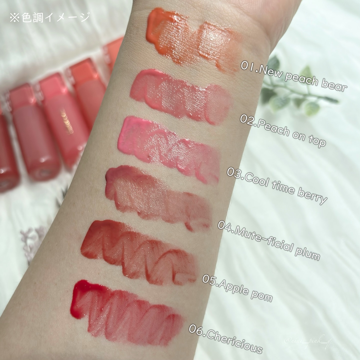 - <01 ニューピーチベア(New peach bear)> 水、リンゴ酸ジイソステアリル、ダイマージリノール酸ダイマージリノレイル、デカイソステアリン酸ポリグリセリル-10、ダイマージリノール酸ダイマージリノレイルビス(ベヘニル/イソステアリル/フィトステリル)、BG、ポリソルベート60、グリセリン、セテアレス-20、テトライソステアリン酸ペンタエリスリチル、(PEG-240/デシルテトラデセス-20/HDI)コポリマー、フェノキシエタノール、メントキシプロパンジオール、(アクリル酸ヒドロキシエチル/アクリロイルジメチルタウリンNa)コポリマー、(PPG-17/IPDI/DMPA)コポリマー、トリイソステアリン酸ポリグリセリル-2、スクワラン、カプリリルグリコール、酸化チタン、1,2-ヘキサンジオール、香料、黄5、エチルヘキシルグリセリン、プロパンジオール、赤104(1)、黄4、赤227、イソステアリン酸ソルビタン、ダイウイキョウ果実エキス、水酸化Al、ヘキシレングリコール、青1、ラウリン酸K、トコフェロール、モモ果実エキス、リンゴ果実エキス、スモモ果実エキス、イチゴ果汁 <02 ピーチオントップ(Peach On Top)> 水、リンゴ酸ジイソステアリル、ダイマージリノール酸ダイマージリノレイル、デカイソステアリン酸ポリグリセリル-10、ダイマージリノール酸ダイマージリノレイルビス(ベヘニル/イソステアリル/フィトステリル)、BG、ポリソルベート60、グリセリン、テトライソステアリン酸ペンタエリスリチル、セテアレス-20、(PEG-240/デシルテトラデセス-20/HDI)コポリマー、フェノキシエタノール、メントキシプロパンジオール、(アクリル酸ヒドロキシエチル/アクリロイルジメチルタウリンNa)コポリマー、(PPG-17/IPDI/DMPA)コポリマー、スクワラン、カプリリルグリコール、酸化チタン、トリイソステアリン酸ポリグリセリル-2、1,2-ヘキサンジオール、エチルヘキシルグリセリン、香料、プロパンジオール、赤104(1)、黄4、赤227、イソステアリン酸ソルビタン、ダイウイキョウ果実エキス、水酸化Al、ヘキシレングリコール、ラウリン酸K、トコフェロール、青1、モモ果実エキス、リンゴ果実エキス、スモモ果実エキス、イチゴ果汁 <03 クールタイムベリー(Cool Time Berry)> 水、リンゴ酸ジイソステアリル、ダイマージリノール酸ダイマージリノレイル、デカイソステアリン酸ポリグリセリル-10、ダイマージリノール酸ダイマージリノレイルビス(ベヘニル/イソステアリル/フィトステリル)、BG、ポリソルベート60、グリセリン、セテアレス-20、テトライソステアリン酸ペンタエリスリチル、(PEG-240/デシルテトラデセス-20/HDI)コポリマー、フェノキシエタノール、メントキシプロパンジオール、(アクリル酸ヒドロキシエチル/アクリロイルジメチルタウリンNa)コポリマー、(PPG-17/IPDI/DMPA)コポリマー、スクワラン、酸化チタン、カプリリルグリコール、トリイソステアリン酸ポリグリセリル-2、1,2-ヘキサンジオール、香料、エチルヘキシルグリセリン、プロパンジオール、赤104(1)、赤227、黄4、ダイウイキョウ果実エキス、イソステアリン酸ソルビタン、黄5、水酸化Al、ヘキシレングリコール、トコフェロール、ラウリン酸K、モモ果実エキス、リンゴ果実エキス、スモモ果実エキス、イチゴ果汁 <04 ミュートフィシャルプラム(Mute-Ficial Plum)> 水、リンゴ酸ジイソステアリル、デカイソステアリン酸ポリグリセリル-10、ダイマージリノール酸ダイマージリノレイル、ダイマージリノール酸ダイマージリノレイルビス(ベヘニル/イソステアリル/フィトステリル)、BG、ポリソルベート60、グリセリン、テトライソステアリン酸ペンタエリスリチル、セテアレス-20、(PEG-240/デシルテトラデセス-20/HDI)コポリマー、フェノキシエタノール、メントキシプロパンジオール、(アクリル酸ヒドロキシエチル/アクリロイルジメチルタウリンNa)コポリマー、(PPG-17/IPDI/DMPA)コポリマー、スクワラン、酸化チタン、カプリリルグリコール、トリイソステアリン酸ポリグリセリル-2、1,2-ヘキサンジオール、香料、エチルヘキシルグリセリン、プロパンジオール、黄5、赤227、黄4、酸化鉄、イソステアリン酸ソルビタン、ダイウイキョウ果実エキス、水酸化Al、青1、ヘキシレングリコール、ラウリン酸K、トコフェロール、モモ果実エキス、リンゴ果実エキス、スモモ果実エキス、イチゴ果汁 <05 アップルポム(Apple Pom)> 水、リンゴ酸ジイソステアリル、デカイソステアリン酸ポリグリセリル-10、ダイマージリノール酸ダイマージリノレイル、ダイマージリノール酸ダイマージリノレイルビス(ベヘニル/イソステアリル/フィトステリル)、BG、ポリソルベート60、グリセリン、テトライソステアリン酸ペンタエリスリチル、セテアレス-20、(PEG-240/デシルテトラデセス-20/HDI)コポリマー、トリイソステアリン酸ポリグリセリル-2、フェノキシエタノール、メントキシプロパンジオール、酸化鉄、(アクリル酸ヒドロキシエチル/アクリロイルジメチルタウリンNa)コポリマー、(PPG-17/IPDI/DMPA)コポリマー、スクワラン、酸化チタン、カプリ