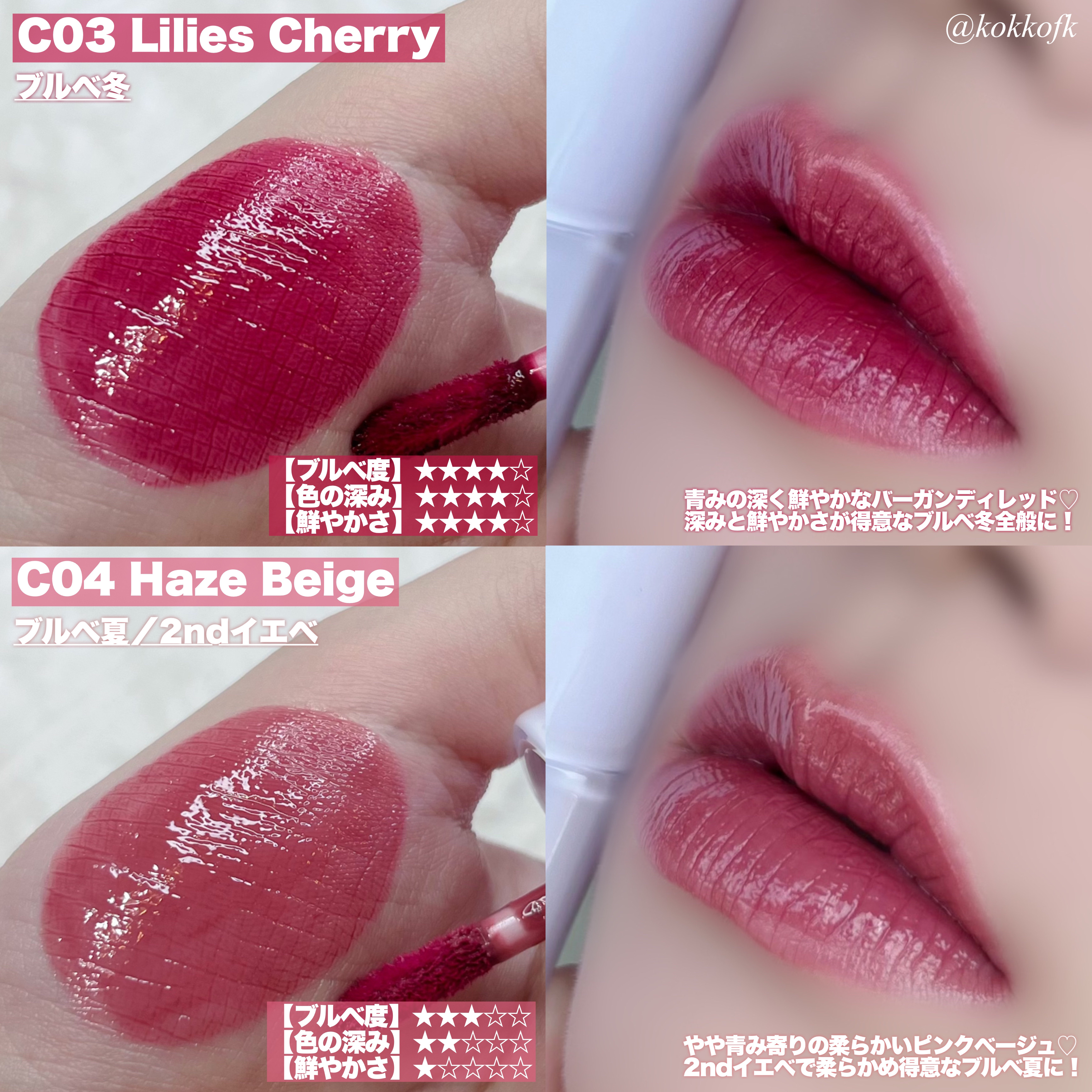 既存のジューシーラスティングティントよりさらに軽いツヤ感が魅力の新作ティント! 色選びの参考にしてね! やや黄みの明るいオレンジコーラル鮮やか得意なイエベ春におすすめ! 黄みの明るくまろやかなオレンジベージュ黄みが得意なイエベ春におすすめ! 青み黄み中間なくすみピンクベージュブルベ夏やイエベ春におすすめ 黄みの深くて鮮やかなオレンジレッド鮮やか得意なイエベ秋におすすめ! 青みの鮮やかで明るいビビッドピンク明るさ得意なブルベ冬やブルベ夏におすすめ! 青みの明るめで柔らかいローズピンクブルベ夏やブルベ冬におすすめ! 青み黄み中間な鮮やかで強いビビッドレッド2ndイエベ春のブルベ冬におすすめ! 青みの強い深くて鮮やかなベリーレッド2nd夏で鮮やか得意なブルベ冬におすすめ!