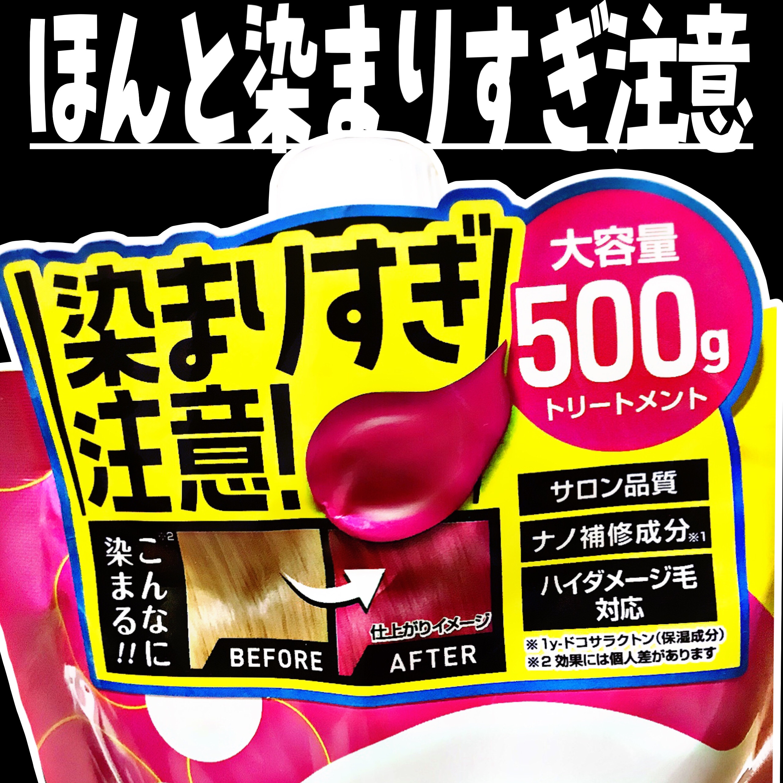 大容量で高コスパ! 最短3分で染まり、ダメージ補修成分配合のため、アルカリカラーやブリーチをしすぎて痛んだ髪にも使えます! トリートメント自体は濃いパープル。 爪等に染み込みやすいので使用時は手袋の着用をおすすめします。 極端に染まりすぎず、髪が軋む感じもなく日常的に使いやすいです✨