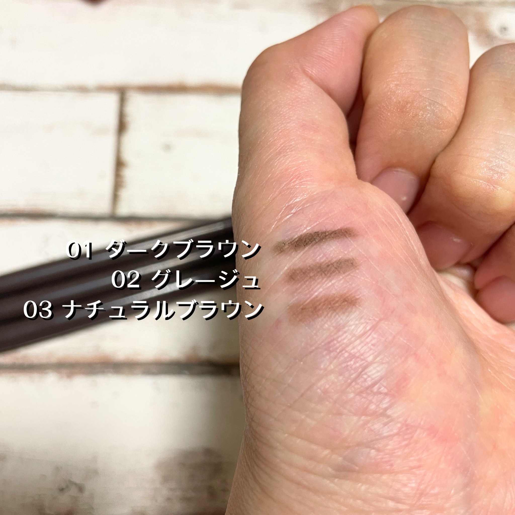 - <01 ダークブラウン> ステアリン酸、水添ヒマシ油、モクロウ、ダイマージリノール酸(フィトステリル/イソステアリル/セチル/ステアリル/べヘニル)、トリ(カプリル酸/カプリン酸)グリセリル、セスキオレイン酸ソルビタン、水酸化Al、ジメチコン、トコフェロール、スクワラン、ホホバ種子油、(+/-)酸化鉄、酸化チタン、マイカ <02 グレージュ> ステアリン酸、水添ヒマシ油、モクロウ、ダイマージリノール酸(フィトステリル/イソステアリル/セチル/ステアリル/べヘニル)、トリ(カプリル酸/カプリン酸)グリセリル、セスキオレイン酸ソルビタン、水酸化Al、ジメチコン、トコフェロール、スクワラン、ホホバ種子油、(+/-)酸化鉄、酸化チタン、マイカ <03 ナチュラルブラウン> ステアリン酸、水添ヒマシ油、モクロウ、ダイマージリノール酸(フィトステリル/イソステアリル/セチル/ステアリル/べヘニル)、トリ(カプリル酸/カプリン酸)グリセリル、セスキオレイン酸ソルビタン、水酸化Al、ジメチコン、トコフェロール、スクワラン、ホホバ種子油、(+/-)酸化鉄、酸化チタン、マイカ <101 ピンクグレージュ> ステアリン酸、水添ヒマシ油、モクロウ、ダイマージリノール酸(フィトステリル/イソステアリル/セチル/ステアリル/べヘニル)、トリ(カプリル酸/カプリン酸)グリセリル、セスキオレイン酸ソルビタン、水酸化Al、ジメチコン、トコフェロール、スクワラン、ホホバ種子油、(+/-)酸化鉄、酸化チタン、マイカ